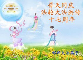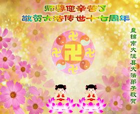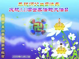 5月13日到来之际,全世界大法弟子同心同贺法轮大法日!恭敬慈悲伟大的师尊华诞!祝贺法轮大法洪传十七周年!在这个伟大而辉煌的日子到来之际,每个弟子心中无法表达对师尊的无限崇敬,感恩师父的慈悲苦度。正法经历了十七年的风风雨雨,大陆大法弟子非常想念师父,曾有过“连宵风雨不须愁”(洪吟)的艰难岁月,也有过圆满随师还的企盼。在大法修炼和讲清真相的过程中,我们渐渐明确了生命存在的真实意义。生生世世的轮回中,能够有缘随师正法,真正是无比的幸运。在剩下的日子里,我们决心更加精進,更加平稳,坚定正念,做好三件事,抓紧一切机会救度众生,无愧于师父的慈悲苦度。最后祝慈悲伟大的师父生日快乐!吉祥如意! 山西大同大法弟子 2009年5月