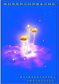 师父您好!越来越感觉到在师父洪大的慈悲中,自己是多么的渺小,有许多地方还做的不够好,在最后的时间中还要把三件事做的更好。能被师父救度,成为大法一粒子,是多么的荣幸!谢谢师父的慈悲苦度! 四川绵阳全体大法弟子恭祝师尊生日快乐!