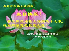 在师父的慈悲呵护下,我们坚定的走到今天,我们将一如既往的做好三件事,跟随师父回家。 河北张家口机关公务员大法弟子恭贺 二零零九年五月九日 大连弟子祝师尊生日快乐!