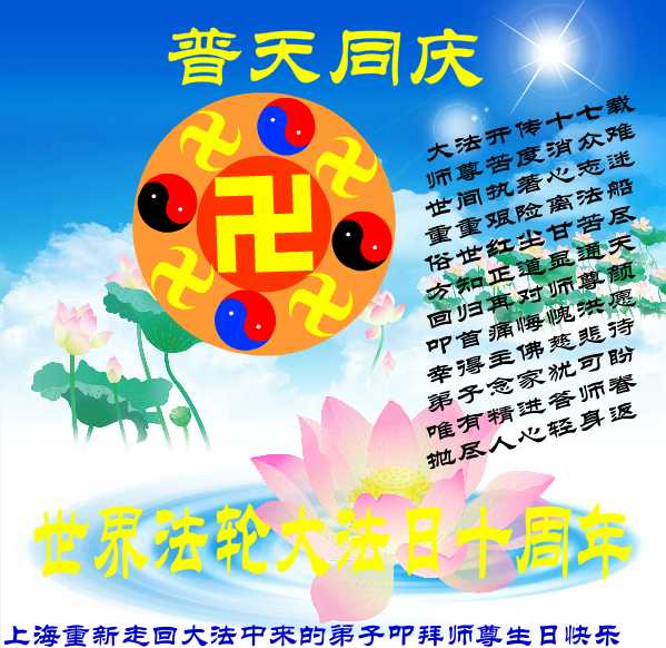 长河奔腾不息兮,话尽沧桑 尘世轮回不醒兮,尝尽悲凉 恩师慈悲眷顾兮,缘结迷茫 沐法光归路上兮,回天有望 败物压向世间兮,天地无光 惜众生只身挡兮,弟子无恙 力回天灭邪恶兮,寰宇重光 随师正法救众兮,四海洪扬 念恩师逢华诞兮,弟子遥望 泪滂沱再叩首兮,心神驰往 报师恩惟精進兮,勿负众望 盼师归普天同庆兮,天地同向 恭祝慈悲伟大的师尊华诞 祝贺世界法轮大法日 成都大法弟子敬上 己丑年四月初八 观看录像(MPG) 大庆大法弟子恭祝师尊华诞快乐!