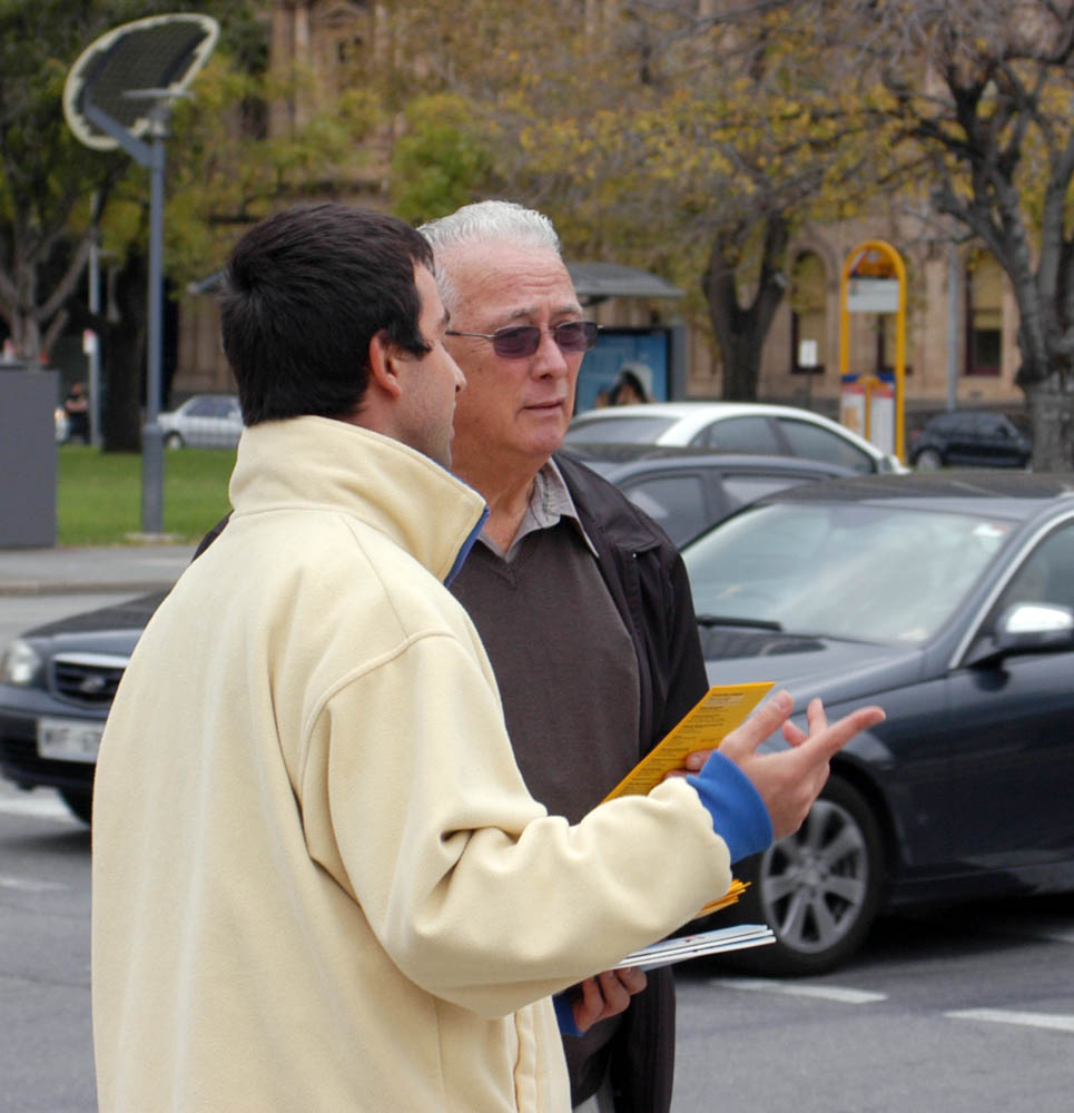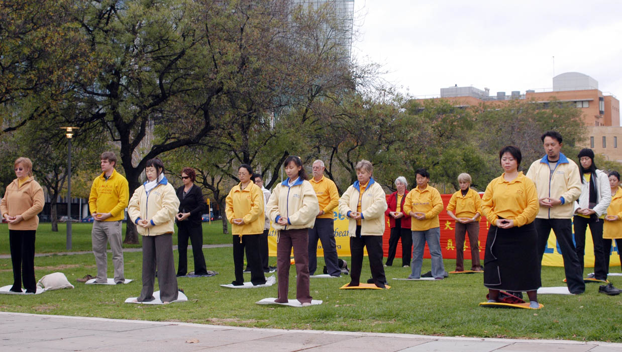二零零九年五月九日,南澳法轮功学员在州府阿德雷得市中心的维多利亚广场上举行活动,向人们介绍什么是法轮大法,并揭露中共对法轮功修炼者的残酷迫害。学员们的集体炼功,动作整齐美观,吸引不少路人驻足观看或询问详情。学员们向路人发放资料,讲述修炼大法的美好,揭露在中国法轮功学员无辜受中共迫害的真相。路人和游客了解了法轮功真相,不少有缘者想要学习功法,华人明真相后纷纷三退(退出中共党、团、队),谴责中共的暴行。 一位越南女学生被炼功场面吸引,径自加入队伍,感受祥和的能量场。她说她信佛,刚到南澳,今天看到法轮功展示的佛家修炼功法觉得很好,希望能常常参加。 祥和的炼功场面还吸引了一些到对面广场参加佛教庆祝活动的人过来观看。一位信佛的中年先生夸一位年轻高大的男学员慈眉善目,总是乐呵呵的样子,主动跟他攀谈起来,交流很长时间,探讨他自己打坐为什么不能入静,还询问这个功法为什么叫法轮功。学员拿出《转法轮》书给他仔细介绍,并递给他简介,请他上网阅读《转法轮》,那位先生高兴地说,一定看。 一位从中国国内刚来澳不久的中年男子坐在广场的长椅上观看很久,学员走过去跟他打招呼。他问:“法轮功在这搞活动没人管?”学员告诉他,活动是经政府部门批准的,受法律保护。现在除了中共反对法轮功,全世界已经有一百个国家和地区在洪传法轮大法;法轮大法的书已经被翻译成三十八种文字;各国政府、组织给法轮功颁发的褒奖上千项。就是在中国大陆,打压法轮功也不得人心,通过法轮功学员的讲真相,不少警察也开始觉醒,选择不参与迫害,有的还公开站出来揭露中共。学员给他举了陈用林和郝凤军的例子,这位男士表示以前没听说过。学员给他讲《九评共产党》和“三退”(退出中共党、团、队)大潮,他很愿意听。 学员还告诉他,其实,中共迫害的不只是法轮功学员,全中国的人都是受害者。这么好的功法一九九九年就有一亿人炼,而迫害使很多人失去了了解和选择修炼大法的机会,铺天盖地的谎言也欺骗和毒害了中国民众。这场迫害一定要被制止。既然来到了自由社会,不妨多听多看多思考,才对得起自己。那位男士点头称是,道谢后离去。