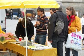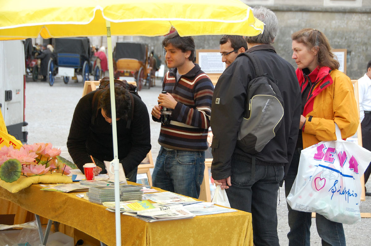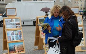 【明慧网二零零九年五月三十一日】(明慧记者郑晴萨尔斯堡报导)二零零九年五月三十日至六月一日,是奥地利萨尔斯堡的五荀节(PFINGSTEN)庆祝日,在这期间,奥地利部份法轮功学员在市中心的老城(Residenzplatz)举行活动,传播法轮功真相,揭露中共迫害法轮功学员的残酷暴行。 奥地利部份法轮功学员在五荀节庆祝日期间,在市中心摆放真相图片展,并讲真相;前来观看和了解真相的民众络绎不绝。 |