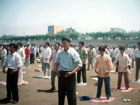 1998年6月14日,在莱西体育场展开的大型集体炼功弘法活动。 |