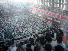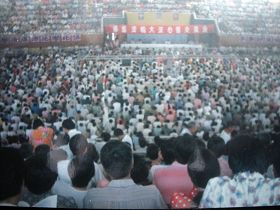 1998年8月30日,在莱西体育馆内举办的四千五百人的法轮大法修炼心得交流会。 |