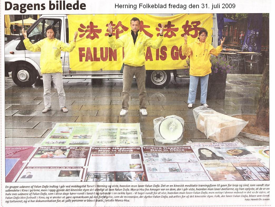 继奥登塞、菲英岛最大的报纸《菲英时报》(Fyens Stiftstidende)报道之后,七月三十一日,位于日德兰半岛中部的城市Herning地方报纸Herning Folkeblad报道了相关消息,并刊登了大幅照片。 文中写道:法轮大法修炼者组成的一个小组,昨天中午来到Herning城市的广场,展示法轮大法的五套功法。这是一种中国的打坐修炼的功法,有益于身体和精神的健康。在九十年代,法轮大法在中国迅速发展。但是在九九年,中国(共)当局禁止人们炼法轮功。 家住Amager的马可•徐(Marco Hsu)是这些炼功人中的一个,他告诉记者:“我们这些天开汽车巡回丹麦的多个城市,向人们演示法轮大法。而且七月正好是法轮大法在中国被迫害十年整。我们希望人们关注这场中共政权对法轮大法修炼者的迫害。(在中国)法轮功学员被抓进监狱和施以酷刑。我们有证据证实,至少有三千二百八十七名法轮功学员被杀害。”