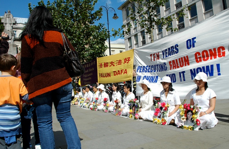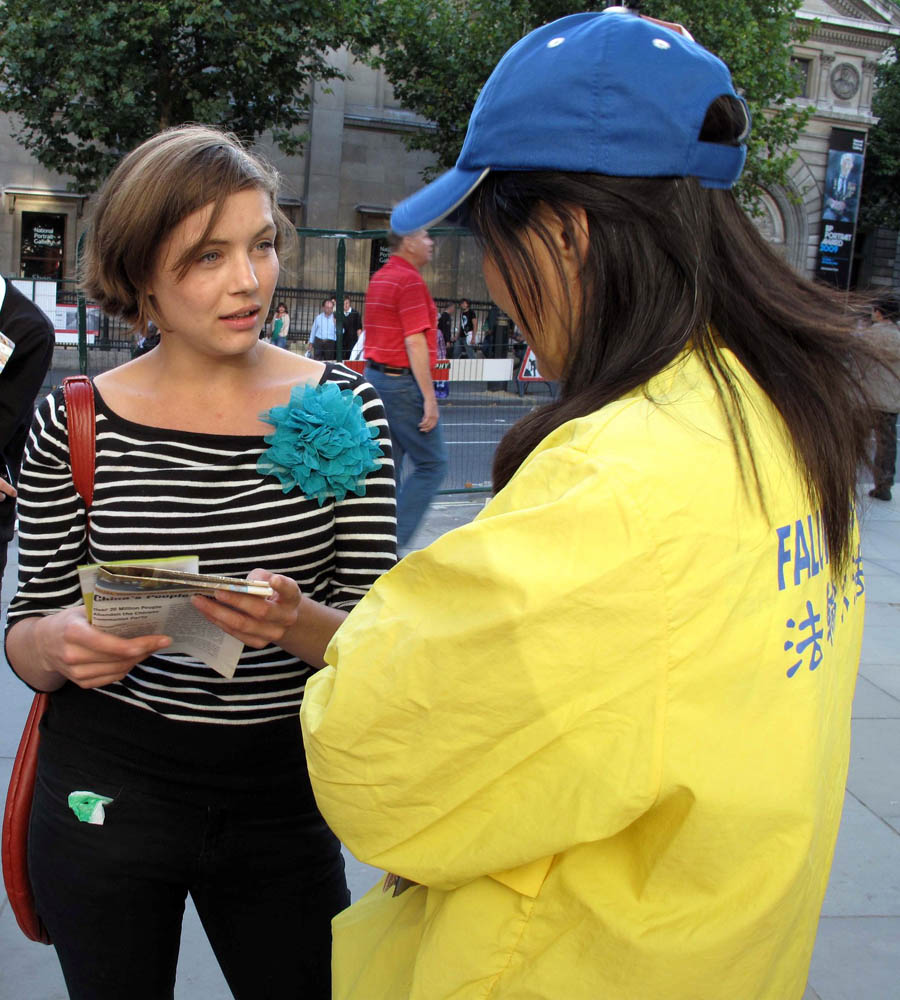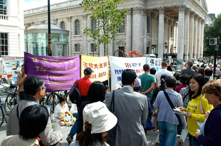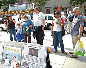 在圣马丁广场,人们关注法轮功学员的呼声 |