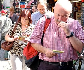 路人认真阅读法轮功真相传单 |
