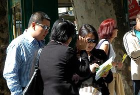 游行队伍来到唐人街,“普度”乐曲如同一股清流流进喧嚣的街道,从两旁的人的表情可以看出,面对法轮功真相信息,华人和西方人同样受到洗涤和震撼。另外,记者观察到游行队伍第二次走进唐人街时,接过法轮功真相传单并开始认真思索的人明显增多。 队伍结束游行后,一些法轮功学员继续在紧靠鸽子广场的圣马丁小广场上讲真相。与以往一样,学员打出横幅、摆设好真相展板,有的进行功法展示,有的持续发放法轮功真相报纸、资料和传单,还有学员面对面深入讲真相并鼓励人们在反迫害征签表上签字。  在圣马丁广场,人们驻足观看法轮功真相展板 |