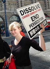 二十九日,法轮功学员的活动包括在伦敦市中心及唐人街地带的游行,以及在圣马丁小广场和唐人街中心搭设信息台讲真相等。游行队伍从中共伦敦使馆前出发,经过伦敦最繁华的商业街,进入唐人街并绕行两周,最后到达圣马丁小广场。 伴着庄严慈悲的“普度”乐曲一路前行的游行队伍引起路人的关注。无数关切的目光,投向身着白衣的法轮功女学员手持的被迫害致死的中国大陆同修的照片,也投向游行队伍打出的系列中英文横幅和标语:“法轮大法好”、“世界需要真善忍”、“停止迫害法轮功”、“对法轮功的迫害已经十年,立即停止迫害”、“声援五千九百万中国人退出中共恶党”以及“解体中共 制止迫害”等。 一路上,很多人接过学员沿途发放的法轮功真相传单,随即迫不及待地阅读起来。阅读时他们的目光往往变得很凝重。 一个西人女孩在观看游行队伍经过后,立即走近队伍,向走在后面的学员了解详情。周围的学员给她真相传单,并为她简单讲了法轮功真相并告诉她游行的缘由。一听到这儿,女孩儿立即表示她希望能够加入游行队伍,并真的跟着游行队伍一直走到唐人街。 在随后的沿途交流中,女孩儿告诉学员,她叫波娃,来自波兰,在英国学习英国文学。她表示这是她第一次听说法轮功,但她完全相信法轮功学员所讲述的真相信息,因为她从自己国家的历史中清楚的了解了共产党的暴力本性。“庆幸的是在波兰年轻一代人已抛弃了共产党。”波娃说。 波娃告诉学员,最近一个时期她听到了不少有关中共践踏人权的信息,她正考虑为此做点儿什么,就碰到了今天的法轮功游行。 游行队伍到达唐人街后,波娃又马上到法轮功真相信息台前进一步了解法轮功,表示要去摄政公园义务教功点学法轮功。  波娃主动加入法轮功游行队伍 |
