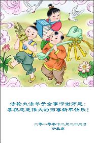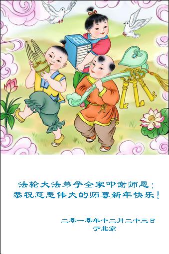 弟子们决不辜负师父的慈悲苦度!决心在新的一年里,加紧修好自己,追上正法進程,证实好法,多多救人,以更大的成绩回报师尊! 2010年12月28日 天津武清农村大法弟子祝师尊新年快乐!