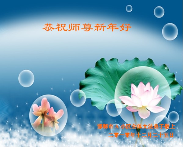 恭祝慈悲伟大的师尊元旦快乐! 新天新地新岁临 亿万弟子叩师尊 师恩洪大难言表 消去罪业净身心 正法路上紧随师 千难万险不移志 助师正法三件事 三件做好慰恩师 慈悲浩荡师恩洪 广结善缘救众生 大法圣徒讲真相 明白真相得新生 正法洪势扫寰宇 无量寰宇得归正 慈悲救度千万亿 洪微处处颂洪恩 邢台市一资料点大法弟子 二零一零年十二月二十五日。 邯郸市邯山区全体大法弟子恭祝师父新年快乐!