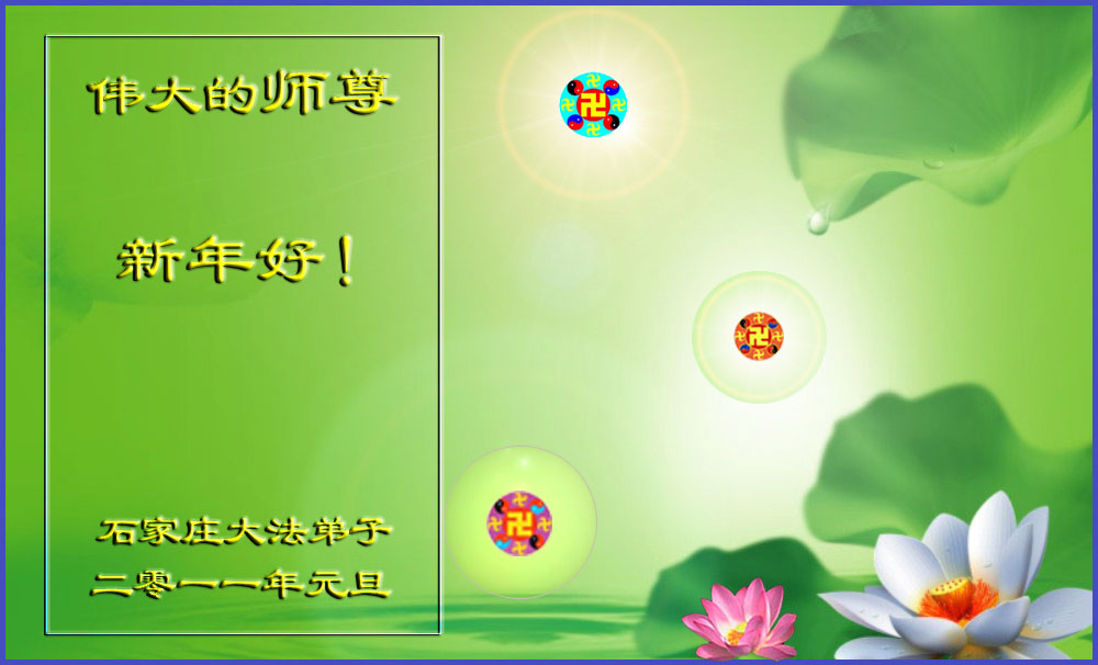 在新的一年到来之际,我们全体石家庄大法弟子想念师父!请师父放心,无论在任何环境、任何情况下,我们都坚信师父,坚信大法,正念清除邪恶,力排万难、广传福音,利用多种形式讲清真相,解救世人于危难之中,救度所有有缘人,兑现我们来世的宏愿。 恩师颂 恩师传大法 福泽苍宇间 慈悲来普度 乾坤齐颂赞 真相世间传 福德大无边 世人明真相 感恩上法船 全体石家庄大法弟子 二零一零年十二月二十八日 北京市海淀区北太平庄地区大法弟子恭祝慈悲伟大的师尊元旦快乐!