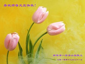 真心祝愿师父新年快乐!在大法慈悲的佛光普照下,我要做好三件事,实修自己,不辜负伟大师父的慈悲苦度。 河北涿州一学法小组全体大法弟子祝师尊新年快乐!