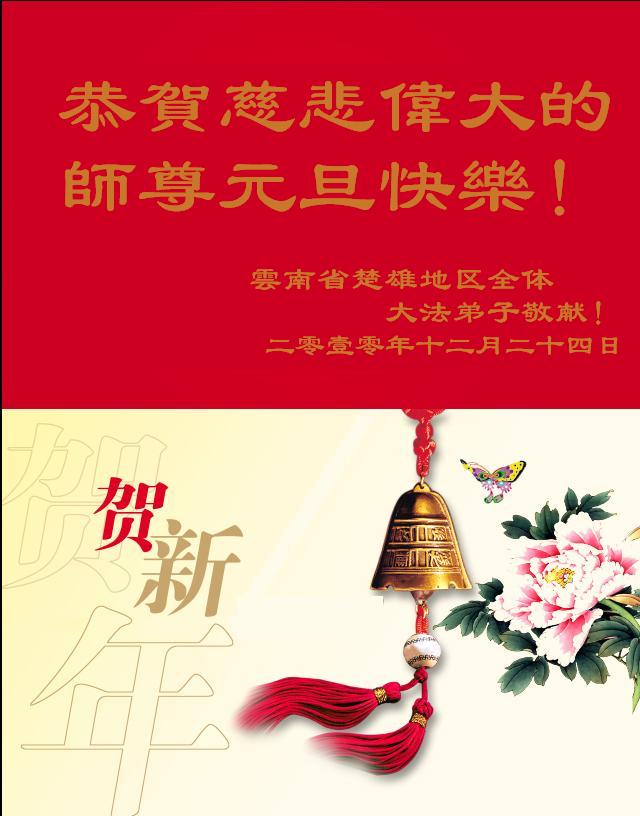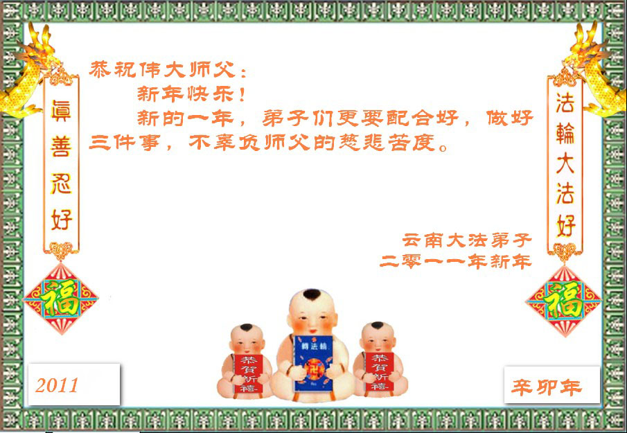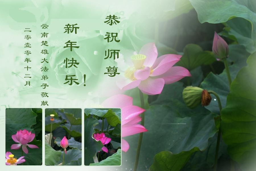 二零一一年新年到来了,全体弟子无比想念伟大的师尊,请师尊放心,弟子们已经成熟起来了,对大法,对修炼,对讲真相救度众生,有了全新的认识,一定不辱使命,兑现自己的史前大愿,做好三件事,不辜负正法时期大法弟子的称号。 云南青年大法弟子恭祝师尊新年好!