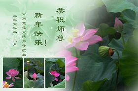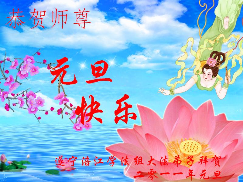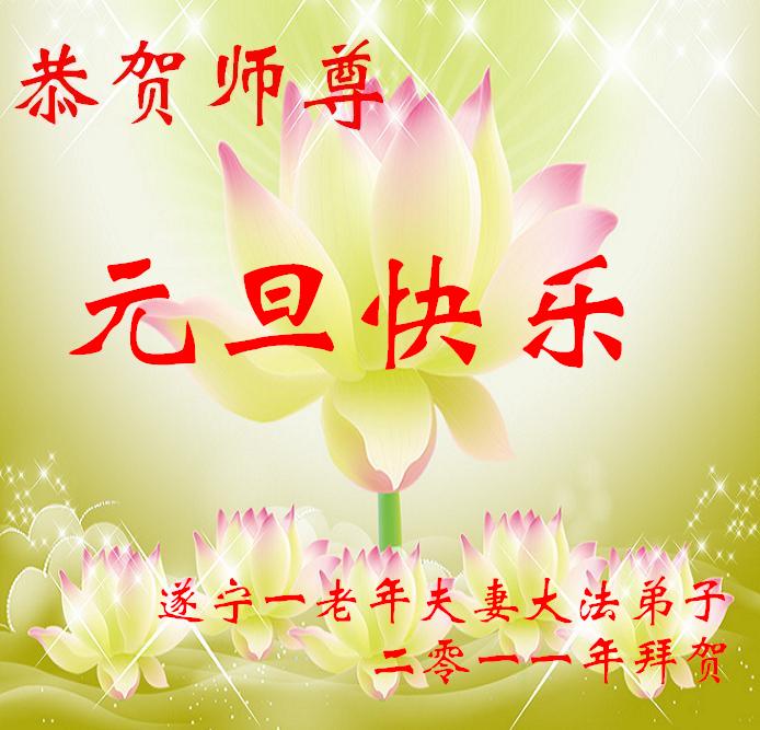 向慈悲伟大的师父道一声谢谢!谢谢您!师父!我们以后要更加珍惜与师尊同在的时光,助师父正法,努力做好三件事,完成自己的史前誓约,跟师父回家。 遂宁小河学法小组全体大法弟子敬候 二零一一年元旦 四川省成都地区一大法弟子恭祝慈悲伟大的师父元旦快乐!