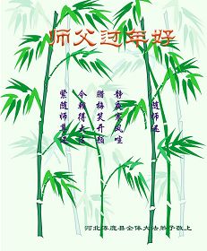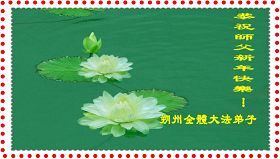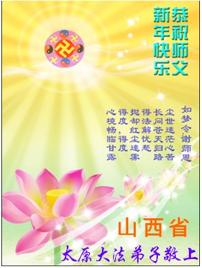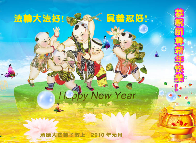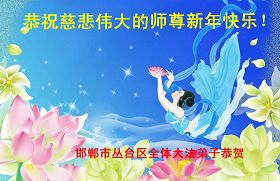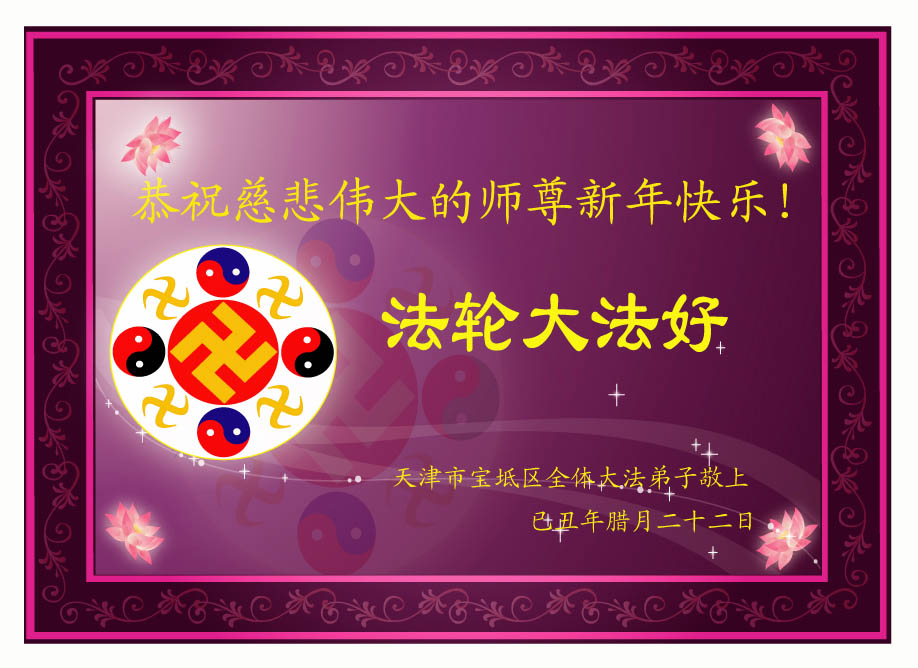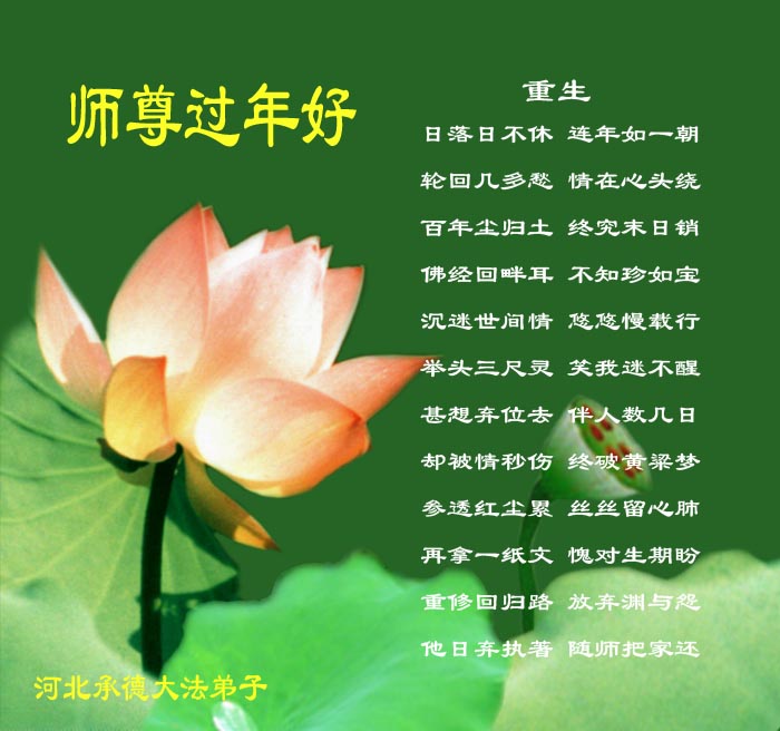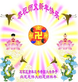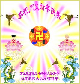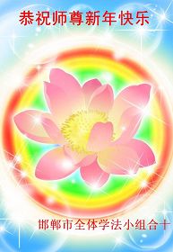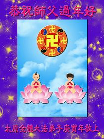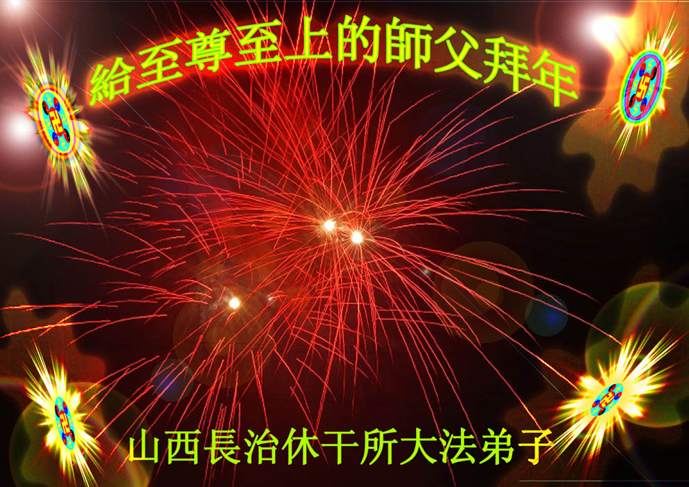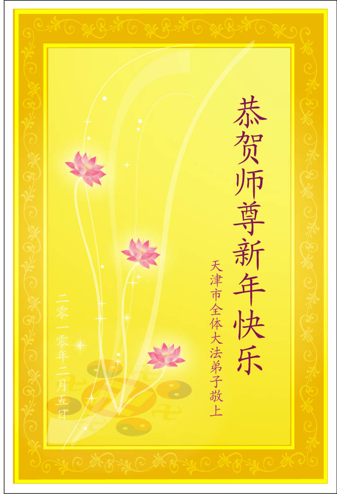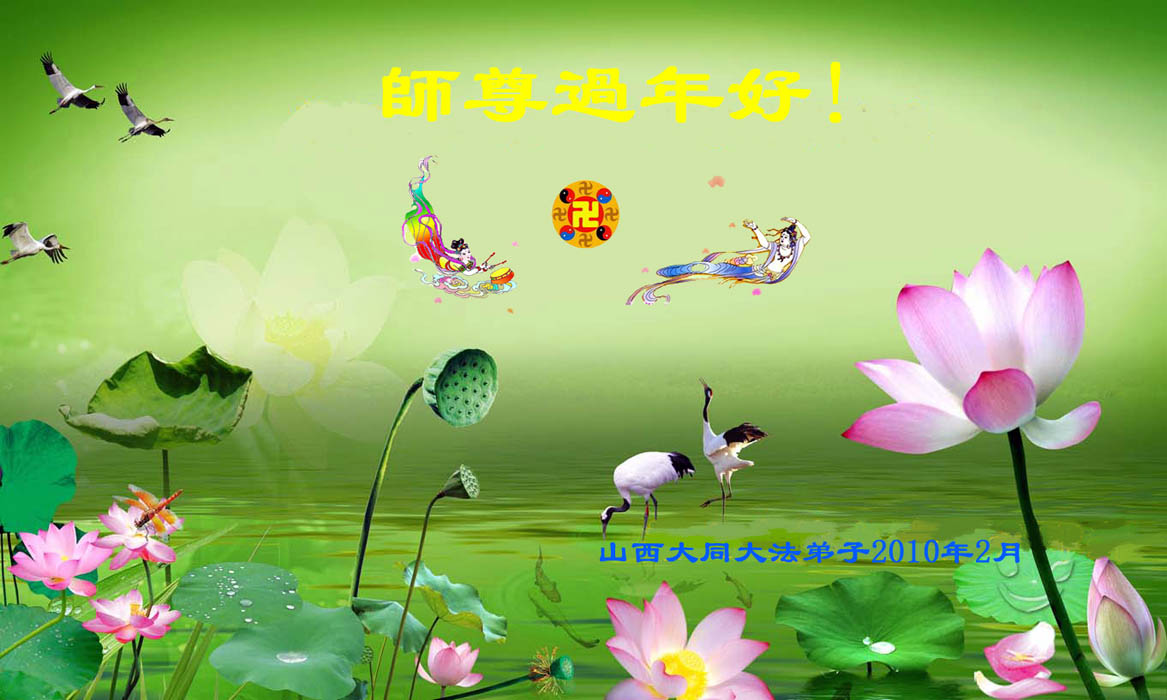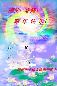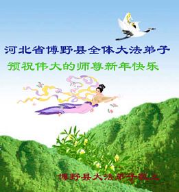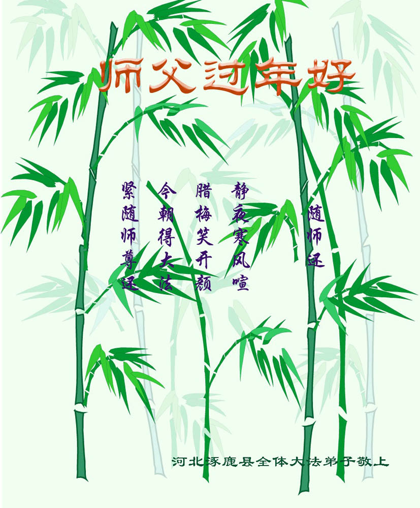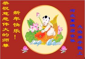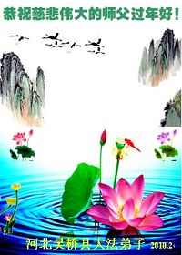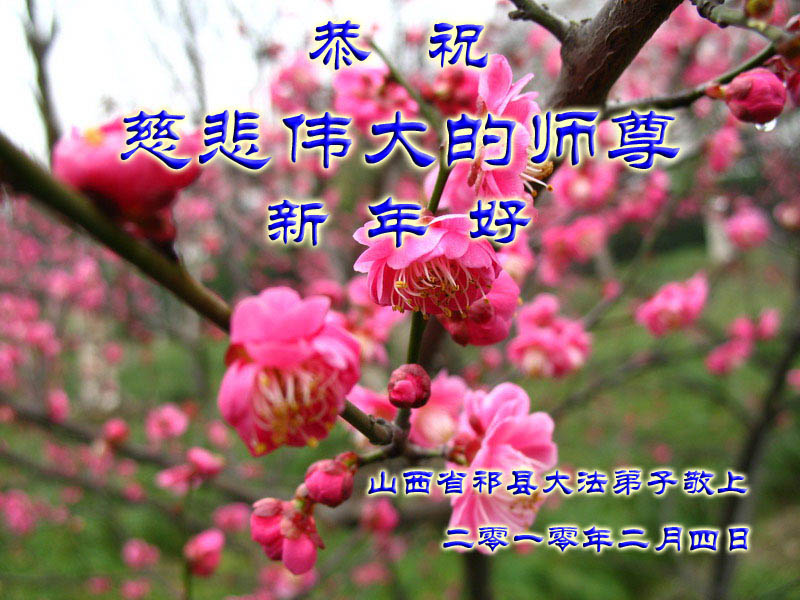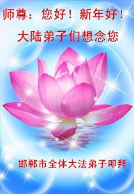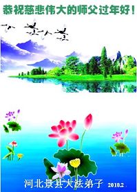 【明慧网二零一零年二月十三日】北京大法弟子、鞍山大法弟子恭祝伟大的师尊过年好!山西省祁县大法弟子恭祝慈悲伟大的师尊新年好!祁县大法弟子在救度众生的神圣使命中共同做好大法弟子应做到的三件大事,完成好自己救度众生的责任,走好最后的路,跟师父回家。 山西省祁县大法弟子敬上 二零一零年二月四日 保定大法弟子给师尊拜年!师尊过年好!我们一定跟师尊走好最后的路! 山西大同大法弟子恭祝师尊过年好!河北吴桥县大法弟子恭祝师尊过年好!河北高碑店全体大法弟子恭祝慈悲伟大的师尊新年快乐!北京东城、怀柔大法弟子祝伟大的师尊新年快乐!北京昌平区、海淀区、丰台区、大兴区大法弟子给师尊拜年!北京市丰台区全体大法弟子祝师尊新年快乐!河北省唐县全体大法弟子祝福慈悲伟大的师尊过年好!拜师尊 大法弟子拜师尊 心潮澎湃泪滚滚 感恩师尊慈悲度 感恩师尊下凡尘 大法弟子拜师尊 明析不足再精進 兑现来世洪誓愿 返本归真随师还 大法弟子拜师尊 比学比修整体存 唯愿师尊开口笑 唯愿师尊少操劳 河北省博野县全体大法弟子祝师尊新年快乐!十月以前,博野县遭到邪恶的疯狂迫害,多名协调人被抓,资料点被破坏,几乎处于瘫痪状态。弟子们向内找,察找漏洞整体配合,走出困境,建立多个资料点,人人是协调人。请师父放心,博野县大法弟子一定不让师父失望,走好自己的修炼道路。 新年愿 冬去春来是新年,众徒常把师尊念。 慈悲救度恩似海,师恩难忘刻心间。 邪恶迫害又一年,魔难之中心更坚。 察找漏洞放执着,不等不靠不怕难。 法徒签下誓约愿,助师正法重任担。 学法修心遵师语,救度众生不等闲。 弟子们等众生盼,法正人间新宇欢。 法徒齐登神佛位,普天同庆随师还。 河北省宁晋县大法弟子祝师尊新年快乐!河北省全体大法弟子恭贺慈悲伟大的师父新年快乐!我们全体大法弟子给您拜年了! 祝师尊过年好!万事如意! 河北省唐山市丰南区大法弟子恭祝慈悲伟大的师尊新年快乐!河北鹿泉市大法弟子恭祝慈悲伟大的师尊新年好!北京市良乡真修大法弟子向慈悲伟大的师父拜年!祝师父过年好!山西临汾县市区全体大法弟子恭祝师尊新春快乐!师尊辛苦了!在最后有限的关键时刻,我们一定做好三件事,不负师尊救度之恩。 保定全体大法弟子叩拜慈悲伟大的师尊新年快乐!恭祝师尊新年好!大法徒向尊师拜年 新年来到添正念 亿万弟子谢师恩 众徒给您来拜年 一拜恩师慈悲怀 二拜恩师赐真经 三拜恩师启本性 四拜恩师常鼓励 五拜恩师开智慧 六拜恩师苦心护 七拜恩师赐神通 八拜恩师给所有 九拜恩师常叮咛 三件事情铸新魂 救度众生要抓紧 修炼路上要走正 正念正行负使命 千言万语难谢恩 洪恩重来胜苍宇 只有跪拜表寸心 师恩放心再放心 助师正法是本份 修好自身救众生 除尽邪恶救苍生 神的路上留神威 普天同庆谢师恩 保定定兴大法弟子 北京丰台大法弟子恭祝师尊新年快乐!大法弟子们决不辜负师父的殷切期望,堂堂正正走好自己修炼之路,完成自己的史前大愿。请师父放心。 北京来美探亲的一位老年弟子携妻子及俩女俩婿俩外孙〈女〉叩拜师尊!全家共祝师尊新春愉快!牛去虎来又一春, 助师正法急救人, 哪管霾雾狂风舞, 只记师尊教诲心。 时日紧急怎怠慢, 多向内找再精進, 佳节全家齐叩首, 谢师唯有再上阵。 二零一零年二月三日暨牛尾虎初 北京大法弟子学法小组恭祝师尊新年快乐!谢谢师尊慈悲救度!在新的一年里,我们会更加努力做好三件事,完成我们的誓约,圆满随师还! 合十 北京大法弟子学法小组 2010年2月10日 北京市光彩体育馆炼功点大法弟子恭祝师尊过年好!在新的一年里我们会更加精進,做好三件事,完成自己的历史使命,不辜负师父的慈悲苦度!弟子盼师父早日回国! 北京大法弟子 2010年2月2日 北京怀柔大法弟子敬祝伟大的师尊新春快乐!并致崇高诚挚的叩拜!河北涞水全体大法弟子给伟大慈悲的师父拜年!在大法指引下我们会做好大法弟子该做的事,请师父放心。 涞水全体大法弟子敬上。 北京市通州区一大法弟子祝师父新年快乐!祝贺师父 我没见过师父,但是非常想念师父!按照师父讲的法理以法为师做好三件事,修好自己。 北京市密云县全体大法弟子向慈悲伟大的师尊拜年:恭祝师尊新年好!保定定兴北河全体大法弟子祝慈悲伟大的师尊新年快乐!师尊新年好!您为弟子做了这么多,弟子用语言难以表达感激之恩,只有努力做好三件事以表寸心。我代表保定定兴北河全体大法弟子向您致以崇高的合十叩谢! 唐山市古冶区全体大法弟子敬拜师尊新年快乐!师尊辛苦了!我们一定不辜负师尊的期望,精進实修,整体提高,整体升华,跟师尊回家。 河北唐山古冶区一四口之家遥祝师尊新年快乐!石家庄全体大法弟子恭祝师父新年好!北京大法弟子给师父拜年!感谢师尊救度之恩!我们会坚持做好三件事,在修炼的路上勇猛精進,兑现史前洪愿。 河北承德大法弟子给师父拜年!感谢师尊使我们成为更新的生命!我们将继续走正修炼的路,修心断欲去执着,正念铲除邪恶,慈悲救度众生,不辜负正法时期大法弟子的称号。 河北南大港大法弟子恭祝慈悲伟大的师尊新年快乐!天津市全体大法弟子向苦度我们的伟大师尊拜年!我们遥向美国的方向给师尊磕头了。北京右外大法弟子给恩师拜年!北京崇文区大法弟子给恩师拜年!北京方庄大法弟