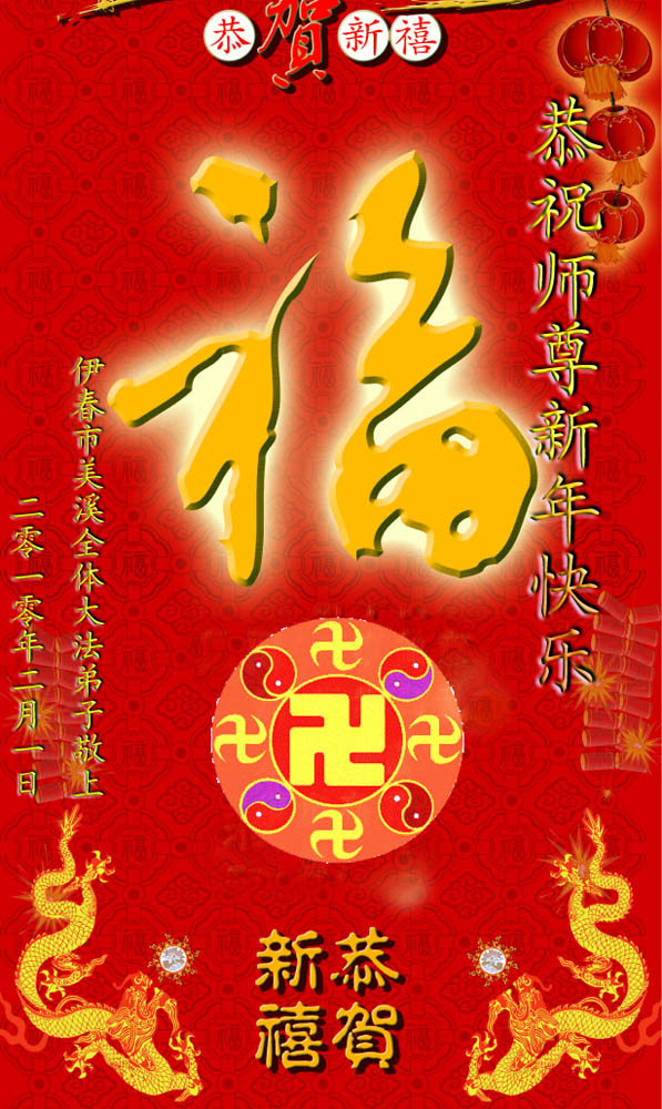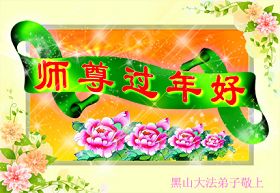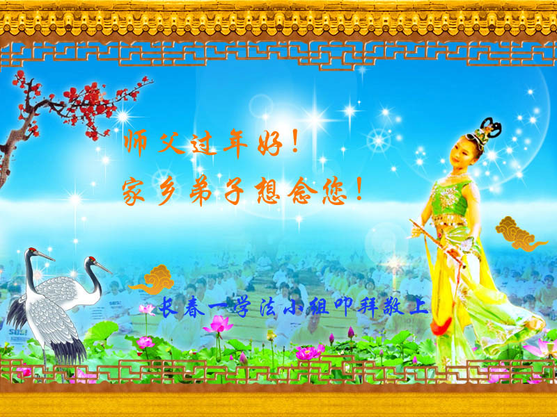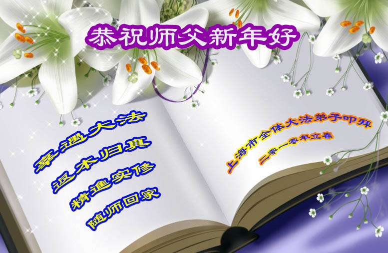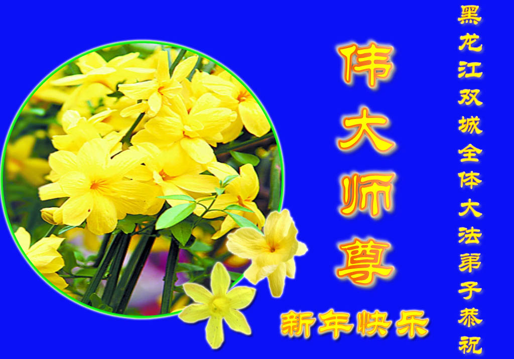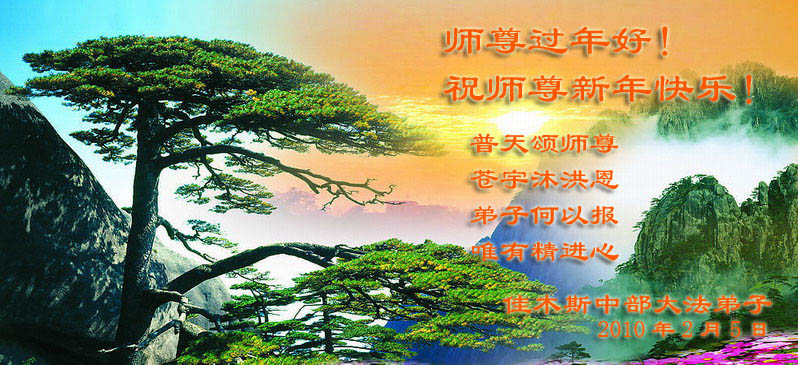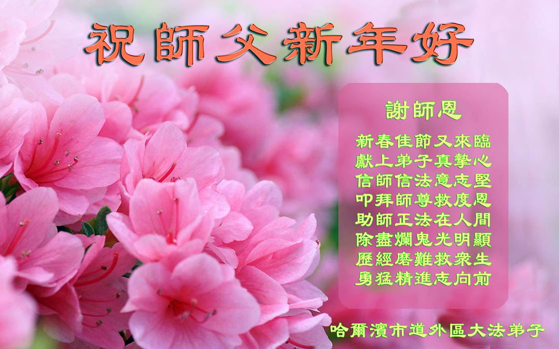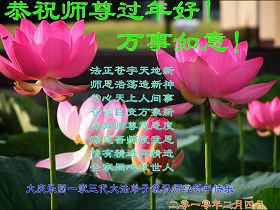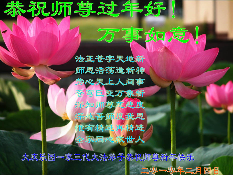 【明慧网二零一零年二月十三日】黑龙江双城全体大法弟子恭祝伟大师尊新年快乐!哈尔滨市道外区大法弟子祝师父新年好!谢师恩 新春佳节又来临 献上弟子真挚心 信师信法意志坚 叩拜师尊救度恩 助师正法在人间 除尽烂鬼光明显 历经魔难救众生 勇猛精進志向前 哈尔滨市道外区大法弟子 上海市全体大法弟子向师父问新年好!上海普陀区浦东新区恭祝慈悲伟大的师尊新年好!长春一学法小组大法弟子想念师父!祝师父过年好!江苏南通大法弟子祝师父新年好!潍坊大法弟子恭祝师尊新年快乐!我们潍坊全体大法弟子,一定在新的一年里发挥整体力量,走好最后正法修炼的路,救度更 多的众生,圆满随师还。恭祝师尊新年好! 潍坊大法弟子敬贺 2010年2月1日 山东蓬莱全体大法弟子祝师父过年好!黑龙江省前进镇大法弟子向师父问新年好!辽宁东港全体大法弟子向师父问新年好!辽宁黑山全体大法弟子向师父问新年好!大庆乐园一家三代大法弟子祝师尊新年快乐辽宁盘锦市大洼县大法弟子祝师尊新年快乐辽宁盘锦市兴隆台区大法弟子祝师尊新年快乐黑龙江省建三江七星农场大法弟子祝师尊新年快乐佳木斯姐弟俩大法弟子恭祝尊敬伟大的师尊新年快乐!佳木斯中部大法弟子祝师尊新年快乐!山东鄄城大法弟子叩拜师尊!恭祝师尊新年快乐!弟子替得救的众生谢谢师尊!浙江临海市全体大法弟子恭祝慈悲伟大的师尊新年好!请师尊放心,我们一定会踏踏实实的做好三件事,记住师尊“修炼如初,必成正果”的教诲,让师尊多一份欣慰,少一份操心。 伊春市美溪全体大法弟子恭祝师尊新年快乐!黑龙江绥化垦区各农场大法弟子给师父拜年!宝清县全体大法弟子恭祝师尊过年好!安徽省合肥市全体大法弟子祝师父过年好!师尊传大法,度众回真家。 历尽万魔拦,辛苦走天涯。 十年消恶急,四海播莲花。 新宇春将到,洪恩耀彩霞。 安徽省肥西县全体大法弟子恭祝师尊过年好!通化市学法小组:叩拜师尊过年好!恭祝师尊新年快乐!溶于法中 学法小组暖容容 圆容师尊之所要 修炼法宝向内找 心性升华去执著 同修如镜看自己 慈悲宽容去妒嫉 俩俩配合讲真相 救度众生抢时间 学法救人发正念 完成誓约随师还 二零一零年二月三日 济南大法弟子恭祝师尊过年好!辽宁省鞍山市全体大法弟子恭祝慈悲伟大的师尊新年快乐!长春大法弟子祝贺师尊新年快乐! 抚顺市母女二人叩拜伟大的师尊新年好!大连市金州区大法弟子及家属祝师尊过年好!乳山全体大法弟子及朋友恭贺李洪志大师新年好!师父您辛苦了! 您对弟子的慈悲苦度,弟子们无以回报。 乳山全体大法弟子决心在新的一年里,多学法,修好自己,放下自我,坚定实修,形成一个圆容不破的整体。努力做好三件事,助师正法,完成大法弟子的历史使命,决不辜负师父的慈悲苦度。 乳山大法弟子未修炼的亲人及身边未修炼的邻居朋友23人恭贺李洪志大师新年好! 吉林市全体大法弟子恭祝师尊过年好!辽宁海城全体大法弟子恭祝慈悲伟大的师尊过年快乐!在新的一年里,我们一定不辜负师尊的浩荡慈悲,不辜负正法修炼的万古机缘,坚定正念,坚持实修。加倍努力做好三件事,救度更多的众生,完成我们的史前誓约。 正念正行 忍苦兑誓约,邪魔阻归步。 心中明天机,脚下路自通。 慈念清乾坤,净行正法路。 莲笑叩师恩,法船众生度。 辽宁海城全体大法弟子庚寅年新春敬上 公主岭全体大法弟子在虎年来临之际,向伟大的师尊道一声:师父您辛苦了,师父虎年吉祥!时光飞逝如穿梭,踏平险恶去执著。 唯愿师尊少操劳,坚定实修苦中乐。 万古洪愿今生了,法船悠悠鸣声迫。 紧随师尊正大法,他日回家定有我。 山东乐陵一家三口大法弟子向慈悲伟大的师尊问好!我是山东乐陵大法弟子,在 二零一零年新年到来之际,我们一家三口向慈悲伟大的师尊问好!跪拜师尊,在新的一年里我一定要做好三件事,让师尊多一份欣慰,少一份操劳。 大连大法弟子恭祝伟大的师父过年好!随师下凡到人间, 千年轮回等今天; 珍惜机缘忙救度, 不负众望誓约现。 大连大法弟子己丑年腊月初七敬上 山东陵县全体大法弟子向伟大的师尊问候新年好!在2010年新年即将到来之际,山东陵县全体大法弟子向伟大的师尊问候! 师父辛苦了!祝师父新年快乐! 在新的一年里,弟子们牢记师父的嘱托,做好三件事,勇猛精進,不辜负师尊的期望,跟师父圆满回家. 吉林市一学法小组大法弟子祝师尊新年快乐!上海一家庭学法小组全体大法弟子祝师尊新年快乐!大连大法弟子恭祝慈悲伟大的师尊过年好!成就师尊的宏愿,助师正法;感恩师尊的慈悲救度,修好自己,救度众生;坚定的信师信法,做好三件事,圆满随师还。 合十 大连大法弟子叩拜 2010年2月3日 沈阳大法弟子全家三口给师父拜年!祝贺慈悲伟大的师父过年好!弟子们想您!吉林省浑江市老年大法弟子敬祝师父过年好!我是老年大法弟子,今年九十岁,有幸得大法,是师父给了我第二次生命,感谢恩师的慈悲苦度。 吉林省浑江市老年大法弟子敬贺 二零一零年二月一日 山东大法弟子向慈悲伟大的师尊问好!祝师尊新年愉快!安徽黄山大法弟子给师尊拜年!恭祝师尊新年好!看神州 神州转法轮,传心亿万人 善者喜得法,邪恶妒嫉生 帽子如天大,谎言编的“真” 到处乱抓捕,诬害善功民 救星被构陷,黑云欲压城 妖邪以为能,造孽罪恶深 他日善恶报,恶蟾点油灯 新宇春回日,普
