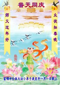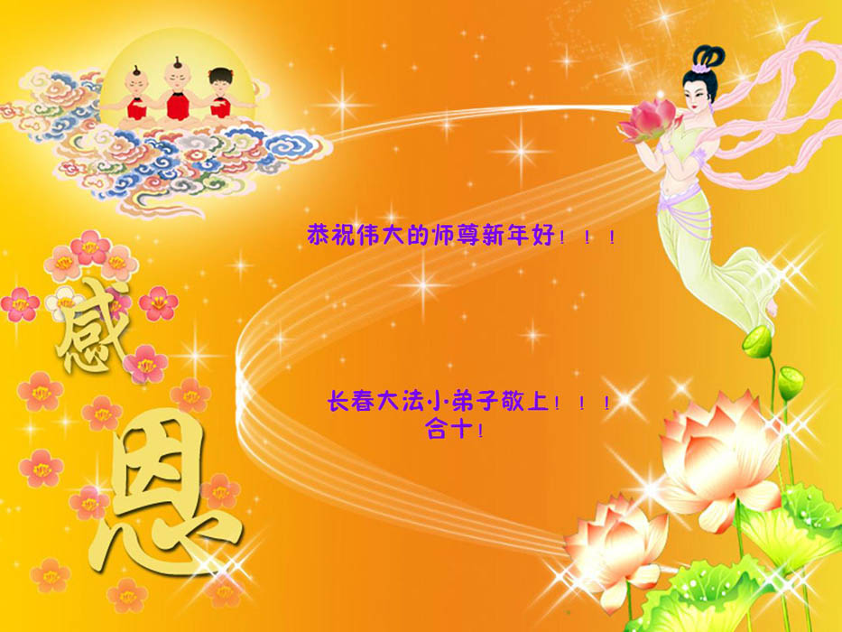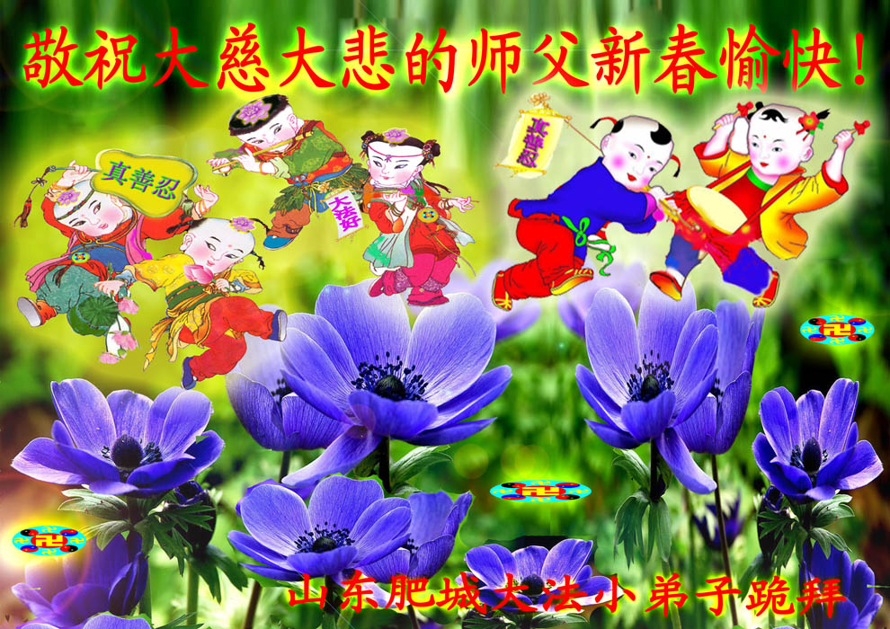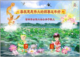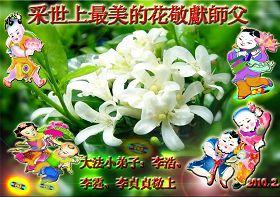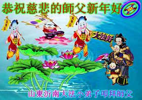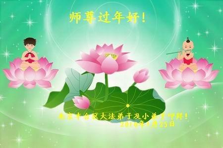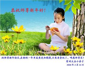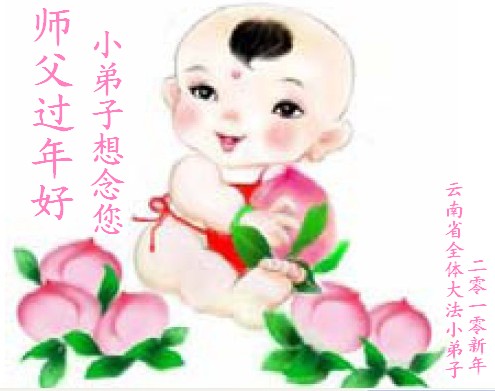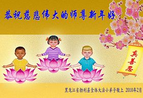 【明慧网二零一零年二月十三日】云南省全体大法小弟子恭祝师父过年好!合肥大法小弟子给师父拜年!黑龙江省勃利县全体大法小弟子恭祝慈悲伟大的师尊新年好!长春市动植物园大法小弟子恭祝慈悲伟大的师尊新年快乐!山东肥城大法小弟子跪拜师尊!给师尊拜年!弟子谢谢师父的慈悲救度!昌黎全体大法小弟子向师尊恭贺新年!四川省阆中市全体大法小弟子向师尊拜年!请师尊放心,我们一定按照师尊的教诲,学好法,向内找,放下自我整体配合,认真做好三件事。感谢师尊的慈悲救度,并向师尊合十叩拜。 辽宁省昌图县某乡大法小弟子代表全家恭祝慈悲伟大的师尊新春佳节好!七台河市大法小弟子恭祝师尊新年快乐!德惠市大法小弟子恭祝师尊新年快乐!吉林市大法小弟子恭祝师尊新年快乐山东栖霞全体大法小弟子恭祝师尊新年快乐!河北省涿州市大法小弟子给师尊拜年!二零一零年农历新年到了,河北省涿州市大法小弟子向师尊拜年:“师父好!” 黑龙江省兰西县一位大法老弟子和两位小弟子祝师尊过年好!吉林一小、一青年、一老年大法弟子恭祝师尊过年好!一小弟子:请师尊放心,弟子一定会做好。 老年大法弟子:弟子以前没做好的以后一定会做好。 青年弟子:我会更加努力,助师正法。 我们谢谢师尊慈悲救度!想念师尊!我们一定不会让师尊失望。 常州大法小弟子祝师尊新年好!在新的一年里我要更加精進,不要再贪玩了。唯愿师尊笑! 常州大法小弟子 2010年2月13日 江西大法小弟子祝师尊新年快乐!佳木斯大法小弟子恭祝伟大师尊过年快乐!小弟子很单纯,学大法很认真。 没观念很精神,三件事很用心。 听师话师恩深,出世尘报师恩。 佳木斯大法小弟子 2010年1月26日 大陆大法小弟子恭祝师尊过年快乐!山东省招远市全体大法小弟子问候师父过年好!大法小弟子浩浩跪拜师尊!师尊新年快乐!谢谢师尊救度!山东莱芜大法小弟子给师父拜年!师父辛苦了!山东钢铁集团大法小弟子跪拜师尊!师尊新年快乐!山东沂蒙山区大法小弟子跪拜师尊!师尊新年快乐!凤城市通远堡镇一大法小弟子给师父拜年:师父过年好!我要好好听师父的话,跟师父回家。 中国大陆大法小弟子祝师父新年快乐!黑龙江省北安市全体大法小弟子祝慈悲伟大的师父新年快乐!河北平泉四岁大法小弟子给师尊拜年:师尊过年好!山东东平大法小弟子跪拜师尊!师尊新年快乐!山东宁阳大法小弟子跪拜师尊!给师父拜年!弟子一定听师父的话,修好自己,跟师父回家。 山东无棣大法小弟子给师尊拜年!弟子一定听师父的话,好好学法炼功,向世人讲清真相,救度众生,圆满跟师父回家。 三位大法小弟子跪拜师尊!给师尊拜年!我们一定听师父的话,学法炼功,讲真相,修好自己,跟师父回家。 山东沂南大法小弟子跪拜师尊!给师尊拜年!请师父放心,弟子一定听师父的话,做好三件事,跟师父回家。 河北平山大法弟子、北京大法小弟子向师尊拜年!敬祝师尊节日愉快!新梅多多开 正值风雪寒 心冰消融时 喜看春满园 在经过十多年邪恶迫害,在巨难中,真修弟子逐步都走向成熟。回想自己走过的近十一年的风风雨雨的正法修炼路上,在大法《真、善、忍、》主导下,在不同阶段大法新经文指导下,在自己坚持实修努力下,是师尊一步一步看护着弟子,平稳的走过这十一个年头。弟子深知自己的责任重大,所以弟子决不负师尊的慈悲苦度,一定精進实修,努力做好师尊要求做好的三件事,助师正法,抢人救人,兑现自己的史前誓约,做一名合格大法弟子,圆满随师还。 河北平山大法弟子 北京大法小弟子 二零一零年一月二十八日 湖南岳阳的大法小弟子向师尊拜年!黄骅市全体大法小弟子恭祝慈悲伟大的师尊新年快乐!山东省胶州市学法点的小弟子给师父拜年!祝师父新年好!新年快乐!我们胶州的小弟子们一定要听师父的话,多学法,学好法,争做师父喜欢的小弟子。 重庆大法小弟子祝愿师尊新年好!春归 新年贺词 1 万丈佛光梵音起, 千世轮回红尘迷。 春回大地神佛现, 亿万法徒终始回。 2 法正人间春来到, 祝愿师尊新年好。 师尊圣恩永铭记, 唯愿精進随师归。 重庆大法小弟子 绮绮 大法小弟子代表爷爷、奶奶、爸爸、妈妈恭祝师父过年好!上海大法小弟子敬祝师尊新年好!辽宁抚顺大法小弟子恭祝师尊新年好!大陆大法小弟子恭祝师尊新年快乐!任丘大法小弟子恭祝师尊新年快乐!任丘大法小弟子恭祝师尊新年快乐!山东省烟台市芝罘区一位大法小弟子恭祝师尊新年快乐!山东省荣成市三岁大法小弟子向师父问好!师父过年好!我一定听师父的话,跟师父回家。 小弟子合十叩首跪拜 二零一零年二月三日 新乡大法小弟子祝师尊虎年快乐!唐山丰润大法小弟子恭祝师尊过年好!长春大法小弟子恭祝伟大的师尊新年好!山东日照东港区大法小弟子跪拜师尊!给师尊拜年!鲅鱼圈大法小弟子恭祝慈悲伟大的师尊过年好!招远市一大法小弟子祝师父新年好!节日快乐!山东省莱阳市一位七岁的大法小弟子恭祝慈悲伟大的师尊新年快乐!山东临朐大法小弟子给师尊拜年!讷河市大法小弟子恭祝伟大的师尊新年快乐!讷河市大法小弟子恭祝伟大的师尊新年快乐,万事如意!鲅鱼圈大法小弟子恭祝师尊过年好!黑龙江省哈尔滨市大法小弟子恭祝师父新年好!我是大法小弟子。在这里我向师父表示今后一定学好法圆满跟师父回天上的家。 黑龙江省哈尔滨市大法小弟子僮