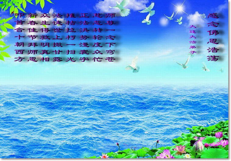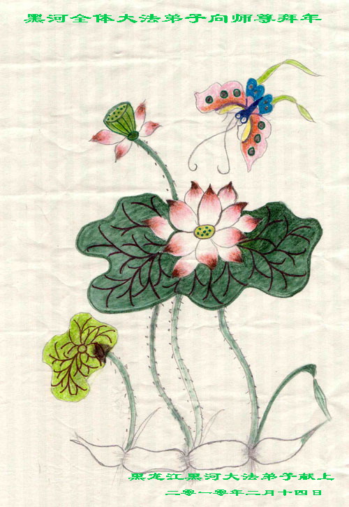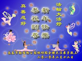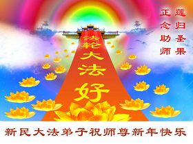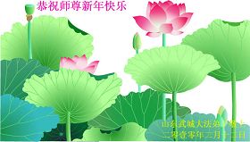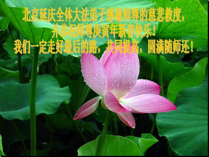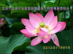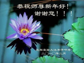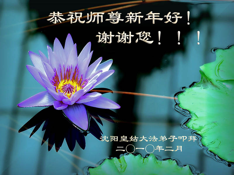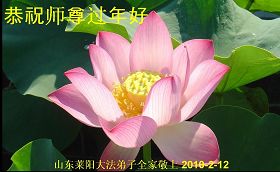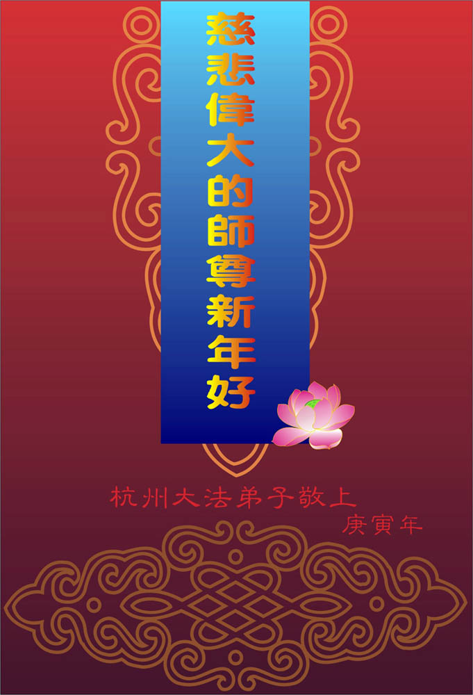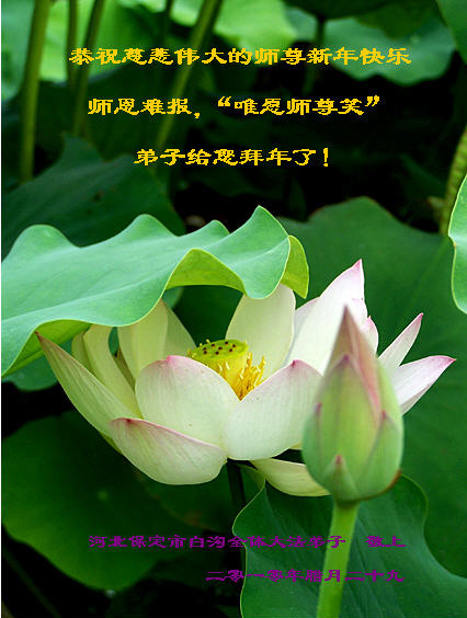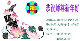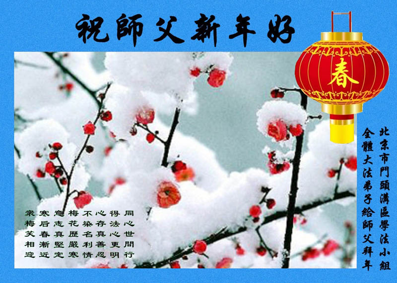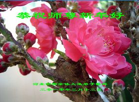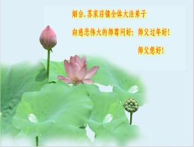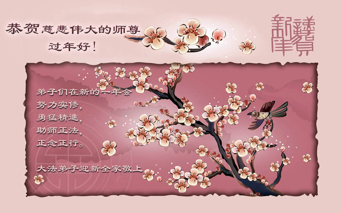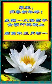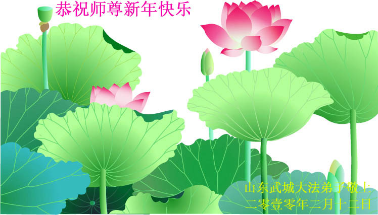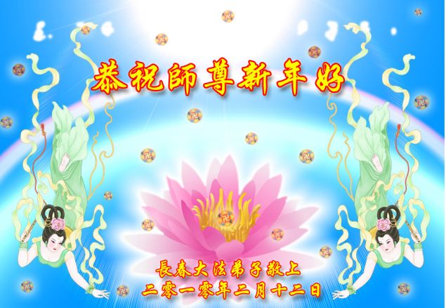【明慧网二零一零年二月十四日】皇姑区全体大法弟子恭祝师尊过年好!北京门头沟大法弟子给师父拜年!一大法弟子全家恭祝慈悲伟大的师尊过年好!弟子们在新的一年会: 努力实修, 勇猛精進, 助师正法, 正念正行。 山东武城大法弟子恭祝师尊新年快乐!浙江兰溪全体大法弟子恭祝师尊新春快乐!承德大法弟子恭祝慈悲伟大的师父新年好!我们在新的一年里,在正法修炼的最后的最后时刻,我们唯有精進再精進,无论外界如何变化,更加精進稳健的做好师父要求做的三件事!在做好三件事中不断的充实自己,既要起到大法一粒子作用,独立运行,也要相互配合发挥整体的力量,走的更加成熟,平稳,坚定。唯愿师尊笑。 沈阳一家庭资料点大法弟子恭祝师尊过年好!行唐县全体大法弟子恭祝师尊新年快乐!在新的一年里,我们行唐全体大法弟子一定会在整体上配合的更好、同修之间做到消除间隔、遇事向内找,修自己,用心做好“三件事”,使我们的整体达到师尊所要求的标准! 锦州大法弟子恭祝师尊过年好!河北邯郸全体大法弟子恭祝师尊过年好!哈尔滨青年大法弟子恭祝师尊过年好!南票大法弟子恭祝师父过年好!新民大法弟子敬祝师尊新年快乐!普兰店全体大法弟子恭贺师尊新年快乐!建三江边陲一小镇全体大法弟子恭祝师父新年好!博大法理心牢记 一思一念找自己 无私无我救人急 正念正行正天地 他人有难当己任 营救同修视整体 众生得救为目地 讲清真相一对一 全球反迫害悄然起 兑现洪愿步不停息 保定市大法弟子恭祝师尊新年快乐!浙江临海大法弟子恭贺师尊过年快乐!烟台栖霞苏家店镇全体大法弟子向慈悲伟大的师尊问好!河北省栾城大法弟子祝师父新年好!河北保定市白沟全体大法弟子恭祝慈悲伟大的师尊新年快乐!山东莱阳大法弟子恭祝慈悲伟大的师尊新年好!在新的一年里,弟子会更加努力的做好三件事,与同修形成整体,相互配合,坚定正念,多学法,救度有缘人,完成我们的使命。 北京丰台区草桥一学法小组恭祝师父过年好!大庆大法弟子恭祝师尊过年好!大庆龙凤学法小组大法弟子恭祝师尊过年好!河北东光县全体大法弟子恭祝师尊过年好!河北邯郸某家庭资料点恭贺师尊新年快乐!齐齐哈尔市大法弟子恭祝师尊新年快乐!杭州大法弟子恭祝师尊过年好!沈阳市皇姑区大法弟子恭祝慈悲伟大的师尊新年好!江苏南京市江北大法弟子祝师尊新年快乐!在新的一年里,弟子们将努力多学法、学好法、多救人,兑现自己的誓愿,完成助师正法和救度众生的使命! 长春市南湖大路全体大法弟子恭祝师尊过年好!长春市南湖大路一家四口,老少三代大法弟子恭祝师尊过年好!临清部份弟子恭祝师尊新年好!师尊您太辛苦了,为弟子们所做的一切的一切,我们用自己的生命没法感恩,只有听师尊的话在学好法的基础上,多去自己的执著心,做好师尊让做的三件事,多救度众生,兑现自己的誓约圆满随师还。 长春大法弟子恭祝师尊过年好!北京延庆全体大法弟子恭祝师尊新春快乐!北京大法弟子全家恭祝师尊新春快乐!山东高唐县大法弟子恭贺师父过年好!大连大法弟子恭祝师尊过年好!山东高唐县大法弟子恭祝师尊过年好!人间末劫风雨中, 师尊救度又添寿。 得法众生蒙洪恩, 苦海慈航驾轻舟。 只看梢头花枝俏, 些许清寒不须愁。 正法除恶系一瞬, 大法弟子显神州。 密云大法弟子恭祝慈悲伟大的师尊新年快乐!吉林辉南大法弟子全家恭祝师尊新年好!大连大法弟子恭祝伟大师尊新春快乐!在新的一年里,我们一定会不辜负您的期望,倍加精進,发扬猛虎精神,以猛虎下山之势灭尽邪恶,救度众生,请师尊放心! 黑龙江黑河全体大法弟子向慈悲伟大的师尊拜年!景县大法弟子敬祝师尊新年快乐!淮南、寿县全体大法弟子恭祝师尊新春愉快!在新的一年里,淮南、寿县大法弟子要跟上正法進程,首先要多学法,学好法,修好自己,放下人心,放下执著,全力的救度众生,兑现自己的神圣誓约。 长春市动植物公园炼功点全体大法弟子恭祝慈悲伟大的师尊新年快乐!盘锦一大法弟子全家恭祝师尊新年好!哈尔滨大法弟子给伟大的师尊拜年!我们一定做好三件事,救度众生,跟师父回家。 大陆大法弟子向师尊拜年!遥拜师尊 光阴逝水又新春,虎年顶礼拜师尊。 望穿秋水天穹外,思念主佛热泪噙。 洪恩浩荡无以报,万里飞鸿寄丹心。 学法去执轻装進,扬帆破浪多救人。 向恩师拜年 四时往复又一年,敬祝恩师新春欢。 十毒恶世徒得度,恩深似海重如山。 每逢佳节遥相拜,思念满怀泪潸然。 遵嘱走稳风雨路,多引众生上渡船。 山东省枣庄市全体大法弟子祝慈悲、伟大的师尊新年快乐!吉林白山大法弟子祝伟大师尊新年快乐!新宾大法弟子祝师父新年快乐!为了救度大法弟子和众生,师父辛苦了!请师父放心,弟子一定能够坚定的修下去,跟上正法的進程。 辽宁北镇地区全体大法弟子给师尊拜年,祝师尊过年好!感谢师尊慈悲苦度!辽宁沟帮子全体大法弟子给师尊拜年,祝师尊过年好!沈阳一家庭资料点弟子给师父拜年,问候师父过年好!山东高密全体大法弟子向师父拜年:师父过年好!师父新年快乐!山东菏泽大法弟子恭祝师尊过年好!北京市一父子学法小组大法弟子给慈悲伟大的师尊拜年,恭祝师尊新年快乐!唯愿师尊笑!身在邪恶中心 诱惑如影随形 唯有正悟精進 助师救度众生 山西大同全体大法弟子恭祝慈悲伟大的师尊虎年快