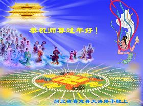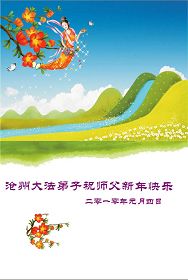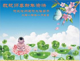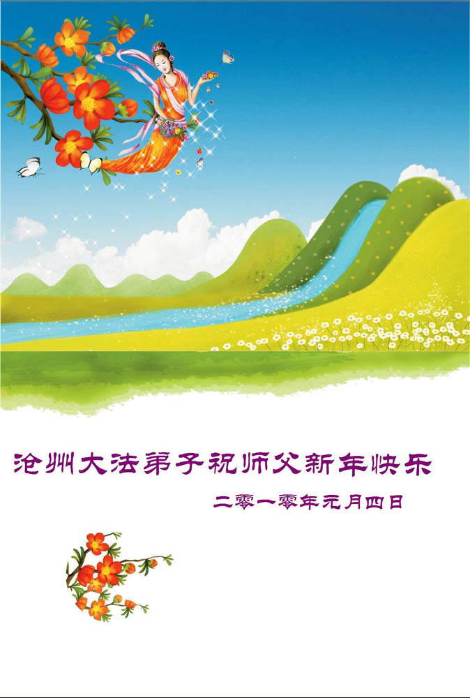 【明慧网二零一零年二月十五日】河北省保定市博野县资料点大法弟子祝师尊新年快乐!河北沧州运河大法弟子敬祝师尊新年愉快!石家庄大法弟子恭祝慈悲伟大的师尊新年好!沧州大法弟子祝师父新年快乐!沧州大法弟子敬贺师父新年好!北京大法弟子敬祝师尊新年快乐!河北保定省博野县全体大法弟子祝师尊新年快乐!山西繁峙大法弟子恭祝师尊新年快乐!双城市一家四口恭祝师尊新年愉快!值此新年之际,我们一家四弟子跪拜:师尊过年好!我们想念您。多年的修炼历程,有收获,有遗憾,今后一定要谨遵师尊教诲,严格要求自己,精進实修,不辜负师尊的慈悲苦度!在此谢谢师尊,师尊辛苦了! 内蒙古赤峰市大法弟子恭祝师尊新春快乐!大陆大法弟子十分想念师尊,期盼师尊早日回国!山东淄博张店一家人祝贺伟大的师尊新春快乐!师父为众生操劳辛苦了!山东滨州大法弟子一家给师父拜年!佳木斯一家26人祝伟大慈悲的师尊新年好!新年快乐!弟子及家人给慈悲伟大的师父拜年!师父您好!您辛苦了!弟子及家人谢谢师尊慈悲苦度! 贵州都匀大法弟子给师尊拜年!敬祝师尊新年快乐!请师尊放心,我们都匀大法弟子一定努力做好三件事,做一个合格的大法修炼人。 山东诸城大法弟子给师父拜年!我们一定要做好三件事,完成使命!中国大陆吉林市全体外乡大法修炼人叩首恭祝大法师父中国大年好!师父我们想念您!河北省青龙县大法弟子恭祝师尊过年好!辽宁省大法弟子祝师父新年快乐!保定市南市区大法弟子恭祝恩师新年快乐!中国广东清远边远山区全体大法弟子恭祝师尊新年快乐!黑龙江省佳木斯市东风区五人学法小组祝慈悲伟大的师尊新年快乐!在新的一年里,我们要更加精進,完成我们的史前大愿,请师父放心。 江苏南通大法弟子向师尊新年问好!吉林市大法弟子向师父拜年:慈悲伟大的师尊过年好!沂南大法弟子恭祝师尊过年好!师恩似海深,纵倾人世笔墨无以言表。唯有勇猛精進,助师正法,做好三件事。 黑山一家三口大法弟子向师尊问好!恭祝慈悲伟大的师尊过年好!在新的一年里,在这除旧迎新的历史时刻,我们按照师尊的教诲“多学法、学好法”,做好“三件事”,向内修、向内找,去执着,圆容整体,在法上配合同修,不负师尊的慈悲苦度。 内蒙古赤峰大法弟子全家恭祝师父过年好!河北省青龙县全体大法弟子恭祝师尊过年好!盘锦地区大法弟子恭祝慈悲伟大的师尊新年快乐!愿师尊多一些欣慰,少一些操劳。弟子们一定要多学法,发好正念,救度更多众生。请师尊放心。 想念您的弟子 2010年2月12日 吉林省大安市大法弟子祝师尊过年好!尊敬的师尊:弟子十分想念您,弟子知道做的不好,不够一个大法弟子的标准,但弟子一定抓紧时间,紧跟正法進程,不辜负师父对弟子的期望,圆满随师还。值此新年之际,我们全家修炼人和不修炼人共七口人向师尊问候,真心祝愿师尊过年好! 莱西全体大法弟子恭祝师尊过年好!在这正法的最后时刻,莱西全体大法弟子决心整体协调好,向内找,排除干扰,修好自己,走正师父安排的路,救度更多的众生,完成神圣的使命,不负众生日久的期盼。 河北大法弟子恭祝师尊过年好!北京海淀区大法弟子恭祝师父过年好!我们是外地来北京工作的大法弟子,在新年到来之际,向慈悲伟大的师父问声过年好!我们一定做好三件事,不辜负师父的苦度! 河北万全大法弟子遥祝师尊新年快乐!黑龙江抚远县六位大法弟子恭祝慈悲伟大的师尊新年快乐!山西大法弟子祝师父新年快乐!中国大陆山东栖霞大柳家大法弟子恭祝师尊新年快乐!石家庄桥东大法弟子恭祝慈悲伟大的师尊新年快乐!延吉大法弟子祝师父新年快乐!全体石家庄大法弟子祝慈悲伟大的师父新年快乐!浙江金华全体大法弟子恭祝慈悲伟大的师尊新春快乐!辽宁省阜新市大法弟子敬祝师尊新年好!在未来的证法路上,我们不辜负师父的慈悲苦度!精進不停,做好正法中的每一件事! 浪淘沙 谢师恩 大法弟子灵慧 佳节倍思亲, 叩拜师尊。 须弥山高崇天外, 不及吾师救度恩。 精進不停。 梅花点点香, 朵朵清新。 新年唯愿师尊笑。 碧海青天弟子心, 正法救人。 辽宁省阜新市大法弟子 己丑年十二月二十九 青岛两个学法小组全体大法弟子(16人)向师父拜年!师父过年好!师父您辛苦了!请师父放心,弟子决不辜负师尊的慈悲苦度,一定精進实修,扎扎实实修好自己,认真做好大法弟子应该做好的三件事,多救众生,兑现弟子史前的誓约,做一名合格的大法弟子,助师正法,跟上正法進程,圆满随师回家。 张家口流离失所大法弟子恭祝慈悲伟大的师尊过年好!师尊过年好!每当想起师尊的洪大慈悲时常让弟子泪如雨下,用尽人间所有的语言也无法表达弟子对师父的崇敬和感激。在最后的日子里,弟子一定听师父的话,学好法,修好自己。抓紧时间多救众生,不辱使命。 大陆一学法小组十几位弟子给师尊拜年!师父新年好!祝师父新年快乐!我们学法小组有年近七十岁的老同修,也有几岁的小同修,还有不认字的同修,在师尊的呵护下,我们在一起学法已坚持三年之久。在做好三件事方面大家配合的非常好,今后我们一定学好法,多救人。 广西梧州大法弟子及家人恭祝师尊新年快乐!在新的一年弟子将努力做好三件事,勇猛精進,在此新年之际,大法弟子全家恭祝伟大的师尊新年快乐! 大陆大法弟子祝师父新年快乐!内蒙古多伦县大法弟子给师父拜年!祝师