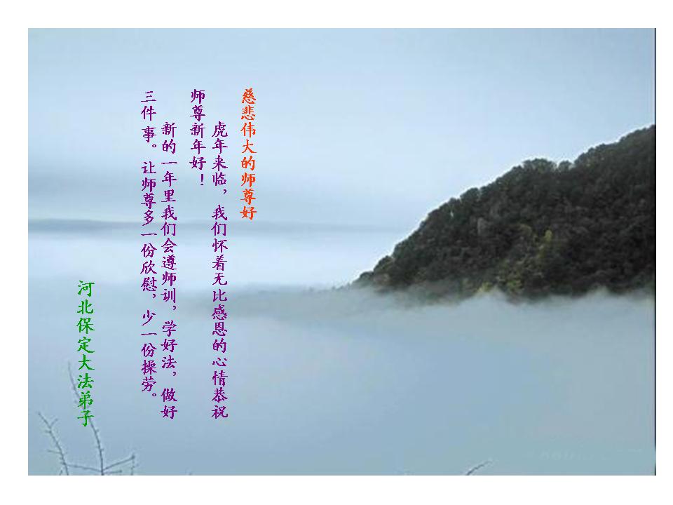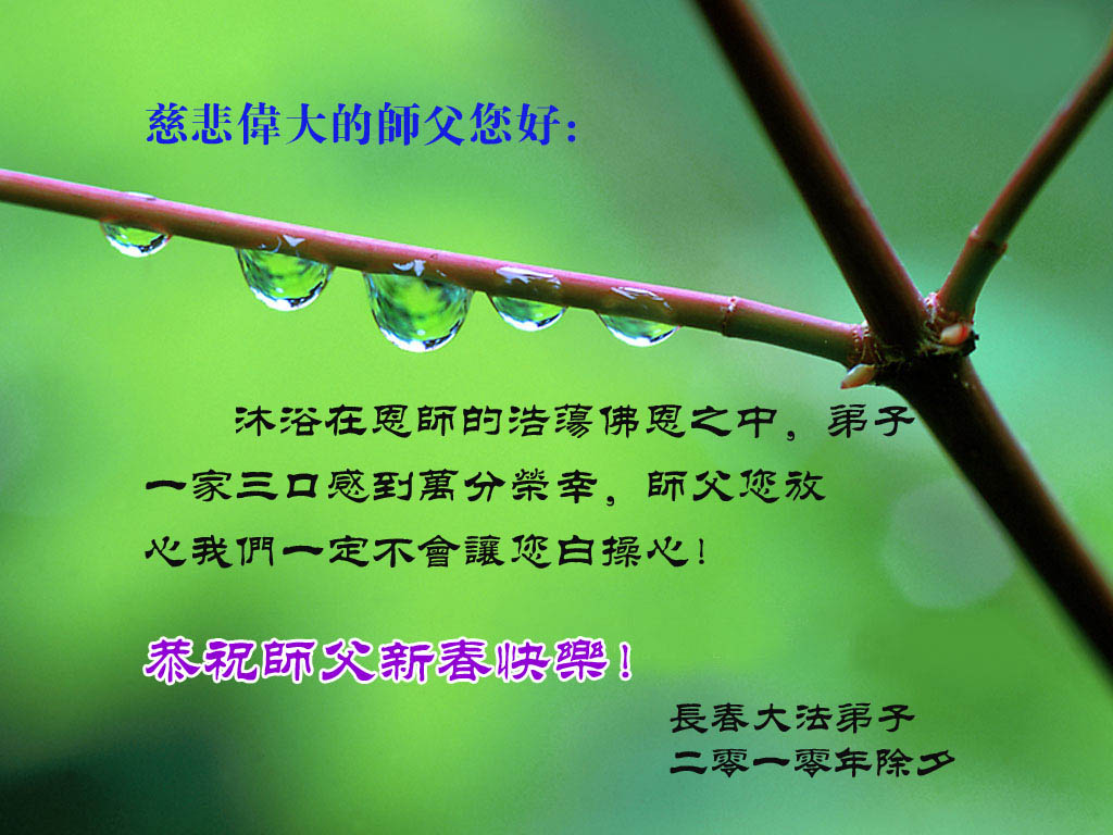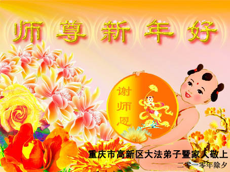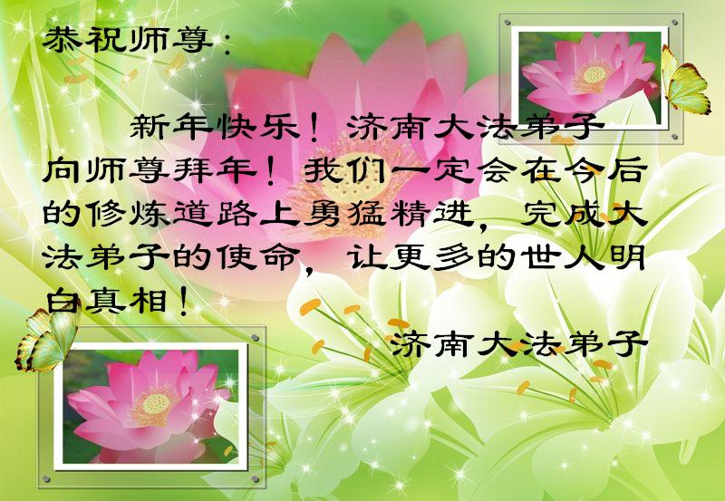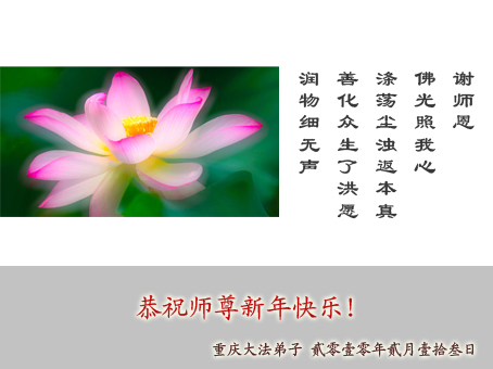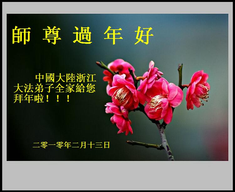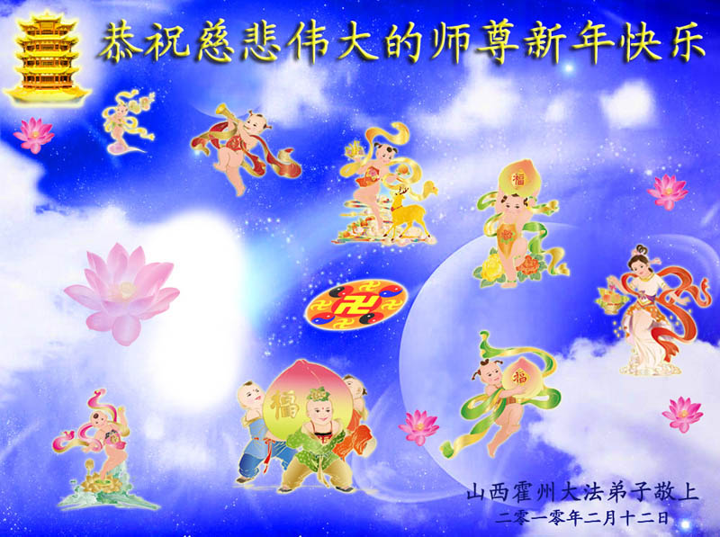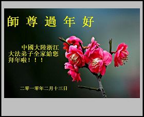 【明慧网二零一零年二月十五日】麻城大法弟子向师尊拜年!淄博市张店区大法弟子恭祝师尊过年好!通辽大法弟子祝师父新春快乐!吉林省吉林市江密峰镇全体大法弟子恭祝师尊过年好!平顶山全体大法弟子恭祝师尊过年好!河南省大法弟子恭祝师尊过年好!河南南阳大法弟子恭贺师父新年快乐!沈阳大法弟子恭祝师父过年好!太仓大法弟子祝师尊新年快乐!黑龙江省哈尔滨市阿城区三口之家大法弟子恭祝师尊新年快乐!大陆一大法弟子恭祝伟大慈悲的师尊新年快乐! 上海静安区大法弟子给师尊拜年,恭祝师尊中国新年快乐!弟子永远铭记师尊的教诲,请师尊放心。 河北大法弟子问候师父过年好!盼师归,盼团圆。我们全家给师父拜年! 黑龙江省大庆市老年大法弟子恭贺师尊新年好。请师父放心,我一定在新的一年里精進实修,不辜负师尊重托,众生的期盼,做好三件事跟师父回家。 辽宁铁岭大法弟子恭祝师尊新年快乐!师尊过年好!河北大法弟子全家向师尊叩首、合十:祝师尊新年快乐!在新的一年里平稳的做好三件事,让师尊少一些操劳,多一些欣慰。 河北秦皇岛市青龙大法弟子向师尊问好,您辛苦了!祝您新年快乐。天津市宝坻区全体大法弟子跪拜慈悲伟大的师尊新年快乐!辽宁金城一大法弟子全家恭祝伟大的师父过年好!在今后的时间里,弟子更加精進,做好三件事。家人感谢师父的救度之恩,法轮大法好! 重庆大法弟子恭祝师尊新年快乐!