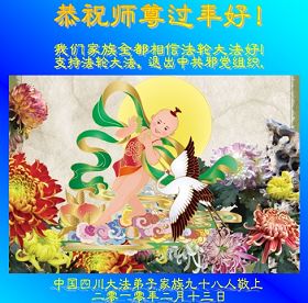 恭祝师父新年好! 上海大法弟子恭祝师尊过年好!黑龙江绥棱县大法弟子恭祝师尊新年快乐!四川大法弟子家族九十八人恭祝师尊过年好!涿州松林店镇全体大法弟子及家人恭祝师尊新年好!长春大法弟子恭祝师尊过年好!大陆大法弟子祝伟大的师尊新年快乐!祝伟大的师尊:新年快乐!弟子在大法中修炼十多年,时时沐浴着浩荡佛恩,弟子感恩万分,无以回报,弟子要在新的一年里,静心学法,多去执著心,要去掉顾虑心 、多疑心、色欲心、妒嫉心、怕心 ,修出慈悲心,多救众生,做好三件事,回报师恩。踏上神的征途,不管路有多长,跟随师尊回归圣界美好的家园。 大庆市让胡路区一大法弟子和女儿大法弟子跪拜师尊! 鞍山、大连大法弟子恭祝慈悲伟大的师尊新年快乐!湖北广水大法弟子全家祝慈悲伟大的师父新年快乐!万源大法弟子恭祝师尊新年快乐!师尊洪恩,弟子无以为报,只有勇猛精進,多救度众生,唯愿师父笑! 山东济南大法弟子一家祝师父新年好!我们一定精進实修,不辜负师尊的慈悲苦度! 山东淄博周村大法弟子恭祝师尊新年快乐,万事如意!弟子会谨遵师命,做好大法弟子该做的事。 河南禹州大法弟子恭祝伟大的师尊新年好!在新的一年里,一定做好三件事,完成史前大愿! 山东济宁大法弟子想念师父,给师父拜年!北京大法弟子全家叩拜师尊,祝师尊新年快乐!万事如意!我们是九九年得法的大法弟子,十年来在师尊的慈悲呵护下才走到今天。虽然修的不太精進,但我们一直对师对法深信不疑。新的一年里我们争取尽快放下人的东西,圆满随师还! 哈尔滨市南岗区一学法小组:恭祝慈悲伟大的师尊新年好!师父您辛苦了,我们想念您。河北省辛集市大法弟子给师父拜年了。大法弟子想念师父。在新的一年里,弟子一定不负师父厚望,做好三件事。 沅江大法弟子恭祝师尊新年快乐!我们在新的一年里一定做好三件事,请师尊放心。 张家口大法弟子恭祝师尊过年好!大法无边正大穹 佛恩浩荡救众生 四海破迷明真相 普天同庆颂师恩 广东顺德大法弟子恭祝师尊新年快乐!在新的一年里,我们一定做好三件事,完成救度众生的神圣使命,请师尊放心。 大陆一家大法弟子给师父拜年!祝:师父新年快乐,万事如意!弟子在新的一年里更加精進,让师父少一些操劳,多一些欣慰。 大陆一名大法弟子恭祝师尊过年好!谢谢师尊的慈悲度,在新的一年里弟子唯有精進才对的起师尊、对的起众生和自己。 长春大法弟子向伟大的师尊问候:新年快乐!弟子精進实修,跟师父回家。 山东青岛大法弟子叩拜师尊!恭祝师尊新年快乐!河南省郑州市大法弟子向师尊问好!祝师尊新年快乐!用尽人间的语言,也无法表达对师尊的无限思念和感恩,唯有精進再精進,在很有限的时间里,多学法,学好法,多救人,兑现自己的史前大愿,跟师父回家。 河南郑州市大法弟子 二零一零年二月十二日 河南郑州市某学法小组全体大法徒恭祝慈悲伟大的师尊新年好,大法徒向您拜年!我们学法小组一直认识到,在这有限的时间内,唯有多学法,学好法,因为做好证实法的事一切都来自大法中,如果全世界大法徒能形成一个强大的整体,是每一个大法弟子的一思一念都溶于法中,也就是说,在纯净下,再能形成一个强大的正念之场,才能展现出宇宙大法无比的威力,这么强大的正念之场,使邪恶就会自灭,使我们助师正法,救度更多的有缘众生,圆容师父所要的。同时全球大法徒要正念加持正法進程中的其它事件,使其按照师父的正法要求及结果发展。 河南郑州市某学法小组全体大法徒 二零一零年二月五日 北京大兴大法弟子一家四口恭祝师尊新年快乐!唐山丰南大法弟子给师父拜年。师父您好:师父您辛苦了。愿师父少一些操劳多一些安慰!弟子们会做得越来越好,圆满和师父回家! 上海大法弟子恭贺慈悲伟大的师尊新年好!保定徐水县全体大法弟子恭祝慈悲伟大的师尊新年好!湖南郴州大法弟子向师父拜年,恭祝伟大的师尊新年快乐!广东顺德大法弟子给师尊拜年!我们尊敬的伟大、慈悲的师尊:弟子给您拜年了。师父,您辛苦了!弟子的感恩,世间没有语言能表达得了。弟子愧对师父的慈悲苦度,弟子只有精進,让师父能欣慰一点,弟子就安心一点。 乐山市一名大法弟子祝福伟大的师父新年快乐!我们一定按照“真善忍”佛法的标准修炼好自己,千方百计做好三件事,早日实现史前誓愿,完成使命跟你回家! 北京市海淀区大法弟子恭祝师尊中国新年好!师父新年好!师父辛苦了!用尽千言万语也无法表达对师尊慈悲苦度的感激。弟子唯有不断精進做好三件事以谢师恩之万万一。 威海大法弟子恭祝师尊过年好!弟子合十跪拜师尊河南偃师大法弟子祝师父新年快乐,开心如意。在您的精心呵护下又度过了一年,忆旧岁我修炼的路不平坎坷跌倒爬起,人心就象大海的海浪落下又起。您的慈悲真叫弟子感恩落泪,还在紧紧的拽着这不争气的弟子,在新的一年里我要加倍努力做好三件事修好自己,助师正法,随师圆满把家还。最后愿师父多保重自己。 河北省永清县全体大法弟子叩拜师尊,恭祝师尊新年快乐!江苏盛泽大法弟子叩拜慈悲伟大的师尊新年快乐!山东菏泽大法弟子恭祝慈悲伟大的师尊新年快乐!吉林抚松大法弟子给尊师拜年。祝师尊新年好!弟子会牢记师尊教诲,做好三件事,勇猛精進。 吉林省舒兰市全体大法弟子恭祝慈悲伟大师尊新春快乐佛山大法弟子(一家