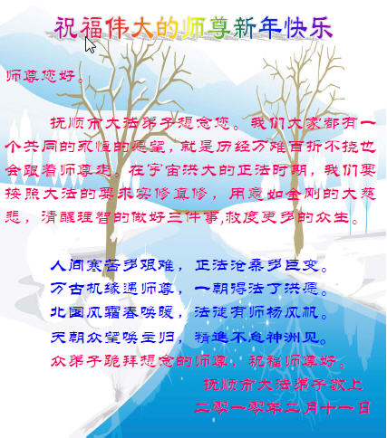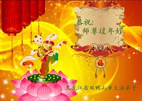 敬请伟大的师尊放心,弟子一定以法为师,学好法,做好三件事,跟师父回家! 黑龙江八五二大法弟子恭祝师尊过年好!