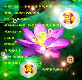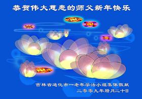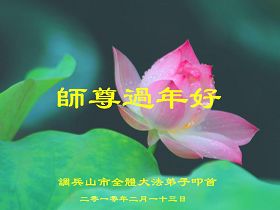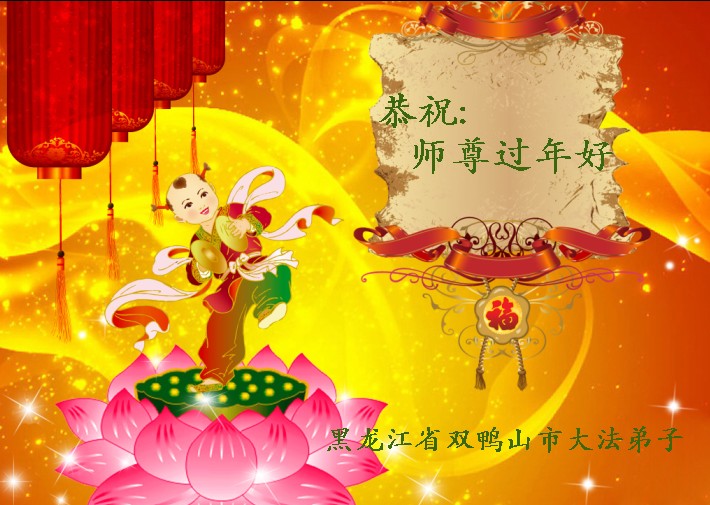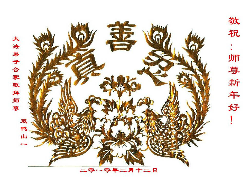 【明慧网二零一零年二月十五日】辽宁金城全体大法弟子恭祝师尊新年快乐!黑龙江省双鸭山市大法弟子恭祝师尊新年快乐!双鸭山一大法弟子恭祝师尊过年好!山东烟台市大法弟子恭祝慈悲伟大的师尊新年快乐!淮南、寿县全体大法弟子恭祝师尊过年好!湖北石首市大法弟子恭祝师尊过年好!抚顺市大法弟子恭祝伟大的师尊新年快乐!吉林通化一老年弟子学法小组全体大法弟子恭贺伟大慈悲的师父新年快乐!向伟大慈悲的师父拜年,祝师父新年好!我们感谢师父的慈悲苦度。 我们决不辜负师父的厚望,理智清醒地做好三件事,迎接春天的到来,迎接和师父团圆的那一天,普天同庆、同祝、同颂。 二零零九年腊月二十日 通化市某学法小组全体大法弟子给师父拜年了!祝师父过年好!转眼一年时间又过去了,师父为我们操尽了心。我们一定在新的一年里多学法,学好法,修好自己,溶于法中,救度众生,兑现我们的誓愿。 吉林省通化市某学法小组全体大法弟子 二零一零年二月 调兵山市全体大法弟子祝师父新年快乐! 山东即墨市大法弟子给慈悲伟大的师尊拜年!