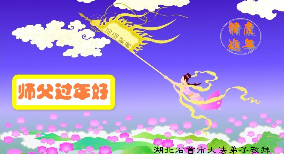 湖北省潜江市大法弟子恭祝伟大的师尊新年好!安国市全体大法弟子敬祝师尊”过年好!开封一四人学法小组恭祝慈悲伟大的师尊过年好。山东泰安大法弟子向师尊拜年!祝师尊新年快乐!我是一名重新回到修炼路上的大法弟子。弟子给师尊拜年了!祝师尊新春快乐!感谢师父不放弃指引同修又把弟子找回来,弟子一定不辜负师父的慈悲苦度,请师父放心,弟子在新的一年里,努力学好法,在法上多悟,悟深,悟透。精進实修做好三件事,跟上正法進程。多救世人,兑现自己的誓约,实现自己的洪愿,圆满随师还。 十堰大法弟子给师尊拜年!师尊您辛苦了!目前世上的每一天都是师尊慈悲世人而延续出来的!为的是救度世人。感谢师尊! 烟台开发区大法弟子一家祝师父新年快乐!保定市杨村全体大法弟子向慈悲伟大的师尊拜年,祝师父新年快乐!身体健康!万事如意!广东梅州大法弟子恭祝师尊过年好在新年到来之际恭祝师尊多一份开心,少一份操劳,弟子唯有精進感谢师恩! 山东淄博淄川大法弟子恭祝伟大慈悲的师尊新年快乐!河北青县大法弟子一家人恭祝师尊新年快乐!徐州大法弟子向师父拜年了。在师父的细心呵护下,弟子终于明白了生命存在的意义。弟子一定不忘史前的誓言,做好三件事,走好最后的路,为救度世人奉献最好的一切。 吉林市二个人学法小组给师尊拜年!湖北襄樊大法弟子向慈悲伟大的师尊拜年!恭祝师尊新年好!河南巩义大法弟子恭祝师尊过年好!山东潍坊市大法弟子给师父拜年!在最后的这段时间里,弟子一定努力做好这三件事,兑现自己的誓约,跟随师父回家还。 北京昌平、大兴大法弟子向师父问好!广东江门全体大法弟子向师尊拜年,恭祝师尊虎年快乐!感谢伟大师尊的慈悲救度,在新的一年里,弟子们会勇猛精進,做好三件事,完成洪愿,跟师尊完满回家。 青岛大法弟子给师父拜年。伟大的师尊新年好!在新的一年里我和妈妈一定要听您的话,努力精進,跟您回家。 河南唐河全体大法弟子恭祝慈悲伟大的师尊过年好!武汉大法弟子向慈悲伟大的师尊拜年。我零六年开始上明慧网,是师父的慈悲点悟才使我很快学会了上网、下载、打印、刻碟等应用技术,现在我也是大法资料点万花丛中的一朵小花。新的一年里弟子要更加努力做好三件事,希望师尊少些操劳,多些欣慰。 贵州省六枝地区大法弟子恭祝师父新年好!您辛苦了。我们一定不辜负您的苦度,走好最后的路! 辽宁省葫芦岛市一家三口祝伟大的师尊过年好!弟子回想自己曾经走过的路,感慨万千,真是愧对师尊,愧对法。弟子从今以后,一定要严格要求自己,时时用法来要求自己,处处向内找,做到先他后我,做好三件事,让师尊放心的真修弟子。 武汉市江汉区全体大法弟子给师父拜年!祝愿师父新年快乐!请师父放心,弟子们一定做好三件事,跟师父回家! 陕西石泉县大法弟子恭祝慈悲伟大的师父新年好!师父您好!师父您辛苦了!弟子们非常想念您!我们会在神的路上走的更好,救度更多世人。 我们坚信师父、坚信大法,修去自己不好的一思一念,树立无私、无我的正觉,正念正行。圆容好法,修去人的观念。在新的一年里救度更多的众生,完成自己的史前大愿,勇猛精進,圆满随师还。 河北沧州大法弟子给慈悲伟大的师尊拜年。祝师父新春快乐!河北省霸州大法弟子祝师父新年好。安安全家祝师父新年好,弟子一定做好大法弟子份内之事,请师父放心。 江苏苏北大法弟子恭祝慈悲伟大的师尊新年快乐!谢师恩 大法洪传正乾坤, 圣王慈悲救众生。 共产邪灵迫害法, 谎言毒害迷中人。 得法弟子多幸运, 唯有精進报师恩。 认真做好“三件事”, 兑现誓约慰师尊。 莒县一家三口大法弟子恭祝慈悲伟大的师尊新年快乐!泰安大法弟子恭祝伟大的师尊新年快乐!山东省聊城大法弟子向慈悲伟大的师父拜年,谢师恩,祝师父新年愉快。沾化全体大法弟子恭祝师父新年快乐!济南大法弟子代表家人及老年同修向伟大的师尊拜年,师尊过年好!河北省廊坊市的全体大法弟子真心的恭祝伟大的师尊新年快乐!我们全体大法弟子会互相鼓励,形成整体,去掉人心,做好师父让做的三件事,不会辜负师父的期望,圆满随师还。 长春榆树大法弟子小燕祝伟大的师父新年快乐!成都大法弟子祝慈悲伟大的师父新年好,师父辛苦了。弟子想念您。在新的一年里,弟子一定努力做好三件事,努力救度众生。一定下大功夫无条件遇事向内找,克服惰性,无条件宽容同修,配合同修,协调同修,修去人心,完成史前洪誓大愿。 辽宁省大连市大法弟子恭祝师尊过年好。在新的一年里,我们会更加精進,做好三件事,抓紧时间救人,绝不辜负师尊的慈悲救度。请师父放心! 石家庄长安区大法弟子衷心恭贺伟大师尊新年快乐!早日归来!湖北武汉东湖高新技术开发区大法弟子向慈悲伟大的师尊恭祝新年快乐!师父您辛苦了!辽宁东港地区大法弟子向伟大的师尊拜年,师尊过年好!在新的一年里,我们家乡的大法弟子,要更加勇猛精進,坚信师尊,坚信大法,做好三件事,助师救度更多的众生,兑现史前洪愿,跟随师尊回归美好家园。请师尊放心! 五名大法弟子家庭学法小组向师尊拜年。伟大慈悲的师尊:过年好!感谢师尊慈悲救度。在新的一年里,我们定会继续努力做好三件事,不负师恩。 河北大法弟子恭贺师尊过年快乐!恭贺师尊新年快乐。弟子十分想念您,在新的一年里,勇猛精進,完成神圣的