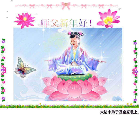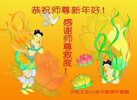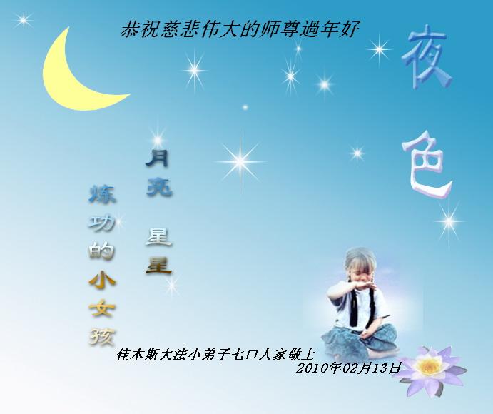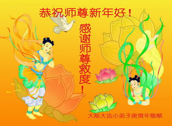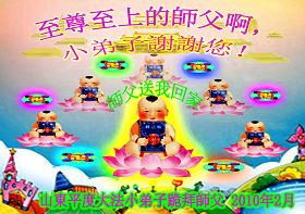 【明慧网二零一零年二月十五日】大陆大法小弟子恭祝师尊新年好!平顶山全体大法小弟子恭祝师尊新年快乐!大陆小弟子及全家恭祝师尊新年好!贵州省六盘水市大法小弟子恭祝师尊新年快乐!山东省招远市两位大法小弟子(7岁、8岁)在除旧迎新之际向慈悲伟大的师尊问声:师父过年好!合十!哈尔滨大法小弟子祝师父新年快乐!河北沙河全体大法小弟子向慈悲伟大的师尊拜年!佳木斯大法小弟子七口人家给师父拜年! 保定新市区大法小弟子恭祝慈悲伟大的师尊新年好!