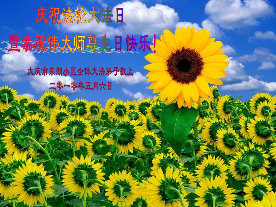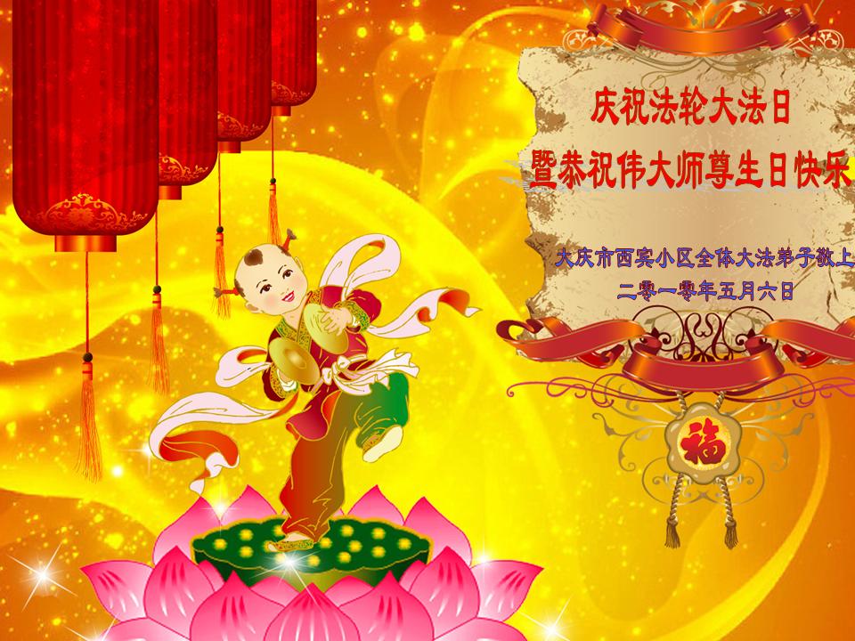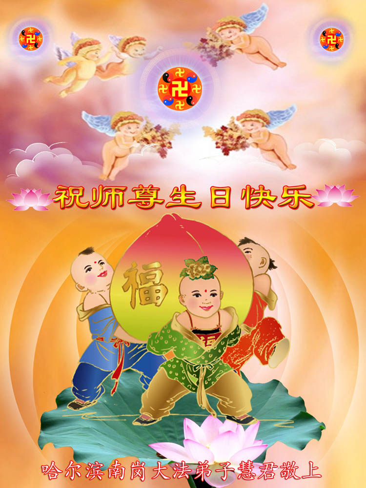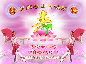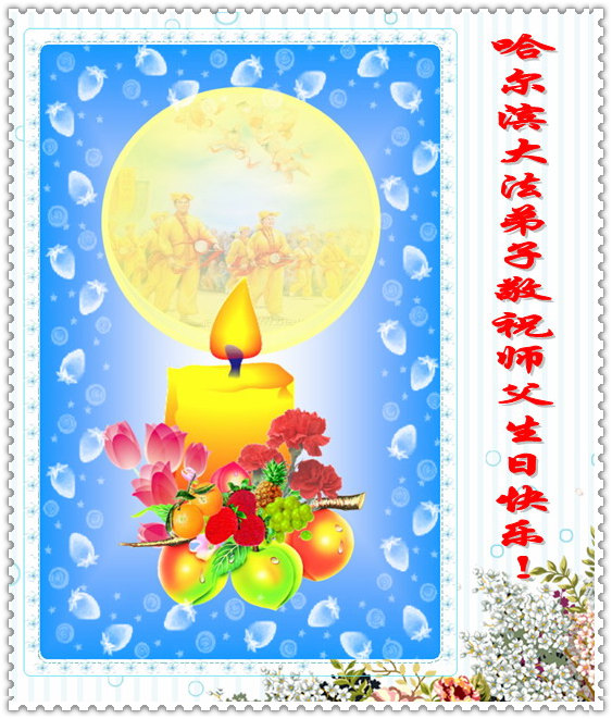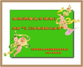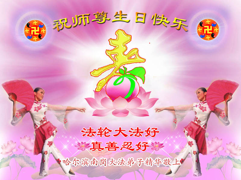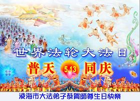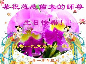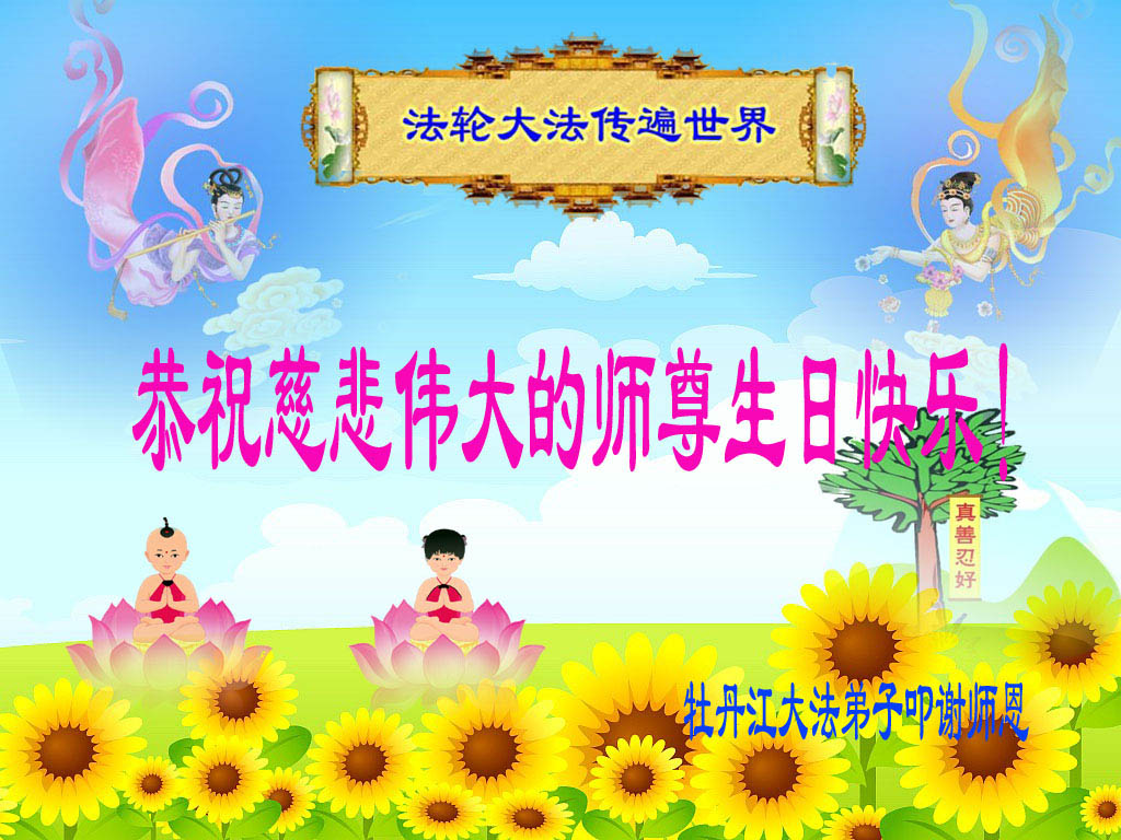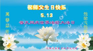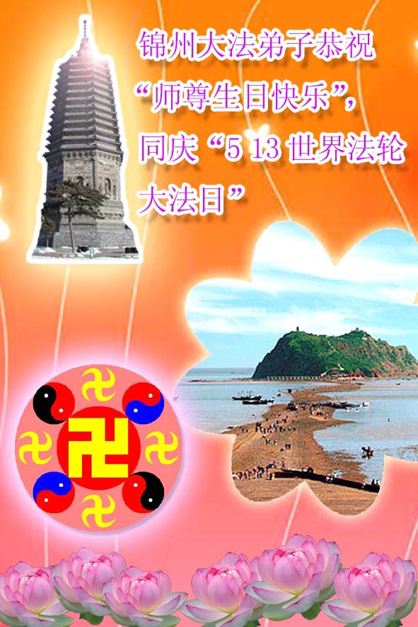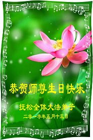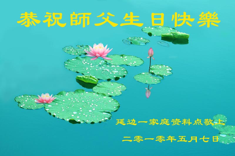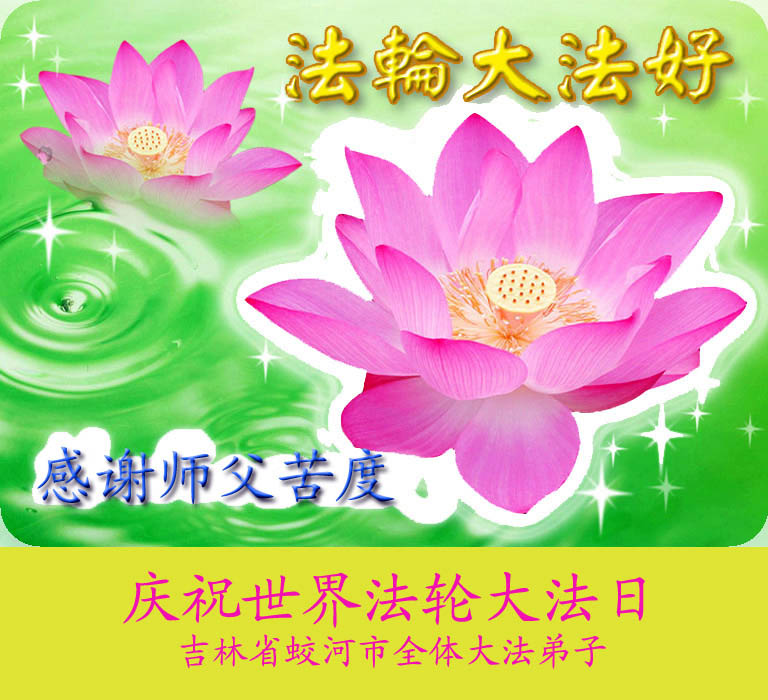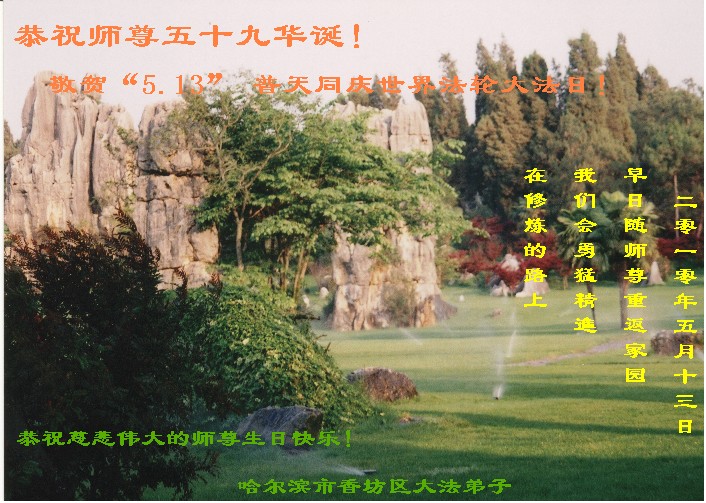 【明慧网二零一零年五月十二日】黑龙江牡丹江大法弟子恭祝慈悲伟大的师尊生日快乐!普天同庆世界法轮大法日!我们黑龙江牡丹江大法弟子一定谨遵师尊教诲,精進实修,做好三件事,敬请师尊放心。愿全世界大法弟子共同精進!师尊,弟子们想念您! 黑龙江牡丹江大法弟子叩谢师恩 2010年5月 辽宁凌海市大法弟子恭贺师尊华诞暨大法洪传十八周年!黑龙江省齐齐哈尔市富裕县大法弟子恭贺师尊传法十八周年!黑龙江省依兰县大法弟子全家恭祝师尊生日快乐!恭祝法轮大法洪传十八周年!辽宁大法弟子恭祝恩师五十九华诞!师恩浩荡大法威德万古颂传 辽宁大法弟子 竺林 圣洁的优昙婆罗花在五大洲绽放, 恭迎师尊来世间正法洪传法光。 无量慈悲的伟大师尊啊,您—— 脚踏万魔冲破重重艰险阻拦, 率众法徒救度众生于危难前。 转动法轮拯救大穹法正乾坤, 十八载耗尽全力让新宇再现。 开启天门满载众生圆满回天, 茫茫天宇浩瀚苍穹法光闪闪。 普天同庆恭祝恩师五十九华诞, 师恩浩荡大法威德万古颂传。 二零一零年四月二十五日 抚顺市一位大法弟子恭祝师尊生日快乐!弟子要珍惜时间,去掉人心,更好的做好三件事,救度更多众生!尽量让师父少操点心,惟愿师尊笑! 抚顺市一位大法弟子恭祝师尊生日快乐!在正法的最后阶段,弟子一定做好三件事,证实大法救度众生,完成自己的史前大愿。惟愿师尊笑! 黑龙江省绥芬河市全体大法弟子恭祝恩师生日快乐暨世界法轮大法日!普天同庆日 弟子念恩师 精進实修不忘恩 感谢师尊苦心度 长春大法弟子恭祝恩师洪传大法一十八周年!二零一零年四月一十三日 我们大连大法弟子向慈悲伟大的师父问好!我们大连大法弟子向慈悲伟大的师父问好!我们大连大法弟子想念您!我们决不辜负师尊对我们的慈悲苦度,整体提高,整体升华,更加勇猛精進,助师救度更多的众生,完成我们的历史使命!请师尊放心。 大连大法弟子 二零一零年四月十六日 黑龙江省北安市一资料点大法弟子祝慈悲伟大的师尊生日快乐!祝贺大法洪传十八周年!同庆世界法轮大法日!黑龙江省北安市六人学法小组大法弟子祝伟大师尊生日快乐!师父您好!师父您辛苦了!我们学法小组会努力学好法,做好三件事,请您放心。 哈尔滨大法弟子敬祝师父生日快乐!大连两个学法小组全体大法弟子衷心祝贺师尊生日快乐!并祝师尊十八年传法正法的辉煌成果!敬爱的师尊:从一九九二年五月十三至今,师尊在世间传法正法十八周年。十八年宝贵的黄金时间,佛恩浩荡的万古机緣,象流水般的逝去。为救宇宙大穹永远不灭,为救世人生命的永远,为使大法弟子通过修炼能成神,慈悲伟大的师尊天上人间操碎了心。目前法轮大法已洪传全世界一百多个国家,大法弟子能走到今天,全是师父的心血栽培,弟子从心里唱出颂歌:天高没有师尊的威德高,海深没有师尊的恩情深,万语说不尽师尊的慈悲,千秋报不完师尊的情恩。俗话说;滴水之恩当涌泉相报。两年来,我们坚持学法背法抄法,还经常学习师尊在各地讲法及精進要旨大圆满法等,对师尊发表的新经文反复学。通过学法,我们在认识法上都有不同成度的提高,在小组交流时弟子都认真的总结了过去学人不学法的教训。每位弟子基本能做到《以法为师》,主动做好三件事,牢记师父的教诲:向内找是法宝,做事首先要为别人着想,处处用真善忍标准要求自己,善待所有的人,遇事忍让等等。另外,我们小组在几个月前就开始动笔写修炼体会故事,大家都想向师父交一份合格的答卷,让师尊多一分欣慰。但是通过学法我们认识到,我们的修炼过程和所做的一切离大法的要求差的还很远,为此,我们只能把同修的体会在大组里交流,相互提高。这是我们修炼路上的一大遗憾。今后我们一定要听师父的话,坚定修大法同化真善忍,一思一念都要把大法摆到重要位置,维护和圆容大法,精進实修,达到神的标准,助师正法救人,报答师尊救度圣恩。我们全体大法弟子急盼师尊回中原家乡的这一天尽快到来。 2010年4月29日 佳木斯发电大法弟子恭祝师尊生日快乐!佳木斯发电大法弟子 2010年5月 佳木斯电力学法小组恭祝伟大师尊生日快乐!佳木斯电力学法小组 全体大法弟子 2010年5月 黑龙江省牡丹江市矿山北站大法弟子敬祝伟大的师尊生日快乐!吉林榆树市一家庭资料点恭祝师尊五十九周年华诞暨法轮大法洪传十八周年及世界法轮大法日十一周年!师尊华诞五十九, 大法洪传十八秋。 弟子叩拜师救度, 普天同庆大穹颂。 吉林榆树市一家庭资料点敬献 二零一零年四月三十日 沈阳市法库县全体大法弟子恭贺师尊华诞!庆贺世界法轮大法日!五月十三这一天,法轮大法降人间。 救世主出横空立,一轮金光天地旋。 普度众生坏灭时,力挽大穹崩裂前。 五洲四海传大法,万国八方栽净莲。 一身承消众生业,单掌立顶欲倾天。 一路逆风一路雨,旧势横阻万魔拦。 披荆斩棘足印血,操心劳神发幡然。 巨慈洪愿金刚志,千难万险视等闲。 真修弟子八千万,正法风云二十年。 光彩耀目佛之国,满载满座大法船。 恭候师尊回东土,挥手翻开新纪元。 沈阳市法库县全体大法弟子 二零一零年四月三十日 吉林省蛟河市全体大法弟子感谢师父苦度!庆贺法轮大法日!黑龙江省东宁县绥阳镇全体大法弟子祝伟大师尊生日快乐!辽源学法组大法弟子恭祝慈悲伟大的师尊生日快乐!辽源大法弟子恭祝师