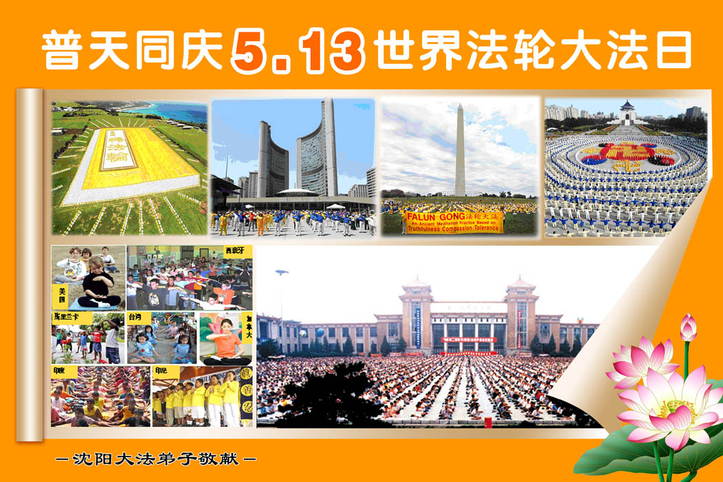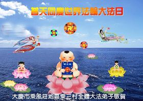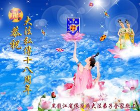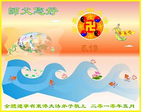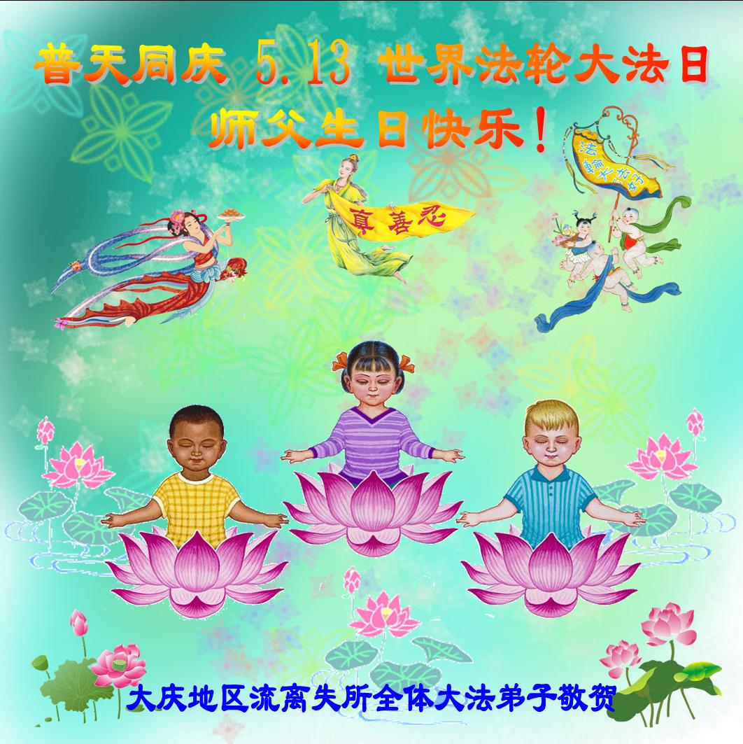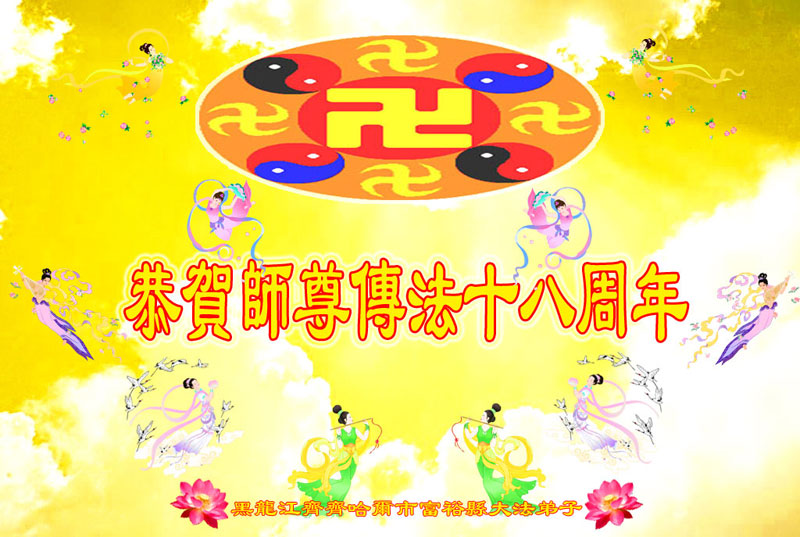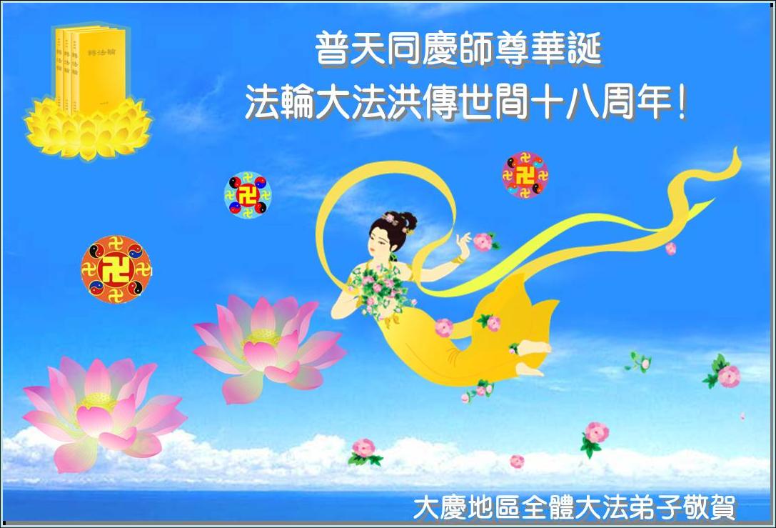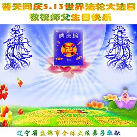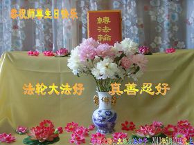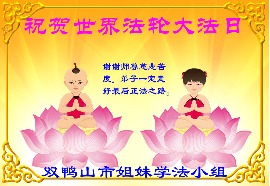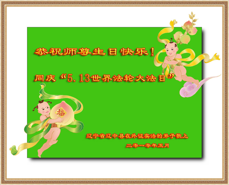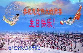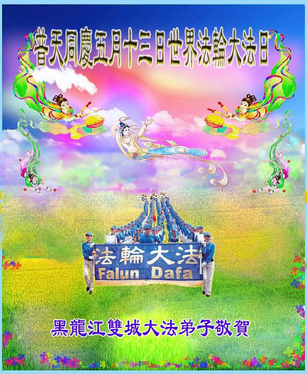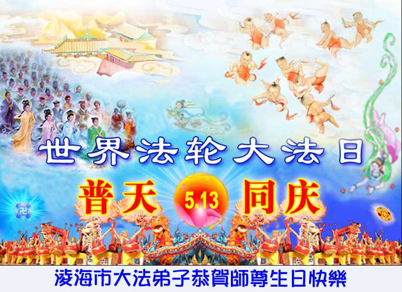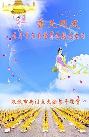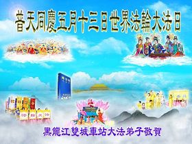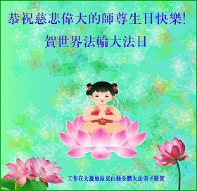 【明慧网二零一零年五月十二日】黑龙江牡丹江大法弟子恭祝慈悲伟大的师尊生日快乐!普天同庆世界法轮大法日!我们黑龙江牡丹江大法弟子一定谨遵师尊教诲,精進实修,做好三件事,敬请师尊放心。愿全世界大法弟子共同精進!师尊,弟子们想念您! 黑龙江牡丹江大法弟子叩谢师恩 2010年5月 辽宁凌海市大法弟子恭贺师尊华诞暨大法洪传十八周年!黑龙江省齐齐哈尔市富裕县大法弟子恭贺师尊传法十八周年!黑龙江省依兰县大法弟子全家恭祝师尊生日快乐!恭祝法轮大法洪传十八周年!辽宁大法弟子恭祝恩师五十九华诞!师恩浩荡大法威德万古颂传 辽宁大法弟子 竺林 圣洁的优昙婆罗花在五大洲绽放, 恭迎师尊来世间正法洪传法光。 无量慈悲的伟大师尊啊,您—— 脚踏万魔冲破重重艰险阻拦, 率众法徒救度众生于危难前。 转动法轮拯救大穹法正乾坤, 十八载耗尽全力让新宇再现。 开启天门满载众生圆满回天, 茫茫天宇浩瀚苍穹法光闪闪。 普天同庆恭祝恩师五十九华诞, 师恩浩荡大法威德万古颂传。 二零一零年四月二十五日 抚顺市一位大法弟子恭祝师尊生日快乐!弟子要珍惜时间,去掉人心,更好的做好三件事,救度更多众生!尽量让师父少操点心,惟愿师尊笑! 抚顺市一位大法弟子恭祝师尊生日快乐!在正法的最后阶段,弟子一定做好三件事,证实大法救度众生,完成自己的史前大愿。惟愿师尊笑! 黑龙江省绥芬河市全体大法弟子恭祝恩师生日快乐暨世界法轮大法日!普天同庆日 弟子念恩师 精進实修不忘恩 感谢师尊苦心度 长春大法弟子恭祝恩师洪传大法一十八周年!二零一零年四月一十三日 我们大连大法弟子向慈悲伟大的师父问好!我们大连大法弟子向慈悲伟大的师父问好!我们大连大法弟子想念您!我们决不辜负师尊对我们的慈悲苦度,整体提高,整体升华,更加勇猛精進,助师救度更多的众生,完成我们的历史使命!请师尊放心。 大连大法弟子 二零一零年四月十六日 黑龙江省北安市一资料点大法弟子祝慈悲伟大的师尊生日快乐!祝贺大法洪传十八周年!同庆世界法轮大法日!黑龙江省北安市六人学法小组大法弟子祝伟大师尊生日快乐!师父您好!师父您辛苦了!我们学法小组会努力学好法,做好三件事,请您放心。 哈尔滨大法弟子敬祝师父生日快乐!大连两个学法小组全体大法弟子衷心祝贺师尊生日快乐!并祝师尊十八年传法正法的辉煌成果!敬爱的师尊:从一九九二年五月十三至今,师尊在世间传法正法十八周年。十八年宝贵的黄金时间,佛恩浩荡的万古机緣,象流水般的逝去。为救宇宙大穹永远不灭,为救世人生命的永远,为使大法弟子通过修炼能成神,慈悲伟大的师尊天上人间操碎了心。目前法轮大法已洪传全世界一百多个国家,大法弟子能走到今天,全是师父的心血栽培,弟子从心里唱出颂歌:天高没有师尊的威德高,海深没有师尊的恩情深,万语说不尽师尊的慈悲,千秋报不完师尊的情恩。俗话说;滴水之恩当涌泉相报。两年来,我们坚持学法背法抄法,还经常学习师尊在各地讲法及精進要旨大圆满法等,对师尊发表的新经文反复学。通过学法,我们在认识法上都有不同成度的提高,在小组交流时弟子都认真的总结了过去学人不学法的教训。每位弟子基本能做到《以法为师》,主动做好三件事,牢记师父的教诲:向内找是法宝,做事首先要为别人着想,处处用真善忍标准要求自己,善待所有的人,遇事忍让等等。另外,我们小组在几个月前就开始动笔写修炼体会故事,大家都想向师父交一份合格的答卷,让师尊多一分欣慰。但是通过学法我们认识到,我们的修炼过程和所做的一切离大法的要求差的还很远,为此,我们只能把同修的体会在大组里交流,相互提高。这是我们修炼路上的一大遗憾。今后我们一定要听师父的话,坚定修大法同化真善忍,一思一念都要把大法摆到重要位置,维护和圆容大法,精進实修,达到神的标准,助师正法救人,报答师尊救度圣恩。我们全体大法弟子急盼师尊回中原家乡的这一天尽快到来。 2010年4月29日 佳木斯发电大法弟子恭祝师尊生日快乐!佳木斯发电大法弟子 2010年5月 佳木斯电力学法小组恭祝伟大师尊生日快乐!佳木斯电力学法小组 全体大法弟子 2010年5月 黑龙江省牡丹江市矿山北站大法弟子敬祝伟大的师尊生日快乐!吉林榆树市一家庭资料点恭祝师尊五十九周年华诞暨法轮大法洪传十八周年及世界法轮大法日十一周年!师尊华诞五十九, 大法洪传十八秋。 弟子叩拜师救度, 普天同庆大穹颂。 吉林榆树市一家庭资料点敬献 二零一零年四月三十日 沈阳市法库县全体大法弟子恭贺师尊华诞!庆贺世界法轮大法日!五月十三这一天,法轮大法降人间。 救世主出横空立,一轮金光天地旋。 普度众生坏灭时,力挽大穹崩裂前。 五洲四海传大法,万国八方栽净莲。 一身承消众生业,单掌立顶欲倾天。 一路逆风一路雨,旧势横阻万魔拦。 披荆斩棘足印血,操心劳神发幡然。 巨慈洪愿金刚志,千难万险视等闲。 真修弟子八千万,正法风云二十年。 光彩耀目佛之国,满载满座大法船。 恭候师尊回东土,挥手翻开新纪元。 沈阳市法库县全体大法弟子 二零一零年四月三十日 吉林省蛟河市全体大法弟子感谢师父苦度!庆贺法轮大法日!黑龙江省东宁县绥阳镇全体大法弟子祝伟大师尊生日快乐!辽源学法组大法弟子恭祝慈悲伟大的师尊生日快乐!辽源大法弟子恭祝师