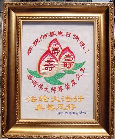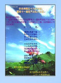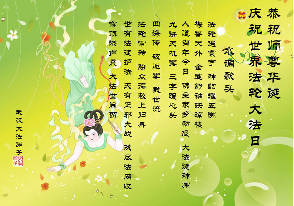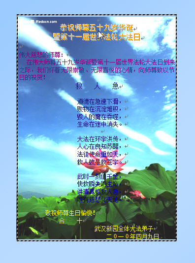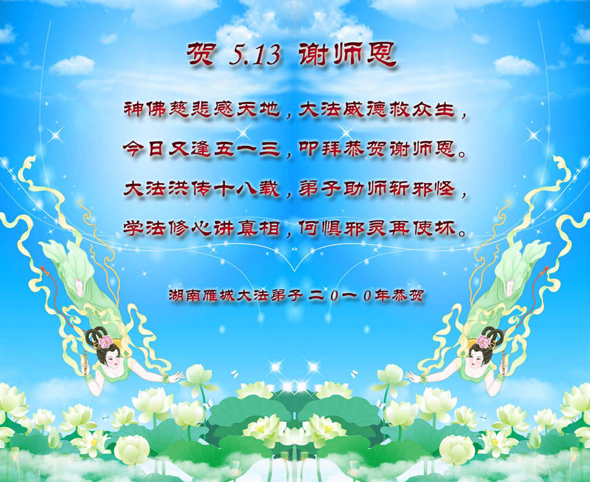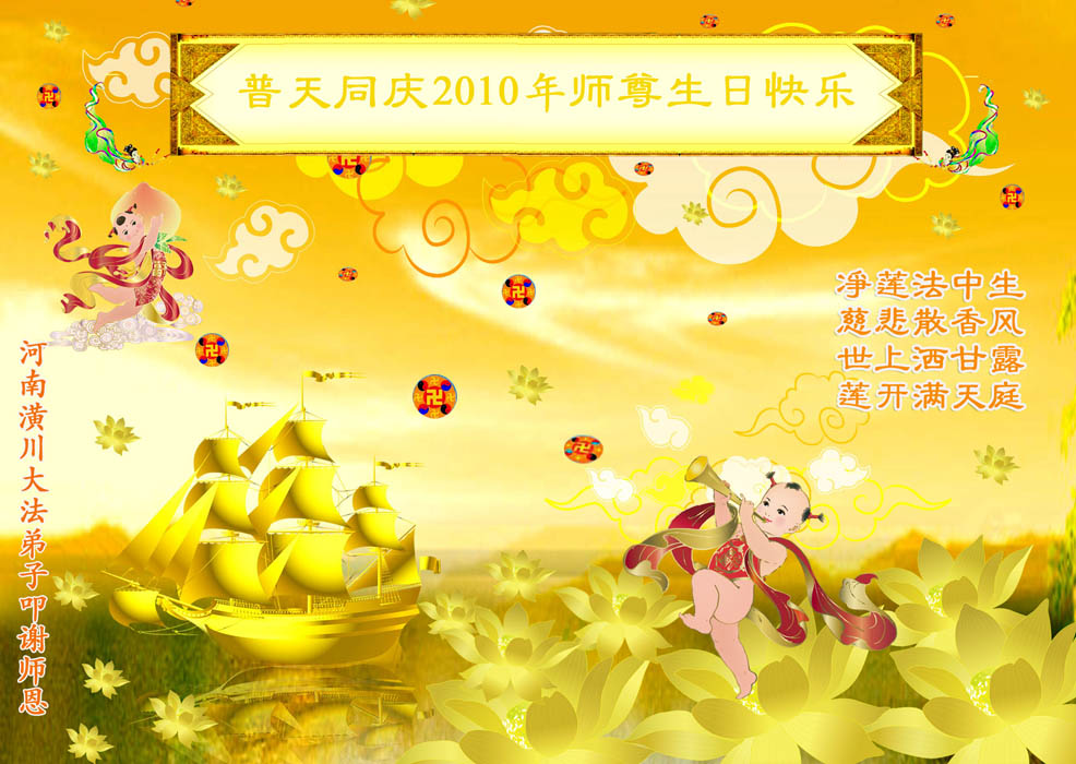 怀化大法弟子敬祝师尊生日快乐!江西九江大法弟子恭祝师尊生日快乐!祝贺5.13世界法轮大法日!湖南张家界地区全体大法弟子恭祝慈悲伟大的师尊生日快乐!同贺513世界法轮大法日!湖北大法弟子恭祝师尊生日快乐!河南驻马店二大法弟子恭祝慈悲伟大的师尊生日快乐!开封大法弟子恭祝慈悲伟大的师父华诞快乐!庆贺世界法轮大法日!五一三是不一般 主佛诞辰在这天 世界法轮大法日 天地同庆笑开颜 笑中深知责任大 重担压肩志不移 救人抢人第一位 功成圆满脑后事 紧跟师尊正法行 不出洪微不罢休 开封大法弟子敬上 2010年5月4日 湘潭大法弟子及亲属祝师尊生日快乐!全体黄石市大法弟子恭祝慈悲伟大的师尊生日快乐!我们今后会更加努力的做好师父要求的三件事,救度更多的众生,不辜负师尊的慈悲苦度。 河南宝丰地区全体大法弟子恭祝恩师生日快乐!慈悲伟大的师尊您辛苦啦!您为众生操碎了心!宝丰全体大法弟子在此叩拜恩师! 湖南长沙大法弟子一家三口恭贺师尊生日快乐!庆贺世界法轮大法日!河南洛阳全体大法弟子恭祝恩师生日快乐!请师尊相信我们一定在这修炼的最后时间里坚定的修好自己,更多的救度众生,不辞劳苦,无私无我!感谢恩师的佛恩浩荡! 洛阳全体大法弟子 2010.05.03 南阳大法弟子庆贺师尊华诞暨世界法轮大法日!武汉市硚口区大法弟子恭贺师尊生日快乐!二零一零年五月三日 湖南省衡阳地区南岳衡山全体大法弟子恭贺师尊生日快乐!庆祝世界法轮大法日!河南郑州大法弟子庆祝世界法轮大法日!湖南安化县全体大法弟子恭祝师尊生日快乐!湖南衡阳市珠晖区全体大法弟子恭祝伟大慈悲的师尊生日快乐!祝贺第十一届世界法轮大法日暨法轮大法开传十八周年!武汉大法弟子恭祝师尊华诞!庆祝世界法轮大法日!水调歌头 法轮遍寰宇,神韵耀五洲。 梅香天外,金蓮翩舞映琼楼。 人道当年今日,佛主家乡初度,大法传神州。 九讲天机露,三字暖心头。 四海传,破迷雾,截世流。 法轮常转,盼众得救上归舟。 世有法徒护法,天有正邪大战,戏尽法网收。 穹顶洪声震,大法世间留。 武汉大法弟子恭祝慈悲伟大的师尊生日快乐!普天同庆世界法轮大法日!大陆湖北大法弟子贺恩师华诞!随师回天庭(贺恩师华诞) 辗转轮回数千载, 只等师父把法传, 人生难得莫倦怠, 精進实修登法船。 西来幽灵祸神州, 中原大地妖风作, 造假、诬陷谤天法, 欺世大谎黑云压。 恩师正法度众生, 法徒坚修随师行, 讲真相,发正念, 酷刑迫害意更坚。 众生得救苍穹正, 大法众徒谢师恩, 比学比修向内找, 圆容整体回天庭。 大陆湖北大法弟子 2010年4月19日 南昌市抚河两岸全体大法弟子恭祝师尊生日快乐!圣王下世来,天地佛光显。 四海播善种,五洲传法音。 传法十八载,苦心度众归。 师尊华诞日,普天同庆祝! 2010年5月6日 河南周口大法弟子祝师父生日快乐!我们不辜负师尊慈悲苦度,勇猛精進,随师回家。 江西九江大法弟子恭祝师父生日快乐!对联: 上联: 尊师传大法宇宙众生得救度 下联: 法徒兑誓约乾坤万物获新生 横批: 师恩浩荡 上联: 无私无我弃名弃利除邪恶 下联: 存公存道崇真崇德倡善良 横批: 乾坤泰平 上联: 无求自得炼就金刚体 下联: 有意天成修得清净心 横批: 天人合一 湖南耒阳全体大法弟子普天同庆世界法轮大法日!恭贺师尊华诞辰日快乐!忆师恩,普天同庆世界法轮大法日,法正洪穹开新宇,心似潮涌。 谢师恩,恭贺师尊华诞,唯有精進,再精進,圆满随师还。 湖南耒阳全体大法弟子叩敬 二零一零年五月六日 河南信阳市四人学法小组祝师尊生日快乐!助师正法 师尊传法正大穹 正天正地度众生 弟子助师世间行 精進实修功法成 铲除邪恶排干扰 揭露谎言救众生 昔日洪愿今兑现 功成圆满随师还 河南信阳市四人学法小组 2010年5月6日 暂住湖南衡阳一家三口大法弟子恭贺师尊华诞与世界法轮大法日!全黄冈大法弟子祝贺伟大师尊生日快乐!我们决心紧跟师尊的正法進程,做好三件事,走好最后的路。 全黄冈大法弟子 二零一零年五月六日 河南襄县全体大法弟子恭祝师尊五十九华诞暨大法洪传十八周年!南阳大法弟子恭祝伟大的师尊生日快乐!普天同庆颂师恩, 弟子净心盼师尊。 时刻不忘下世愿, 精進实修救世人。 湖南华容大法弟子、湖南钱粮湖二分场十队大法弟子恭祝伟大师尊生日快乐!庆祝法轮大法日!武汉地区大法弟子恭祝慈悲伟大的师尊生日快乐!慈悲伟大师尊:我们中国大陆的大法弟子有千言万语要对您说,可是不知从何说起。在您华诞之日惟有献上一只心中的歌《师父您好!》用来表达我们《谢师恩》的心意。 《谢师恩》 愚迷红尘不知晓, 师传大法方悟道, 真觉渐启迷中醒, 每念师尊泪如涛。 众生罪业您独自消, 天上人间苦操劳, 浩瀚苍穹传大道, 法正乾坤洪愿了。 师父,您好! 法轮大法好! 慈悲浩荡佛光照, 弟子兑誓约, 亿万轻舟扬, 助师正法, 随师归处高。 武汉地区大法弟子敬上 湖南省郴州市大法弟子祝慈悲伟大的师父生日快乐湖南溆浦全体大法弟子恭贺师尊华诞!普天同庆世界法轮大法日!河南灵宝大法弟子恭贺师尊生日快乐!武汉大法弟子恭贺师尊华诞并庆祝世界法轮大法日!河南许昌全体大法弟子恭祝慈悲伟大的师尊华诞!普天同庆第十一届世界法轮大法日!师尊您好!师尊您辛苦了!河南郑州大法弟子恭贺师尊华诞暨世界法轮大法日!河南洛阳大法弟子恭贺