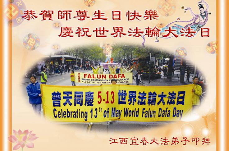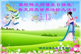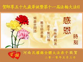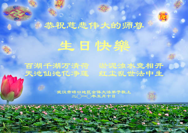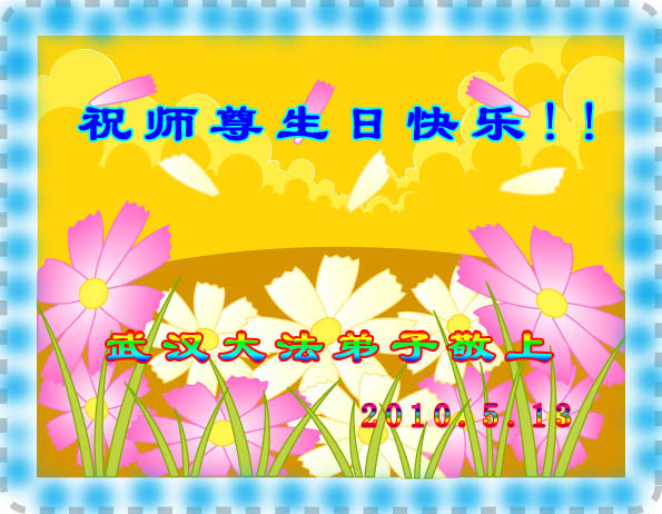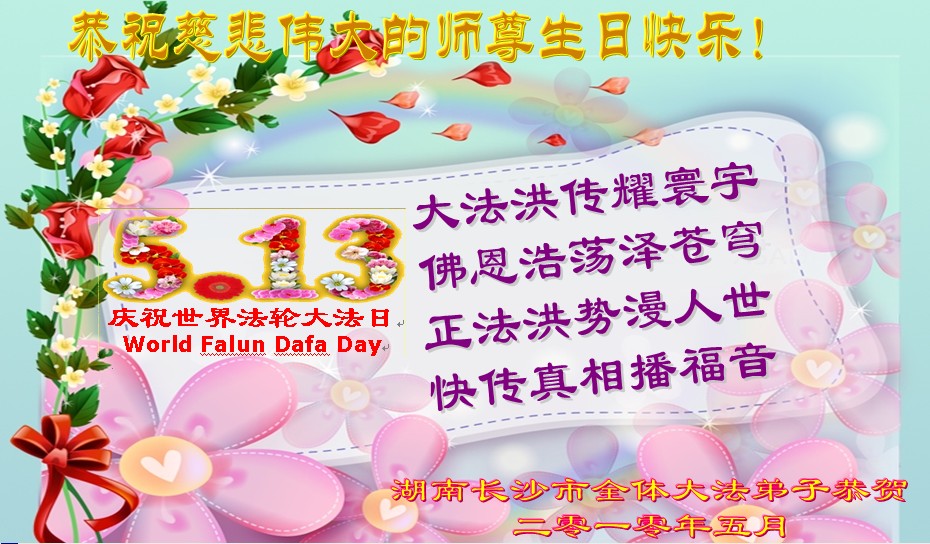 【明慧网二零一零年五月十二日】(明慧记者报道)今日发表的,是中国大陆华北逾200地区、东北130地、西北逾50地、华中150地、华南、华东150地、其它各类逾330地,军队系统、政府部门、教育系统等各行各业、各年龄层大法弟子通过明慧网发给李洪志师父和“5.13”世界法轮大法日的祝贺。这里是明慧编辑部已整理出来的华中地区150地来信汇编:河南民权县全体大法弟子贺师尊华诞暨法轮大法日!江西九江县大法弟子敬祝慈悲伟大的师尊生日快乐!江西九江大法弟子敬祝慈悲伟大的师尊生日快乐!河南商丘大法弟子敬祝慈悲伟大的师尊生日快乐!武汉新园全体大法弟子祝师尊生日快乐!湘潭大法弟子祝师尊生日快乐!我们日夜想念您! 湖北省地质全体大法弟子祝贺师父五十九华诞!伟大的师尊:您好!您为我们操劳辛苦了啊!面对您,我们心里有说不完的喜悦!在正法时期,我们坚定信念跟着您的步伐走才是正确的。我们在迫害中受尽折磨,是那共产邪灵附体造成的。我们不承认旧势力的安排。有师在有法在,就是根本的路。《转法轮》中说到“什么神,什么佛,什么道,什么魔都别想动了我的心”,我们坚如磐石,绝不向邪恶妥协。我们是正法中的法粒子,是来维护法,保护法,同化法的。救度众生,讲清真相,说到做到就是我们的标准。 湖北省地质全体大法弟子 江西九江全体大法弟子恭祝师尊生日快乐!普天同庆世界法轮大法日!湖北省云梦县全体大法弟子恭祝慈悲伟大的师尊生日快乐!普天同庆世界法轮大法日!湖北荆州市全体大法弟子敬贺慈悲伟大的师尊生日快乐!庆贺法轮大法洪传十八周年!湖北荆州市荆州区各学法小组的大法弟子恭祝慈悲伟大的师尊生日快乐!庆贺法轮大法洪传十八周年!河南省唐河县全体大法弟子恭祝慈悲伟大的师尊生日快乐!世界法轮大法日湖南衡阳大法弟子向师尊问好!敬爱的师尊:您好! 五月十三日是全世界法轮大法日,在此我们怀着崇敬的心情向师尊问好!同时,祝全世界的同修们更加精進,形成一个整体,努力做好三件事,助师正法,完成我们的史前大愿! 湖南衡阳大法弟子 2010年5月13日 郑州市一家老少八位大法弟子恭祝慈悲伟大的师父生日快乐!并祝贺法轮大法日!谢谢师父慈悲呵护!我们一定做好三件事,唯愿师尊笑。我们总会迎来普天同庆的一天! 郑州市一家老少八位大法弟子敬上 江西九江夫妻同修恭祝师尊华诞!师尊您好!湖南长沙市全体大法弟子敬祝师尊生日快乐!祝法轮大法洪传十八周年!谢谢师尊慈悲苦度!弟子们一定听师尊的话,学好法,多救众生!回报师尊的救度之恩! 湖南长沙市全体大法弟子 二零一零年四月二十八日 河南遂平全体大法弟子恭祝慈悲伟大的师尊生日快乐!慈悲的师父啊!您为救度众生日夜操劳,您那洪大的慈悲,宽广的胸襟,弟子每每想起感激涕零,您的洪恩弟子难以回报!弟子从开始修炼到如今十几年,在您的慈悲呵护下渐渐走向成熟,没有师尊那洪大的慈悲就没有弟子们的现在和将来!唯有学好法,修好自己,做好三件事,救度更多迷中众生。师恩难报,紧跟师尊正法到底。师尊啊!弟子们想念您,盼望早日见到师尊!再一次祝师尊生日快乐!!! 河南遂平全体大法弟子 2010年4月28日 武汉大法弟子恭祝师尊生日快乐!湖南省洪江市大法弟子敬祝慈悲伟大的师尊五十九岁华诞生日快乐!祝全世界同修法轮大法日快乐! 献给“5,13”全世界法轮大法日 “5,13”慈悲伟大师尊生日 “5,13”全世界法轮大法日 平凡中显现惊奇 遍苍穹生命瞩目 从未有过的大法洪传 从未有过的师恩浩荡 开天辟地修者正法 正邪大战震撼环宇 今天 法度众生师导航 亿万弟子救人忙 与师同在 与法同在 无比殊胜 无比荣耀 无论迫害多么严重 信师信法坚修不动 无论身在何方 大法粒子都绽放光芒 无论做何种项目 兑现史前誓言都无怨无悔 无论世人听与不听 都把福音传送 慈悲心 传《·九·评*》 揭谎言 发正念 清烂鬼 讲真相 救众生 修心断欲 返本归真 持之以恒 道德回归 人心向善 众生有救 师尊微笑 环宇生辉 湖南省洪江市大法弟子敬献 二零一零年四月二十三日 湖北武穴大法弟子恭祝师尊生日快乐!郑州大法弟子敬祝伟大师父生日快乐!下大穹 洗尘 我随师父下大穹 师父领我救众生 人世轮回数千载 奠定中华古文明 众生轮回把法等 得法随师回大穹 今日师父传大法 莫失机缘误众生 咸宁大法弟子恭祝师尊生日快乐!河南潢川大法弟子恭贺师尊生日快乐!湖南省攸县全体大法弟子向尊敬的师父祝寿:恭祝师尊五十九岁华诞生日快乐!欢庆世界法轮大法日!黄石全体大法弟子恭贺师尊华诞!庆贺世界法轮大法日!正法开传十八春 善化万物救世人 九九狂魔从天降 法徒慈慈济世行 十年如一讲真相 浓雾恶浪法导航 忍苦得乐容万事 遍地梅莲吐芬芳 又逢佳节五一三 感念师恩泪盈盈 待到法正人间日 四海欢庆迎主尊 黄石全体大法弟子齐跪拜 2010年4月23日 湖北孝感一学法小组全体大法弟子恭贺师尊华诞和世界法轮大法日!时值第十一届世界法轮大法日和师尊五十九周岁寿诞之际,我们学法小组全体大法弟子给慈悲伟大的师尊拜寿!敬祝师尊生日快乐!并热烈庆贺第十一届世界法轮大法日的到来!虽然最后的路越来越窄、越来越险、越来越难走,但我们有决心在大法的导航和师尊的呵护下,一如既往坚定不移的继续做好三件事,力争救度更多的世人,圆满跟师父回家!全
