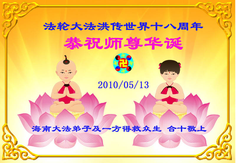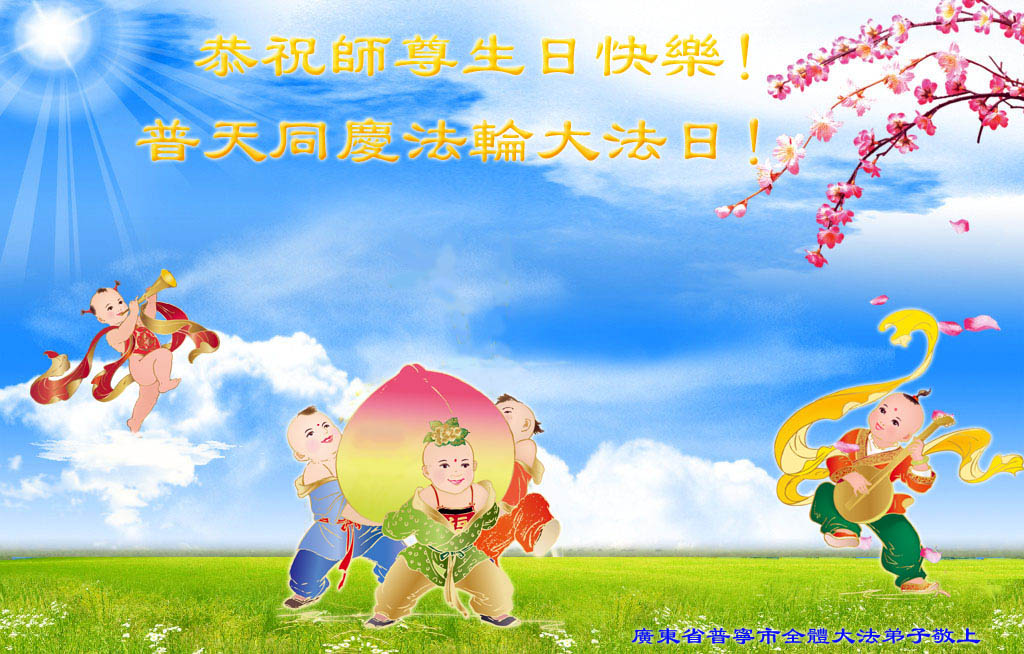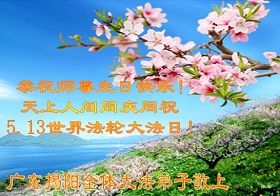 【明慧网二零一零年五月十二日】(明慧记者报道)今日发表的,是中国大陆华北逾200地区、东北130地、西北逾50地、华中150地、华南、华东150地、其它各类逾330地,军队系统、政府部门、教育系统等各行各业、各年龄层大法弟子通过明慧网发给李洪志师父和“5.13”世界法轮大法日的祝贺。这里是明慧编辑部已整理出来的华南地区80地来信汇编:揭阳市全体大法弟子恭祝师尊生日快乐!庆祝5.13世界法轮大法日!广东省普宁市全体大法弟子恭祝师尊生日快乐!同时祝贺全世界法轮大法日!弟子们谢谢师尊的慈悲苦度!无论还有多长时间,弟子们坚信大法的心已不会动摇!在这值千金、值万金的宝贵时间里,弟子们会互相鼓励,精進再精進!向师尊双手合十!