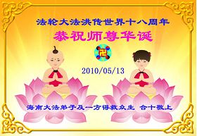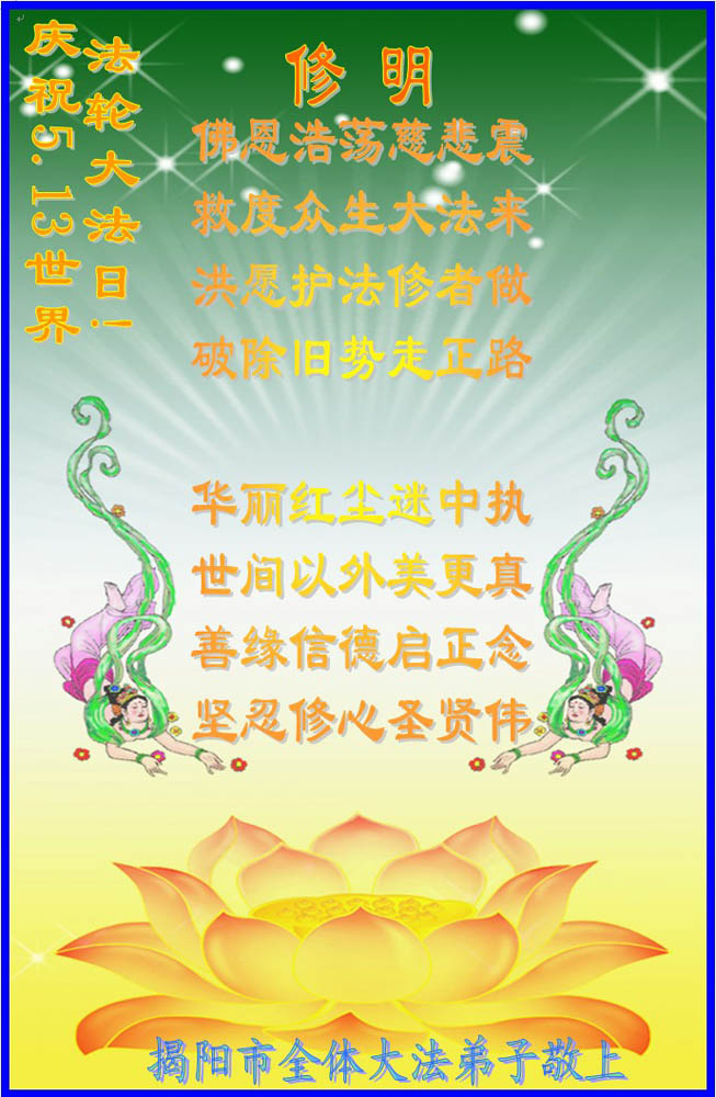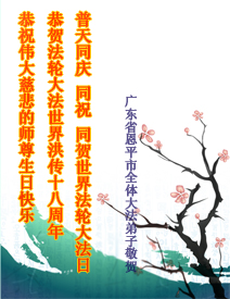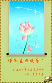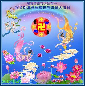 桂林全体法轮大法弟子恭祝师尊生日快乐!广东揭阳全体法轮大法弟子恭祝师尊生日快乐!广东揭阳大法弟子恭祝师尊生日快乐!广东汕头一家四大法弟子恭祝师父生日快乐!得法十几年 修心不迟疑 静心学大法 方知世人迷 去掉执著事 轻舟快如飞 恶浪风云变 迫害众法徒 随师正念足 立掌灭邪灵 做好三件事 世间佛道神 恰逢大法日 同表救赎恩 2010年4月24日