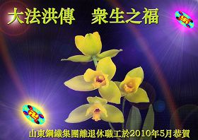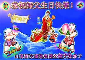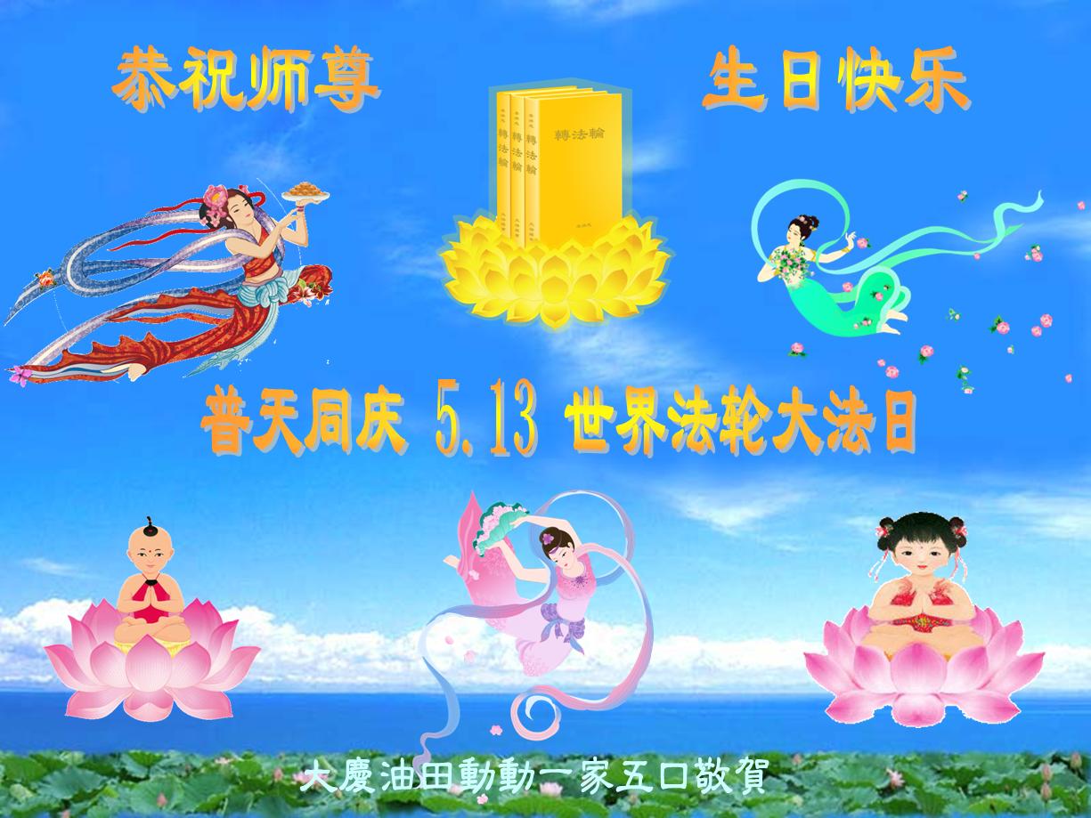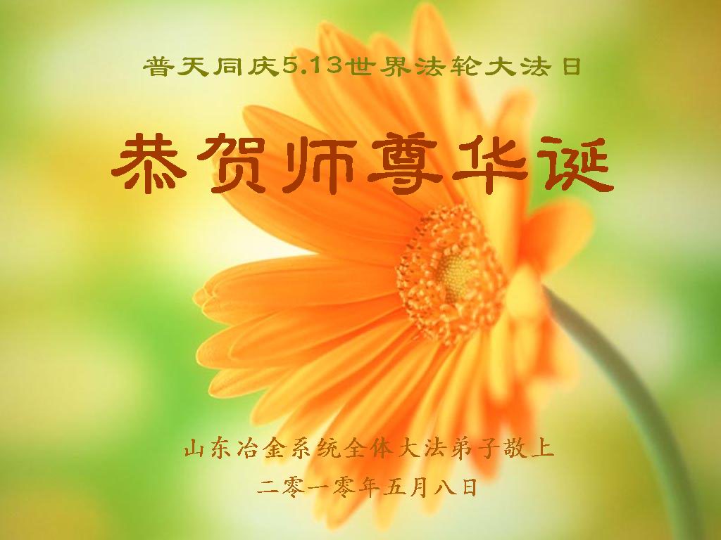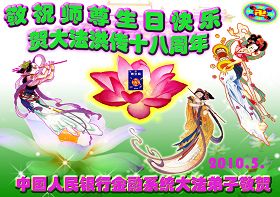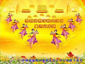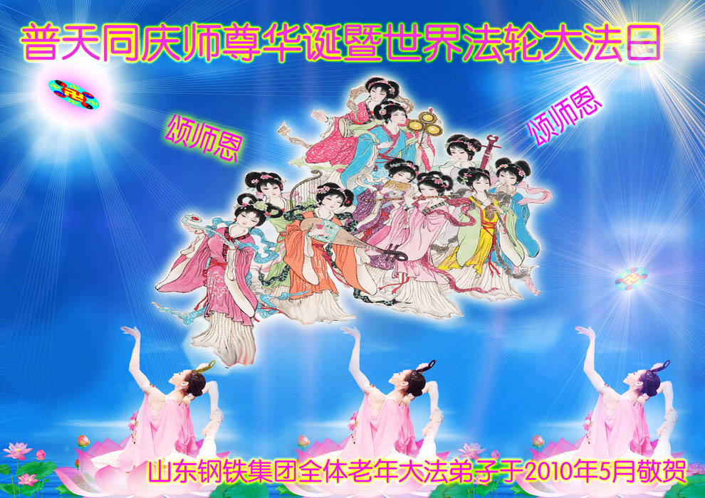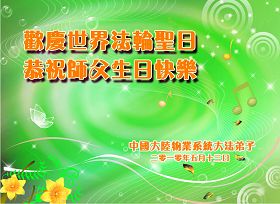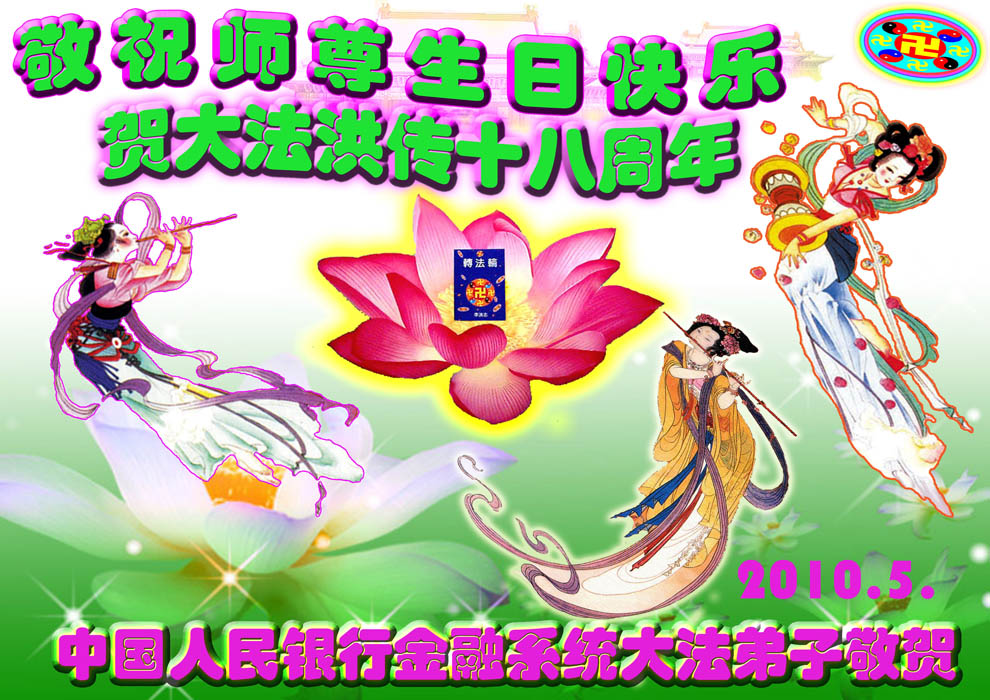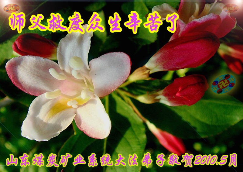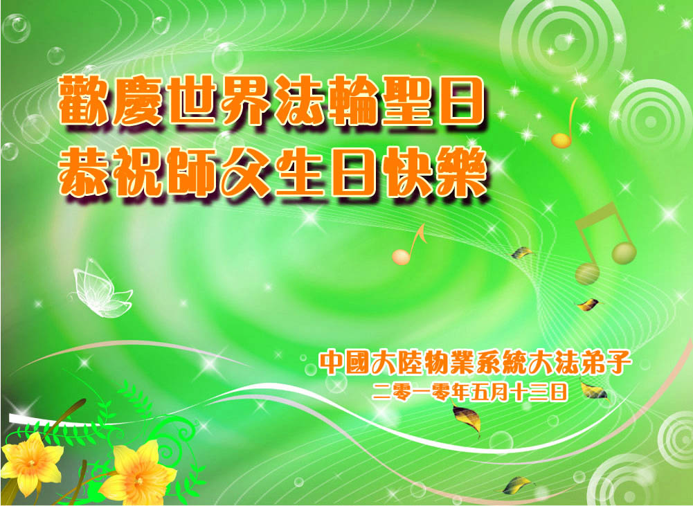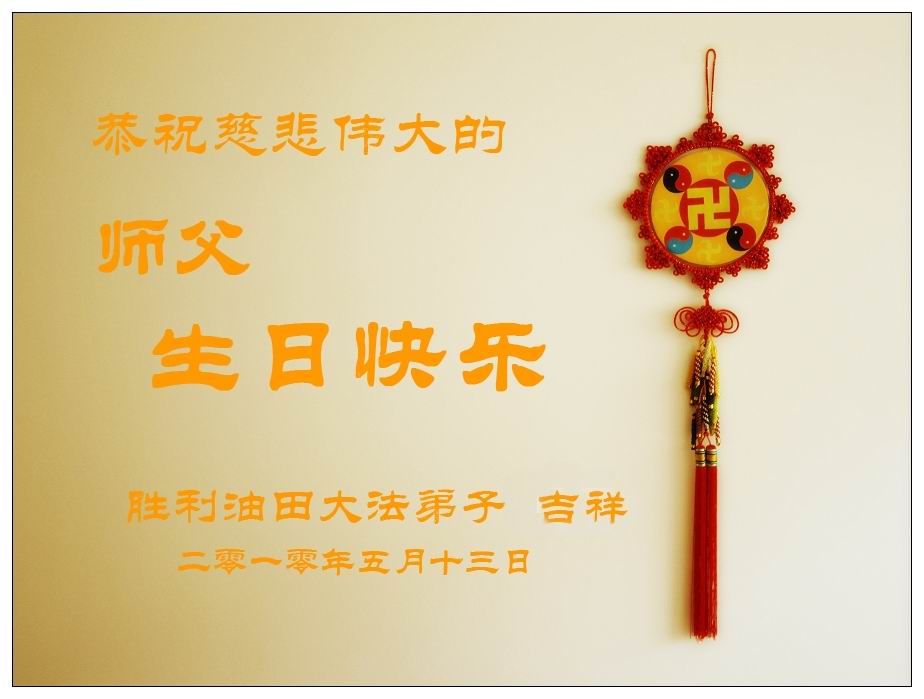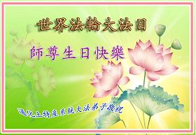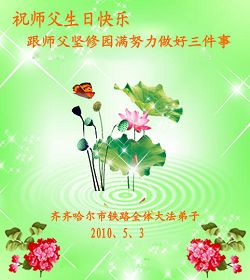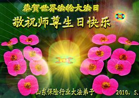 【明慧网二零一零年五月十二日】黑龙江农垦克山农场全体大法弟子祝师尊生日快乐!庆贺法轮大法日!广东农垦系统大法弟子祝师父生日快乐!大庆龙南所有大法弟子和所有医院大法弟子祝慈悲伟大的师尊生日快乐!安徽省宣传系统大法弟子恭祝慈悲伟大的师尊生日快乐!普天同庆世界法轮大法日!胜利油田大法弟子恭祝师尊生日快乐!山西大同铁路全体大法弟子祝慈悲伟大的师尊生日快乐!在我们助师正法救度众生的路上,愿师父多一些欣慰,少一些担忧! 中国人民银行金融系统全体大法弟子跪拜师尊!恭祝师尊生日快乐!弟子一定听师尊的话,做好三件事,让师尊少一份操劳,多一份欣慰。 山东交运集团大法弟子跪拜师尊!恭祝师尊生日快乐!敬请师尊放心,弟子一定珍惜这万古不遇的机缘,做好三件事,圆满随师还! 山西大同煤矿集团晋华宫矿、云岗矿、四台矿、燕子山矿及云岗周边地区全体大法弟子恭祝师尊生日愉快!在我们助师正法救度众生的修炼路上,唯愿师尊笑! 成都铁路局全体大法弟子恭祝师尊华诞!恭颂大法洪传十八周年暨世界法轮大法日!铁路系统大法弟子敬贺师尊华诞及大法传世十八周年暨世界法轮大法日!山东保险行业大法弟子跪拜师尊!恭祝师尊生日快乐!弟子一定多学法,向内找,圆容整体,多讲真相,救度更多的众生,圆满随师还! 国家工商行政管理总局系统全体大法弟子恭祝慈悲伟大的师尊生日快乐!祝贺慈悲伟大的师尊传法18周年和第11个世界法轮大法日!山东钢铁集团全体大法弟子跪拜师尊!恭祝师尊生日快乐!敬请师尊放心,弟子一定将大法的福音传给世人,给众生一个选择自己未来的机会。 胜利油田大法弟子恭祝师尊生日快乐!庆祝世界法轮大法日!青岛金融系统大法弟子恭祝师尊生日快乐!今天是个伟大的日子,主佛降临到这个世间;为众生历经千难万险,把佛法尽撒人间。 我有幸与大法接缘,心感责任重大在肩;讲真相救世人为先,珍惜利用好每一天。愿我们的师尊笑脸常开。 二零一零年五月十三日 中国大陆物业系统大法弟子恭祝师父生日快乐!欢庆世界法轮大法日!河南省律师行业工作人员谢谢李大师!恭祝李大师生日快乐!山东保险行业大法弟子敬祝师尊生日快乐!弟子对师尊的感激无以言表,唯有精進实修,做好三件事,兑现史前誓约,圆满随师还! 山东钢铁集团离退休职工恭祝师尊生日快乐!弟子一定听师尊的话,做好三件事,圆满随师还! 山东煤炭矿业系统大法弟子恭祝师尊生日快乐!师恩浩荡,弟子无法表达对师尊的感激,得救的众生谢谢! 佳木斯铁路地区学法小组恭贺慈悲伟大的恩师华诞快乐!庆贺师尊洪传法轮大法十八周年!迎接第十一届世界法轮大法日!在这大喜大庆的日子里,我们更加想念远在大洋彼岸为大法弟子与众生日夜操劳的恩师,您辛苦了!用千言万语千歌万曲颂不尽师恩浩荡,只有在证实法的金光大道上我们精進再精進。请师父放心,我们万分珍惜您给我们留下这宝贵的时间,踏踏实实的做好“三件事”,“以法为师”走正今后的路。肩负起大法弟子的神圣使命,遵照师尊的嘱托“做的更好,效率更高,影响更大,救人更多”。完成我们的史前大愿。 法轮大法好, 佛光普天照。 正法十八年, 师尊最辛劳。 慈悲造大穹, 功德无量高。 大穹法光照, 乾坤朗朗笑。 众生齐欢庆, 法轮大法好。 佳木斯铁路地区大法弟子 二零一零年五月三日 山东钢铁集团全体大法弟子恭祝师尊生日快乐!弟子一定谨记师尊的教诲,遇事向内找,不受任何干扰,做好三件事,让更多的众生得救! 山东钢铁集团新得法的大法弟子恭祝师尊生日快乐!弟子一定万分珍惜这万古机缘,学好法,将大法的福音传给世人,让更多的生命得救! 农垦系统某三分场学法炼功点全体大法弟子跪拜师尊!在世界法轮大法纪念日之际,农垦系统某三分场学法炼功点全体大法弟子跪拜师尊,谢谢救度之恩,在师父的呵护下走到了今天,还请师尊放心。我们一定要努力做好三件事,圆满随师还。 大陆门卫系统全体大法弟子恭祝师尊生日快乐!恭庆法轮大法日!山东兖矿集团俩人学法小组叩拜师尊生日快乐!恭庆法轮大法日!中国大陆铁路系统大法弟子恭贺师尊59华诞!庆祝法轮大法传世十八周年!热烈祝贺世界法轮大法日!在这正法的最后时刻,我们一定要严格要求自己,努力做好三件事,完成我们的史前大愿,不辜负师尊对我们的慈悲苦度。 青海石油局、油田公司全体大法弟子恭祝慈悲伟大的师尊生日快乐!庆贺大法洪传十八周年暨世界法轮大法日!在这喜庆之时,青海石油局、油田公司全体大法弟子谨遵师尊的教诲,经常查找自身不足,彻底去掉骨子里隐藏的为私为“我”的观念,共同精進,容入法中,纯正心态,做好三件事,走好正法的每一步。 2010年5月4日 郑州铁路局全体大法弟子恭贺师尊59华诞!庆祝世界法轮大法日!弟子们一定会走好最后的路,抓紧救度众生,完成自己的史前大愿,不辜负师尊的慈悲苦度和众生的期盼,圆满随师还。 山东卫生系统大法弟子跪拜师尊!敬祝师尊生日快乐!弟子一定多学法,互相圆容,互相补充,理智清醒的走到最后,让更多的众生感受到佛恩浩荡,不再受邪恶的蒙蔽和毒害,从邪恶的谎言中解脱出来! 山东新汶矿业集团全体大法弟子跪拜师尊!恭祝师尊生日快乐!弟子无法用语言来表达对师尊的感激,唯有多学法,精進实修,让师尊多一份欣慰,少一份操劳。 四川电力系统全