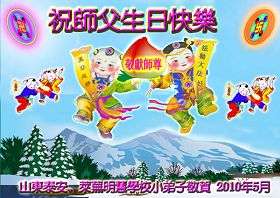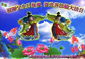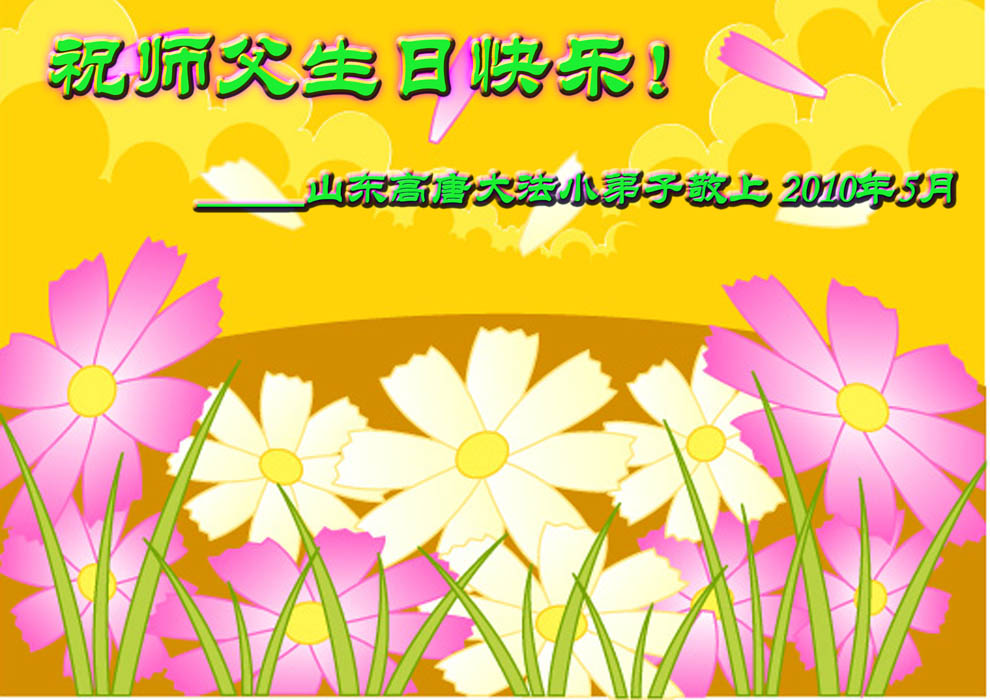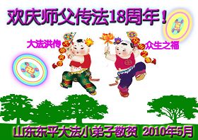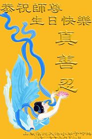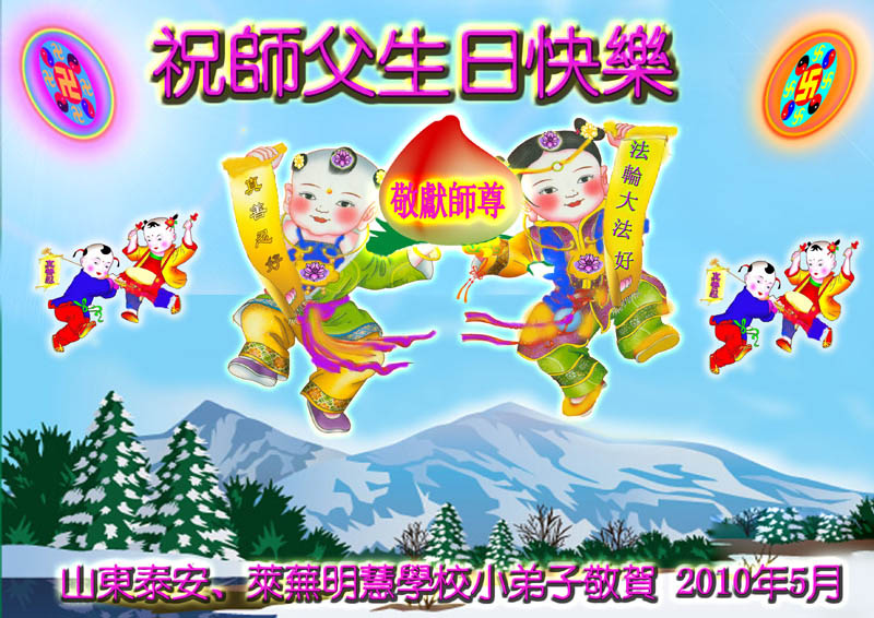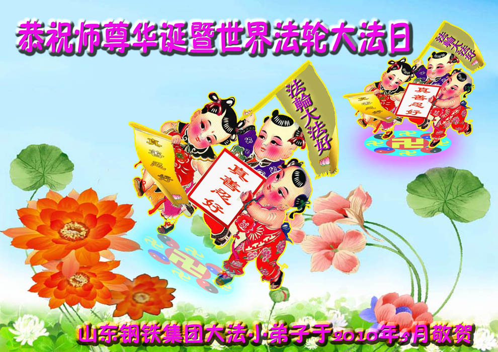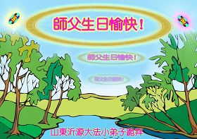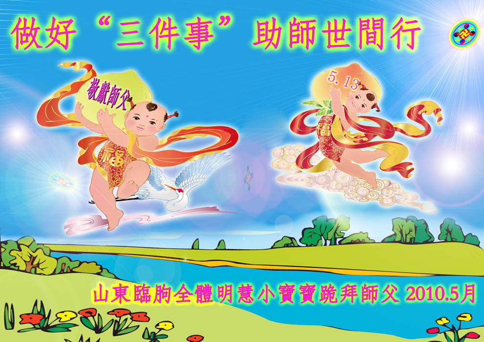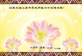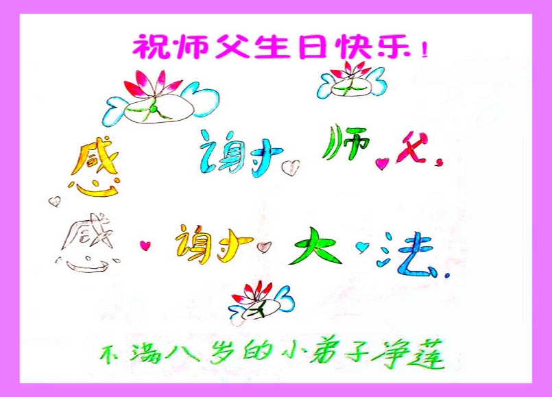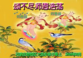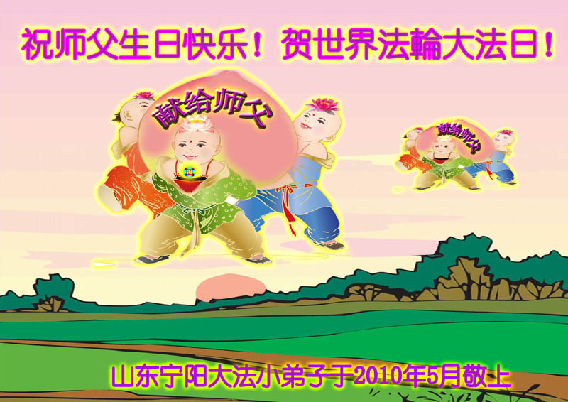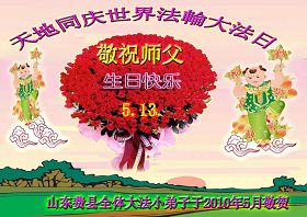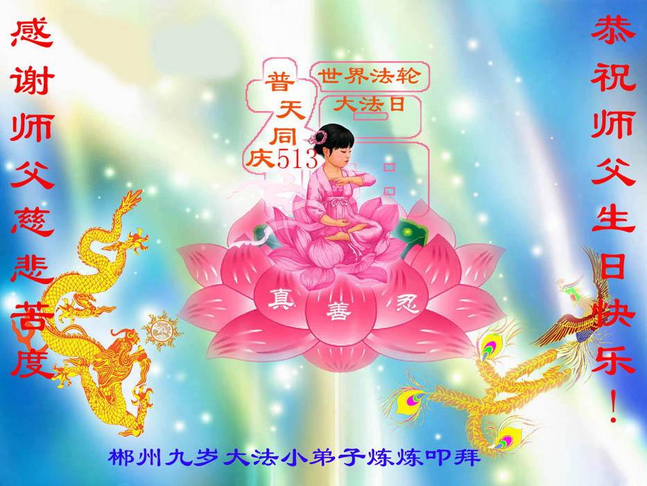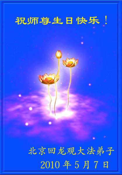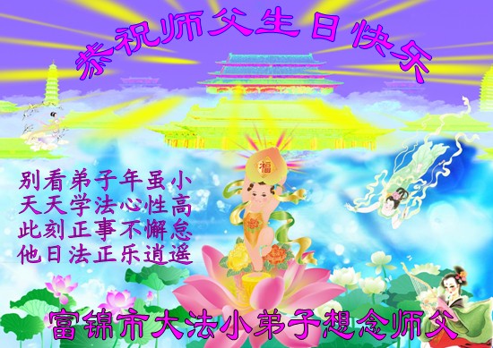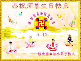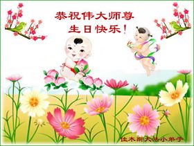 【明慧网二零一零年五月十二日】一个十二岁大陆大法小弟子的祝愿十八个春秋是谁带我们走过?一年又一年,是谁为我们操尽了心血?是谁带我们走上了这条回家的路?我问天,是谁在救度世间的众生?天点头;又问地,是谁铺出了这条让众生回家的路?地也点头;问遍万物,得到的答案只有一个,他就是那慈悲的主,我们伟大的师父。三千年一开的婆罗花终于盼来了他,绽开了甜美的笑脸。天上的众生在盼着,地上的万物在等着。法正人间的时刻即将到来,只有迷在这尘世间的我们还迟迟未懂。 师父啊,谢谢您,带我回家! 法轮大法好、真善忍好! 大陆大法小弟子:佳佳 2010年4月25日 黑龙江大法小弟子祝师尊生日快乐!我们一定做好三件事。北京市一大法小弟子祝师父生日快乐!我是一名来自北京市石景山区的大法小弟子。师父您好!师父辛苦了!弟子盼望您,想念您。 十一年前,我四岁,妈妈便经常在我旁边学法、炼功,也经常读一些经文给我听。我真正得法是在三年前,我很幸运。我努力做好三件事,有时去街上发真相资料,把妈妈印的不干胶贴在公交车上。现在我初三快毕业了,我坚持不入团,而且劝同学们不入团,也劝那些入了团的同学退*团-。我还给同学们讲真相,救度他们。感谢师父的慈悲救度,弟子一定会更加精進,跟随师父走好最后的路。 山东莱芜大法小弟子跪拜师尊!敬祝师尊生日快乐!请师尊放心,弟子一定听师尊的话,做好三件事,救度更多的世人。 山东肥城大法小弟子跪拜师尊!恭祝师尊生日快乐!弟子一定听师父的话,好好学法,讲真相,多救众生。 安徽省合肥市全体大法小弟子恭祝慈悲伟大的师尊生日快乐!普天同庆世界法轮大法日!湖南省岳阳市平江大法弟子、大法小弟子恭祝师尊生日快乐!重庆琪琪小弟子恭祝师父生日快乐!黑龙江大法小弟子祝师尊生日快乐!我们一定做好三件事。辽宁鞍山九岁大法小弟子如蜜儿祝慈悲伟大的师尊生日快乐!敬献小诗一首: 法轮大法好 我是大法小弟子, 善恶有报记心间。 恶人干扰有恶报, 好人得法福运到。 时刻记住大法好, 诚念九字能保命。 我们不要被干扰, 做事人人有正念。 大难来时神保命, 恶党破坏就遭殃。 讲真相,救众生。 法船起航回天去。 辽宁鞍山九岁大法小弟子如蜜儿敬上 2010年4月25日 黑龙江省北安市全体大法小弟子祝师尊生日快乐!同贺世界法轮大法日!以前没做好的地方一定改正,今后一定努力学法,做好三件事,不辜负您的重望,请师尊放心。 江苏连云港大法小弟子恭祝师尊华诞!河北平泉四岁大法小弟子及全家恭祝慈悲伟大的师尊生日快乐!并祝贺五月十三世界法轮大法日!黑龙江大法小弟子祝师尊生日快乐!江苏大法小弟子恭祝师尊华诞快乐!旅捷华人大法弟子及小弟子恭贺慈悲伟大的师尊华诞!普天同庆世界法轮大法日!保定大法小弟子祝师尊生日快乐!我们定会做好三件事,持之以恒,让师父少些操劳,多些欣慰,请师父放心! 一大法小弟子祝师父生日快乐!招远市大法小弟子恭祝师尊生日快乐!恭贺世界法轮大法日!辽宁营口地区大法弟子及大法小弟子恭贺师尊五十九岁华诞!大法弟子带着师尊的重托,承载着大法赋予的历史使命,走着师尊安排的成就各天体大神的修炼之路,穿越的是苍宇劫,历经的是洪穹巨难,救度的是大穹天体宇宙三界及人间一切众生,成就的是新宇大洪恒古圆容机制的一部份。兑现自己的誓约,与师尊的新宇同在。 辽宁营口地区大法弟子敬上 揭阳大法小弟子恭祝师尊生日快乐!庆祝法轮大法日!宝鸡大法小弟子恭祝慈悲伟大的师尊生日快乐!滦南大法小弟子恭祝伟大的师尊生日快乐!在今后的日子里,弟子一定会勇猛精進,不辜负师尊的期望,跟师尊回家! 山东泰安、莱芜明慧小弟子敬祝师尊生日快乐!请师尊放心,弟子一定学好法,精進实修,跟师尊回家! 塔河大法小弟子祝师尊生日快乐!三位大法小弟子跪拜师尊!敬祝师尊生日快乐!弟子一定听师尊的话,学好法,向世人讲真相,让更多的世人明白真相,让更多的众生得救。 山东东平大法小弟子敬祝师尊生日快乐!请师尊放心,弟子一定多向世人讲清真相,救度更多的生命。 延边大法小弟子叩拜恭贺师尊华诞!同庆5.13世界法轮大法日!我们小弟子一定修好自己,做好三件事,跟上师尊正法進程! 山东省莱阳市一大法小弟子恭祝慈悲伟大的师尊生日快乐!山东费县全体大法小弟子敬祝师尊生日快乐!弟子感谢师尊的慈悲救度!济南全体大法小弟子恭祝师尊世界法轮大法日快乐!弟子一定做好大法弟子应该做好的三件事,抓紧学法,发正念,讲真相,救度更多的世人,决不辜负师尊的慈悲苦度。谢谢慈悲伟大的师尊! 济南全体大法小弟子 2010年5月6日 大法小弟子雯雯祝师父生日快乐!山东临沭大法小弟子敬祝师尊生日快乐!弟子谢谢师尊慈悲救度!江苏连云港市大法小弟子恭祝师父生日快乐!四川北一学法点老年大法弟子携孙辈小弟子叩拜师尊,恭祝慈悲伟大的师尊生日快乐!暨贺世界法轮大法日!山东宁阳大法小弟子敬祝师尊生日快乐!弟子无法用世上的任何语言来表达对师尊的感激! 揭阳市全体大法小弟子恭祝师尊生日快乐!庆祝“五•一三”法轮大法日!上海大法弟子夫妇和九个月大的大法小弟子恭祝师尊生辰暨世界法轮大法日快乐!郴州九岁大法小弟子炼炼祝师父生日快乐!山东胶州大法小弟子恭祝师尊生日快乐!师父您辛苦了!在这天地同欢庆的日