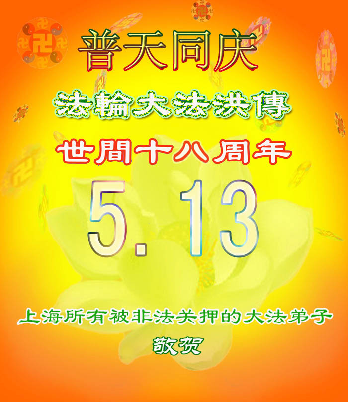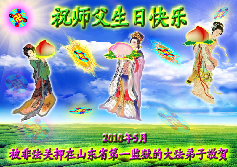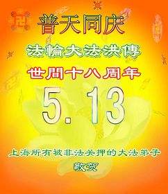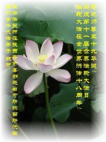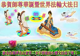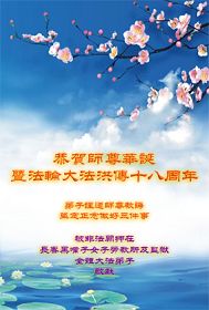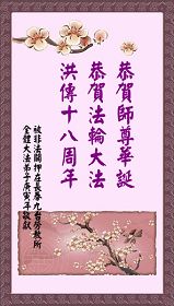 【明慧网二零一零年五月十二日】被非法关押在长春黑嘴子女子劳教所及监狱全体大法弟子恭贺师尊华诞暨法轮大法洪传十八周年!弟子谨遵师尊教诲,坚定正念做好三件事。 被非法关押在长春九台劳教所全体大法弟子恭贺师尊华诞暨法轮大法洪传十八周年!山东省寿光市被中共邪*党-非法关押在大陆监狱、劳教所、看守所、拘留所及洗脑班里的大法弟子恭祝慈悲伟大的师尊生日快乐!普天同庆世界法轮大法日!弟子想念慈悲伟大的师尊!请师父放心!邪*党-的打压不能磨灭我们精進修炼的决心!在任何艰难的环境下,都没有忘记自己是一个堂堂正正的正法时期的大法弟子!在任何艰难的环境下,都没有忘记自己作为正法时期大法弟子助师正法、救度众生的使命! 被邪恶非法关押在湖南常德武陵监狱的全体大法弟子敬祝师尊生日快乐!庆祝法轮大法洪传十八周年!我们虽然身在牢笼,心中有师尊、有大法,一定能坚定的跟师尊回家。 被邪恶非法关押在湖南省女子监狱的全体大法弟子敬祝师尊生日快乐!庆祝法轮大法洪传十八周年!弟子们想念师尊!谢谢师尊慈悲苦度! 被邪恶非法关押在湖南省新开铺劳教所的全体大法弟子祝师尊生日快乐!祝法轮大法洪传十八周年!师尊辛苦了!谢谢师尊慈悲苦度! 被邪恶非法关押在湖南省株洲白马垅劳教所的全体大法弟子向师尊问好!祝师尊生日快乐!祝法轮大法洪传十八周年!弟子们谢谢师尊的慈悲苦度! 达州市被非法关押的大法弟子恭祝慈悲伟大的师尊生日快乐!庆贺法轮大法洪传十八周年!被非法关押在河北省女子监狱的全体大法弟子恭祝慈悲伟大的师尊生日快乐!在魔窟之中迎来了大法弟子的三大节日,被非法关押在河北省女子监狱的全体大法弟子恭贺慈悲伟大的师尊59岁华诞!弟子们身陷魔窟之中,但心中却知道慈悲伟大的师尊每时每刻都在惦记着呵护着我们,海内外的同修们每天都在千方百计的营救着我们。由于弟子们修炼的不好,被邪恶钻了空子,自己遭受迫害不说,给大法造成了损失。但弟子们不会忘记师尊:“身卧牢笼别伤哀 正念正行有法在 静思几多执著事 了却人心恶自败”(《精進要旨》<别哀>)的谆谆教诲,坚守着自己心中的信念,发正念彻底解体邪恶的黑窝,堂堂正正的回到同修们的身边,不辜负师尊的慈悲苦度。 福州全体大法弟子恭祝慈悲伟大的师尊生日快乐!被非法关押的福州大法弟子恭祝慈悲伟大的师尊生日快乐!郫县全体大法弟子恭祝慈悲伟大的师尊生日快乐!热烈祝贺世界法轮大法日!在这普天同庆的日子到来之际,感谢师尊的慈悲苦度!是您把我们从地狱中捞出来,把我们从常人的名、利、情中拯救出来。教给我们做人的道理,使我们的思想得到了升华。可是我们离师尊的要求还有距离,我们还要在法中改变自己,更多的向内去修,去掉执著,做好大法弟子应该做的事,早日功成圆满。 郫县大法弟子 2010年04月29日 辽宁马三家教养院全体被非法关押的大法弟子恭祝师尊生日快乐!恭祝世界法轮大法日十一周年!我们想念师父!盼望早日闯出魔窟,汇入正法洪流,助师世间行。 河北省女所四大队被非法关押的全体大法弟子向伟大的师尊献上弟子最诚挚的问候!祝:伟大的师尊节日快乐! 我们一定会正念正行,回报伟大的师尊给予弟子的一切所有。 河北省女所四大队被非法关押的全体大法弟子 二〇一〇年四月二十九日 北京通州大法弟子全家及被非法关押在马三家劳教所和泰来监狱大法弟子恭祝慈悲伟大的师父生日快乐!庆祝五一三世界法轮大法日!江苏苏州地区大法弟子恭祝师尊生日快乐!祝贺法轮大法洪传十八周年!宋词 ——纪念法轮大法洪传十八周年 婆罗花开,圣王传法十八载。 《转法轮》传遍世界,法正乾坤。 亿万弟子得正法,师恩浩荡难报答。 齐欢呼,法轮大法好,魔头惊。 六一零,洗脑班,用酷刑,都不灵。 弟子正念足,邪恶全灭。 海外法庭抓魔头,众院决议点死穴。 天要变,谁能挡的住,快清醒。 江苏苏州地区大法弟子 二零一零年五月一日 被非法关押在山东省第一监狱的大法弟子祝师父生日快乐!弟子一定谨记师尊的教诲,绝不向邪恶低头! 被非法关押在山东省第一女子劳教所的全体大法弟子恭祝师尊生日快乐!贺世界法轮大法日!敬请师尊放心,无论邪恶如何疯狂,弟子坚修大法的心也不会变! 被非法关押在山东第二女子劳教所的全体大法弟子恭祝师尊生日快乐!请师尊放心,无论邪恶如何猖狂,弟子坚修大法的心也不会动摇! 被非法劳教的广州大法弟子五人恭贺师父生日快乐!被非法关押在陕西省渭南监狱的全体大法弟子恭祝慈悲伟大的师尊生日快乐!普天同庆世界法轮大法日!被非法关押在陕西省女子监狱的全体大法弟子恭祝慈悲伟大的师尊生日快乐!普天同庆世界法轮大法日!被非法关押在陕西省女子劳教所的全体大法弟子恭祝慈悲伟大的师尊生日快乐!普天同庆世界法轮大法日!被非法关押在陕西省枣子河劳教所的全体大法弟子恭祝慈悲伟大的师尊生日快乐!普天同庆世界法轮大法日!被非法关押在陕西省西安市洗脑班的全体大法弟子恭祝慈悲伟大的师尊生日快乐!普天同庆世界法轮大法日!被非法关押在陕西省看守所、拘留所的全体大法弟子恭祝慈悲伟大的师尊生日快乐!普天同庆世界法轮大法日!被非法关押的吉林省全体大法弟子恭贺师尊华诞!被非法关押在吉林监狱全体大法弟子恭贺师尊华