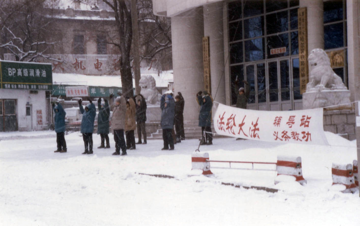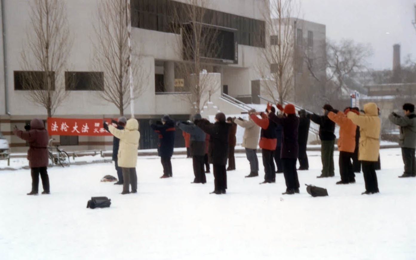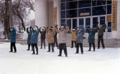 | 【明慧网二零一零年五月十三日】一九九四年八月初,我有幸参加了法轮功创始人李洪志师父在哈尔滨八区体育场冰球馆举办的讲法班。在班上,师父讲了许多如何做人、重德、向善、按真、善、忍做好人的道理。每次讲课时,师父只拿一张需要讲什么的纸,没有教科书,没有教案,一切成竹于胸。讲课中,师父引述了天文、地理、历史、物理、化学、生命科学等许多学科的知识,也列举了生活中的许多例子作类比说明,让我觉得师父的知识很渊博,同时也使我认识到人生的真正目地和意义。 这次讲法班中哈尔滨的学员并不多,多数都是从外地不远千里赶来的,也不乏有第二次、第三次、第四次参加讲法班的老学员。在这之后短短的四、五年时间里,哈尔滨的学员越来越多,到处都可以看到晨炼的法轮功学员。那几年也举办过许多大型的洪扬法轮功的集体炼功活动;还举办过修炼心得交流会,主要谈及个人在修炼过程中如何提高心性,如何在生活中使自己做一个更好的人的经历与心得。 那些年,没有人想到九九年七月会发生××党对法轮功的非法镇压与抹黑,也不曾知道如今要向人们再现法轮功曾经在大陆的洪传盛况,所以把历史的真实拍成照片记录下来的并不多。下面几组照片只是这一段真实历史过程中的点滴记录。 这一组照片是晨炼的情况,摄于一九九八年冬天。  哈工大广场晨炼,前方的建筑物是哈工大图书馆。如今,这个广场两侧变成了停车场。 |