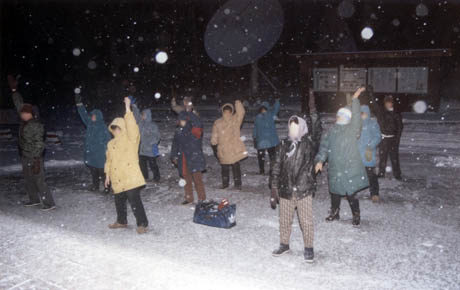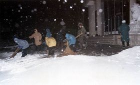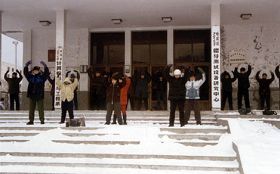 晨炼从早四点半到六点半。虽然冬天早四点多天还没有亮,还在下着雪,但学员已经早早来到这里开始打扫厚厚的积雪。 |