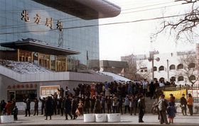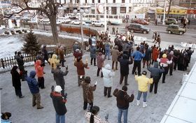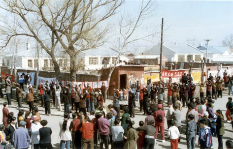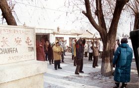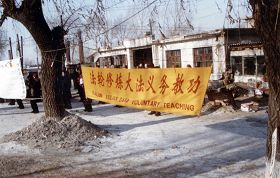 扫完雪后炼功,心情格外的舒畅,尽管天还没有亮。 | 北方剧场门外集体炼功(大约摄于一九九八年冬)这一组照片是在江北(道外区松浦镇)弘法的情况,摄于一九九九年春。 在哈尔滨市道外区松浦镇弘法(摄于一九九九年春) 在哈尔滨市道外区松浦镇弘法(摄于一九九九年春) |