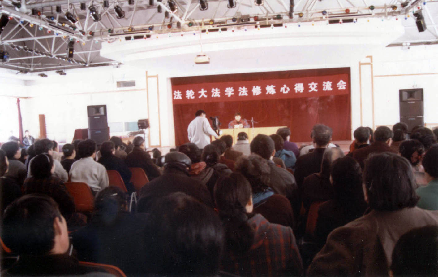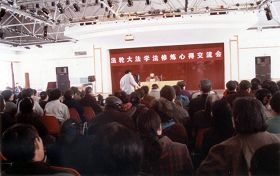 这一张照片是一九九八年在哈工大学生活动中心举办的一次修炼心得交流会,整个会场座无虚席。 |