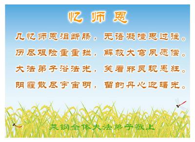 大陆大法弟子祝师尊生日快乐!剪纸 鱼蝶同行 海阔鱼儿跃:戏莲污泥不染 天高蝶儿飞:傲落腊梅寒姿翠 师父胸襟广:弟子谢师恩恭祝师尊 “世界法轮大法日”众生万物同庆 双鱼游水献寿:福祝佛恩 蝶儿远飞带去一颗赤子之心! 开化全体大法弟子祝贺师尊生日快乐!阿城大法弟子恭祝伟大慈悲的师尊生日快乐!主佛恩 苍穹欲毁众生危 主佛降临现慈悲 层层下走结法缘 众生魔难一人背 一人罪业大过山 无量众生大无边 为救众生过大劫 无尽魔难师尊还 这份恩情何以报 永恒威德写满天 今逢师尊华诞日 普天同庆五一三 弟子十四年的修炼,摔过很多跟头,犯过很多大错,师尊都没嫌弃和放弃过弟子,一直呵护着弟子,紧紧拉着弟子的手,走过了无数的魔难。弟子知道那些魔难没有师尊的承担,弟子走不到今天。现在当年的幼莲长大了,正在世间开放,救度着众生,完成着史前大愿。请师尊放心,弟子一定争取做师尊的合格弟子,圆满随师还。 二零一零年五月六日 招远市一家七位大法弟子恭祝师尊生日快乐!同庆世界法轮大法日!皖北大法弟子恭祝慈悲伟大的师尊生日快乐!蓬溪大法弟子二人祝师父生日快乐!祝贺十一届法轮大法日!师父您好!弟子精進再精進,才能完成自己的史前大愿。感谢师尊慈悲苦度。 一家三位大法弟子祝师尊生日快乐!祝世界法轮大法日的到来!弟子坚信大法,坚信师尊,做好三件事才能兑现自己的史前大愿,感谢师尊慈悲苦度。 蓬溪大法弟子夫妻同修祝师尊生日快乐!感谢师尊的慈悲苦度!蓬溪县大法弟子学法小组九人恭祝师尊生日快乐!恭祝十一届法轮大法日!尊敬的师尊您好!感谢师尊慈悲苦度。请师父放心,我们一定走好最后的路,做好三件事。完成史前大愿跟师父回家。 2010年5月3日 大陆一大法弟子学法小组祝师尊生日快乐!师尊您好!师尊辛苦了,您为弟子操尽了心,我们无以言表和报答,我们只有按照师尊的要求,学好法、努力做好三件事,在修炼的路上勇猛精進,以实际行动来感谢师尊的慈悲苦度。 2010年5月5日 巩义大法弟子在5.13世界法轮大法日来临之际向慈悲伟大的师尊表示节日问好!祝师父生日快乐!修在自己,功在师父,师父是弟子的根本。永远感恩师尊,跟随师尊在这乱世救度世人是我们的荣幸。 大陆巩义大法弟子 2010年5月6日 汤原县一学法组全体大法弟子敬祝慈悲伟大的师尊生日快乐! 同祝法轮大法洪传十八周年!大陆大法弟子恭祝师尊生日快乐!谢师恩 中原大地, 大法洪传, 佛恩浩荡, 度吾归岸。 跪谢师恩, 跪谢师恩。 恩师圣诞, 弟子齐颂, 师尊生日快乐, 师尊生日快乐。 廉江市全体大法弟子向师尊问好!祝师尊生日快乐!庆全球法轮大法日!师尊苦度多艰辛 弟子实修报师恩 密云全体大法弟子恭祝慈悲伟大的师尊生日快乐!涿州全体大法弟子恭祝慈悲伟大的师父生日快乐暨世界法轮大法日十一周年!师父生日到 众神喜相告 鲜花说先来 鞭炮最早到 瓜果乐开口 蛋糕把脸笑 锣鼓言第一 蜡烛嘻嘻笑 师父生日到 春天来报到 太阳早早起 月亮不迟到 风把信儿传 水把四海叫 雷说我开道 电说同时到 夏秋冬不语 时间偷偷笑 师父生日到 弟子心里笑 你比救人多 他(她)比执着少 你说除恶多 他(她)说邪恶少 都是为法来 只怨成果少 师父生日到 众生齐来到 苍穹换新衣 乾坤最美好 你谢主佛救 他(她)把洪恩报 万事万物齐 普天法光照 涿州全体大法弟子恭祝师父生日快乐! 二零一零年五月七日 加格达奇大法弟子祝师父生日快乐!汤原一家庭资料点及家属向慈悲伟大的师尊恭祝师尊生日快乐!同祝世界法轮大法日!在最后的时间里清醒、理智、正念正行走好最好的路,广救众生。 弟子跪拜敬上 二零零二年五月五日 曲周县全体大法弟子向慈悲伟大的师尊问好!并恭祝师尊生日快乐!曲周县全体大法弟子在法轮大法日来临之际感谢师尊传法之恩,我们是正法时期的大法弟子,随师正法是真修弟子无不珍惜的机缘。精進实修,溶于法中,做好师尊交代的三件事。 二零一零年五月五日 大陆大法弟子恭祝慈悲伟大的师尊生日快乐!恭祝师尊传法十八周年及世界法轮大法日!中国大陆诸城全体大法弟子恭祝慈悲伟大的师父五十九周年华诞!庆祝十一届世界法轮大法日!广州大法弟子恭祝师尊华诞暨世界法轮大法日!富拉尔基区大法弟子及弟子全家敬贺全球“五•一三”法轮大法日!大陆大法弟子恭祝师尊华诞!庆祝世界法轮大法日!梅里斯区全体大法弟子恭祝师尊生日快乐!同祝世界法轮大法日!抚順大法弟子恭祝慈悲伟大的师尊生日快乐!安岳县全体大法弟子祝师尊生日快乐!林省大安市全体大法弟子祝师尊生日快乐!迎“世界法轮大法日”的到来!做好三件事,请师尊放心!辛集市全体大法弟子恭贺慈悲伟大的师尊华诞!师尊生日快乐!祝贺法轮大法洪传十八周年!美国明尼苏达大法弟子全家恭祝尊师父生日快乐!感谢师尊的慈悲苦度!并庆祝法轮大法日!全体金山屯区大法弟子恭祝伟大师尊生日快乐!苍宇洪大师造就 大法洪传全世界 造就亿万法徒心 信师信法正法路 法徒功成众生望 甘谷县全体大法弟子恭祝慈悲伟大的师尊生日快乐!同庆世界法轮大法日!在正法的最后时刻,我们甘谷县全体大法弟子在学好法的基础上,尽全力做好三件事,兑现自己的史前誓约,一定走正走好最后的路。 武昌大法弟子祝师尊生日快乐!迎春地区八五四农场大法弟子恭祝伟大师尊生日快