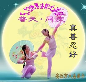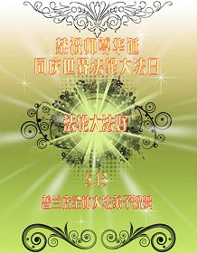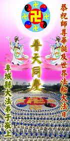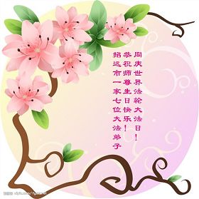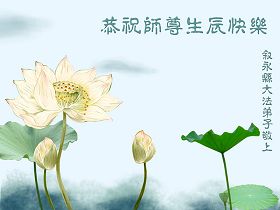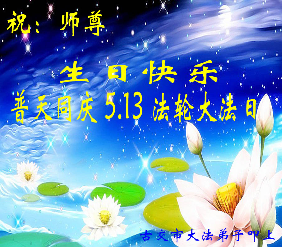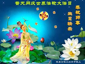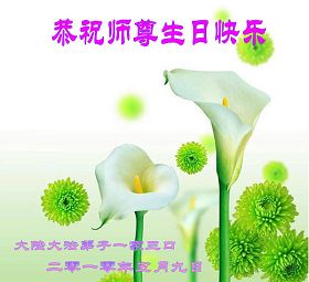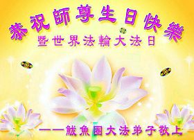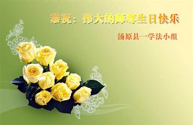 大陆三位大法弟子祝师父生日快乐!弟子一定听师父的话,永远跟着师父,正念正行,做好三件事。 大陆大法弟子恭祝师尊生日快乐!尊敬的师尊您好!感恩师尊在末法末劫时期给了众生一次得救的机会,在庆祝世界法轮大法日的同时,恭祝师尊生日快乐!万语千言难表师尊的救度之恩,唯有同化大法,做好大法弟子应该做好的一切。 叶家埠片大法弟子恭祝师尊生日快乐!师尊慈悲正苍宇, 历经万难救众生。 众生得救把师盼, 希望早日见师面。 祝师生日添笑容, 弟子紧跟志不移。 众徒协调顺师愿, 法正人间全宇新。 巩义全体大法弟子祝慈悲伟大的师尊生日快乐!师尊威德满苍宇,我们用尽人间的语言也难以表达对师尊的感激与谢意,但我们还是想向师尊说一声:师父!您辛苦了!祝您生日快乐!再次对师尊表示感谢!叩头! 蔚县、涿鹿县全体大法弟子恭祝师尊五十九华诞暨大法洪传十八周年!十八年前,恩师将洪大的佛法传于天上人间,宇宙开始了亘古未有的新纪元。冬去春来、万物归新,我们一定不忘师尊谆谆教诲,更加成熟理智,勇猛精進,做好三件事,不负师恩,救度更多众生,完成我们的史前大愿。 大陆大法弟子一家二十口人恭贺师父五十九华诞!我们家有三人是在七二零以前得法修炼的;其余十七人现在都知道法轮功真相,并退出了中共邪*党-,其中有几人现也开始学炼法轮功了。大法的超常,我们都有亲身体会,都是受益者,“法轮大法好”、“真善忍好”、“师父好”,是我们的心里话。能学炼法轮功的人真是太幸运了。虽然我们学法炼功有先有后,但我们都会珍惜这万古难得的机缘。 绥中县全体大法弟子庆祝五一三世界法轮大法日!恭祝慈悲伟大的师尊五十九华诞!内蒙鄂伦春旗全体大法弟子恭祝慈悲伟大的师尊生日快乐!恭贺世界法轮大法日!盖州大法弟子恭祝师尊生日快乐!请师尊放心,弟子一定要修好自己,同化大法,做好三件。让师尊少一份操劳,多一份欣慰。 平庄全体大法弟子恭祝慈悲伟大的师尊生日快乐!庆祝五月十三日世界法轮大法日!我们一定珍惜师尊给我们延长来的有限时间,抓紧抢人救人,兑现史前誓约。 联合收学法小组祝慈悲伟大的师尊生日快乐!慈悲伟大的师尊一次次扶起跌倒的弟子,弟子一定做到向内找,修好自己,跟上正法進程,做好三件事。 七家子、古榆树大法弟子向慈悲伟大的师父问好!祝师父生日快乐!我们一定要做好三件事, 不辜负师父的期望, 跟上师父正法的進程。七家子和古榆树全体大法弟子叩拜恩师! 二零一零年五月十一日 砀山县全体大法弟子祝师尊生日快乐!砀山母女四同修祝师尊生日快乐!栖霞大法弟子恭祝师尊生日快乐!新田全体大法弟子恭祝师尊生日快乐!桦川县全体大法弟子恭祝师尊生日快乐!庆祝世界法轮大法日!新乐全体大法弟子恭祝慈悲伟大的师尊生日快乐!中国大陆大法弟子祝贺师尊生日快乐!青州市全体大法弟子恭祝师尊生日快乐!大陆母子二人同修祝师尊生日快乐!普天同庆法轮大法日!新立矿家庭学法小组恭祝师尊华诞暨世界法轮大法日!大法弟子淑琴祝师尊生日快乐!河间大法弟子恭祝师尊五十九华诞!同贺世界法轮大法日!武安全体大法弟子祝愿慈悲伟大的师尊生日快乐!国家电网大法弟子祝慈悲伟大的师尊生日快乐!普天同庆法轮大法日!