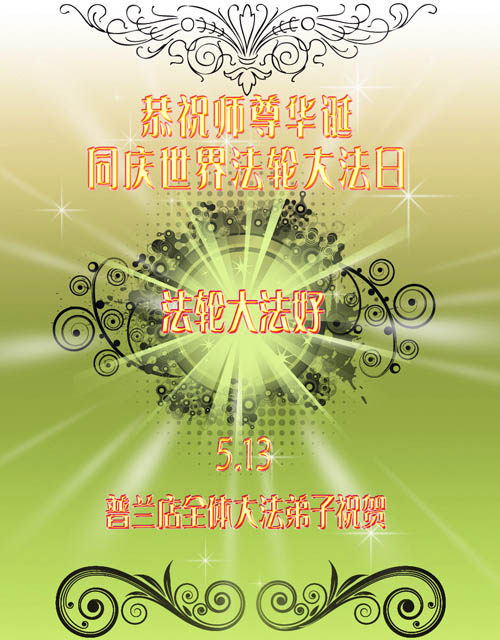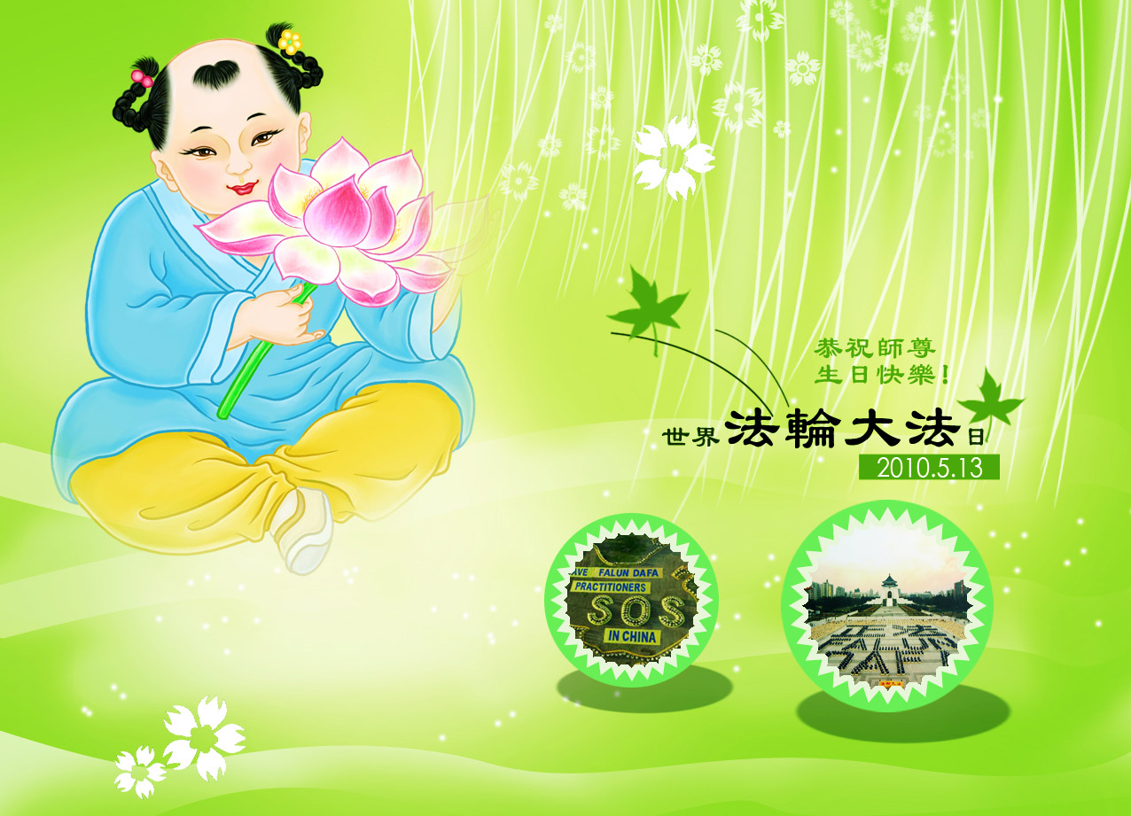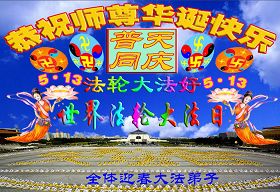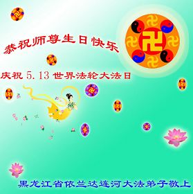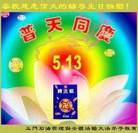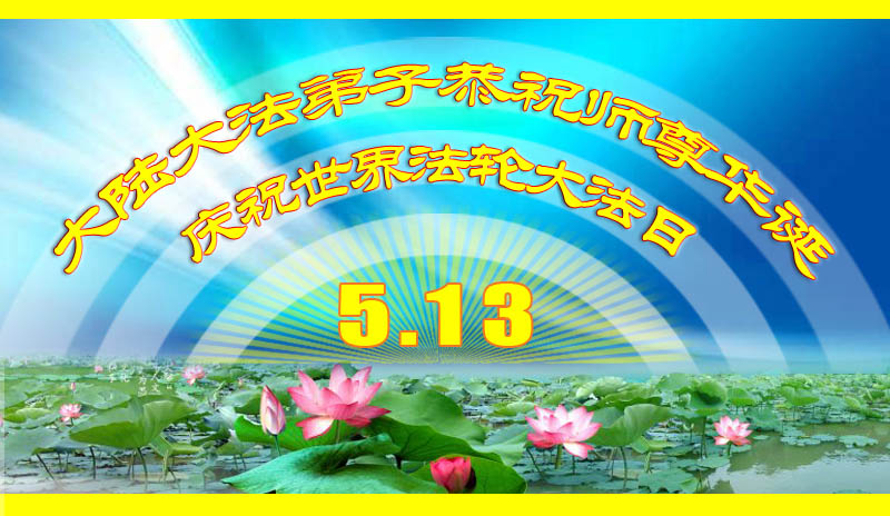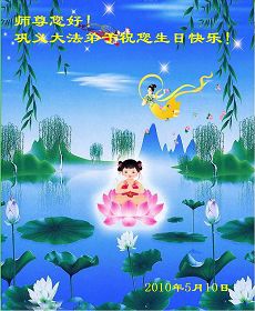 【明慧网二零一零年五月十三日】5月13日是世界法轮大法日。继昨日发表的,今天是中国大陆东北逾200地区、华东逾210地区、华中100地区、华北逾200地区、华南80地区、西南120地区、其它各类850地区、军队、司法系统大法弟子,被中共非法关押的大法弟子,以及明真相的世人,通过明慧网发给李洪志师父和“5.13”世界法轮大法日的祝贺、贺卡。以下是明慧编辑部已整理出来的中国大陆各地部份大法弟子来信逾200封汇编:舒永县大法弟子恭祝师尊生日快乐!莱阳大法弟子恭祝慈悲伟大的师尊华诞暨世界法轮大法日!莱钢全体大法弟子恭祝师尊生日快乐!大陆一家三口大法弟子恭祝伟大师尊生日快乐!阜城县大法弟子恭祝师尊华诞暨世界法轮大法日!中国大陆鲅鱼圈大法弟子恭祝师尊生日快乐!