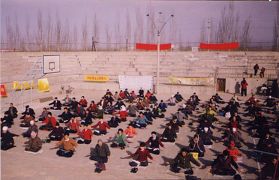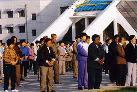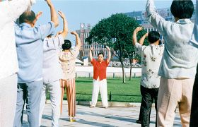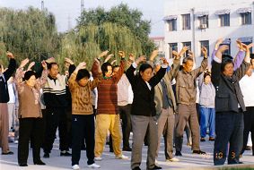 九九年前河北省唐山市法轮功学员炼功场景。在一个小山坡上,十几名法轮功学员正在祥和的炼功。他们都是法轮功的受益者。其中三位以前有严重的心脏病,一人体内有一块钢板,还有一人是肝硬化晚期患者。他们通过学炼法轮功,身体完全康复了。他们按照法轮功“真善忍”的要求做好人,义务承担了该小区活动站的卫生,人们由衷地感到:法轮功学员的境界真高! |