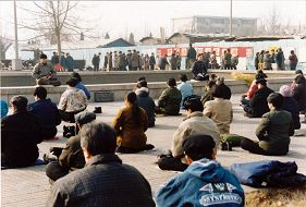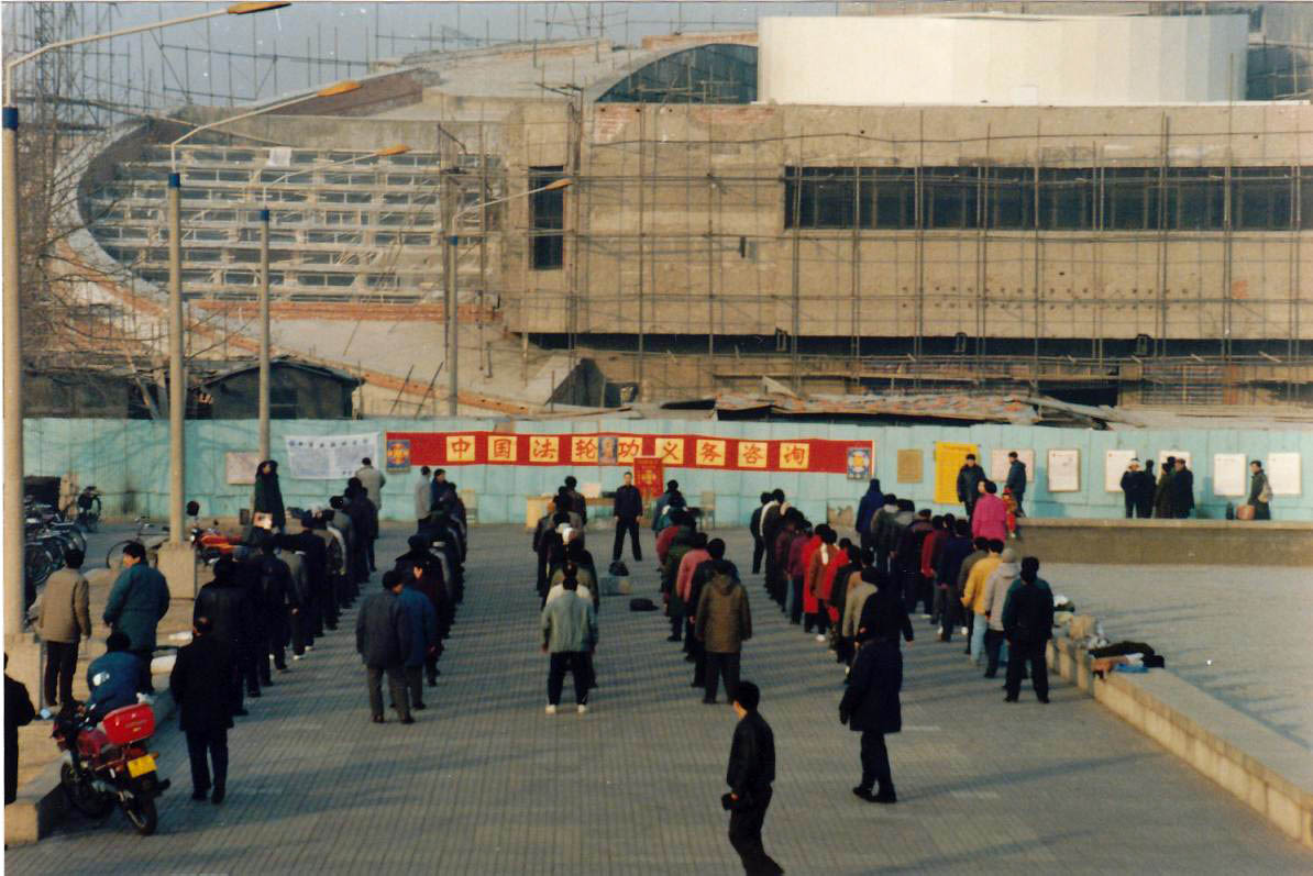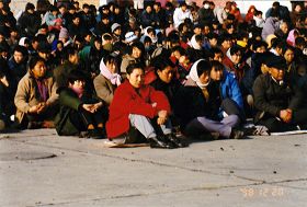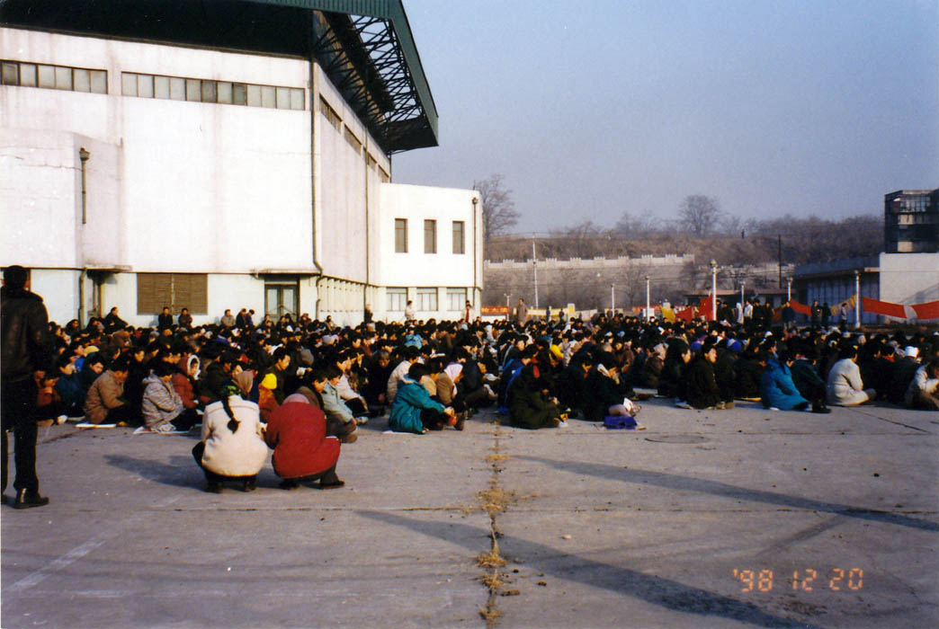 1998年在唐山开滦体育馆召开法会,这是场外参加法会的法轮功学员。