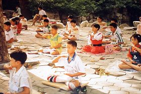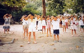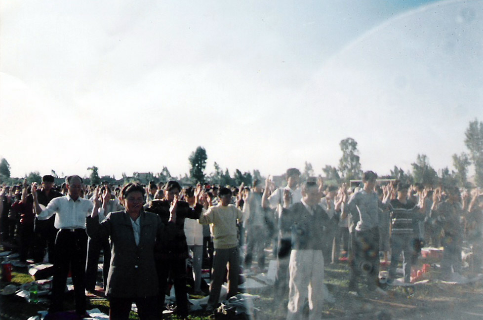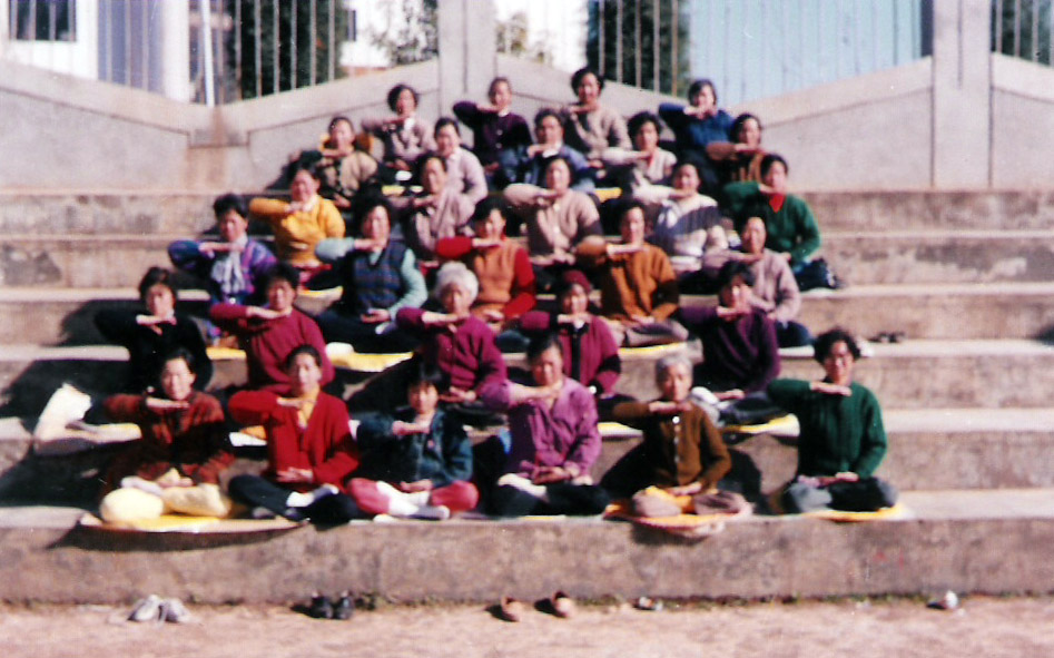 1997年5月,河南省社旗县部份大法弟子在坐落在县城里的“山陕会馆”里面开完交流会后的集体炼功场面。