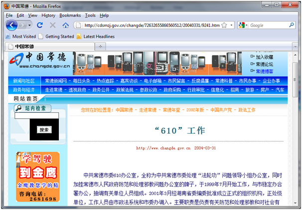 由于“610”的保密性,内部许多细节还不为外界所知。虽然“610”办公室能在早期的新闻报道中见到,但并不见于中共中央一级公开的文件、正式的法律文件和政府文件。下面是湖南省常德市政府网站截图,从中可看出,常德市“610”办公室从1999年7月“开始工作”,但到2001年3月才被正式批准成立。  湖南省常德市政府网站截图(网络截图) |